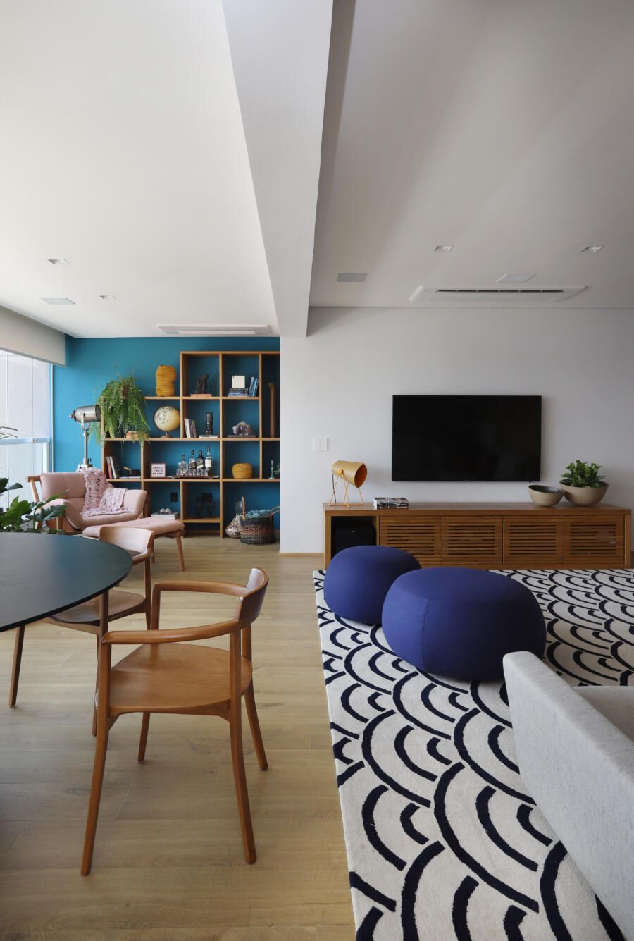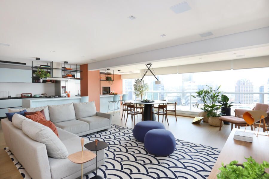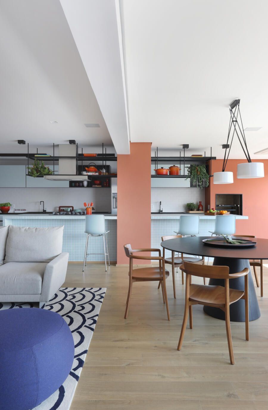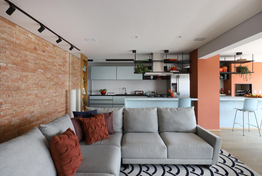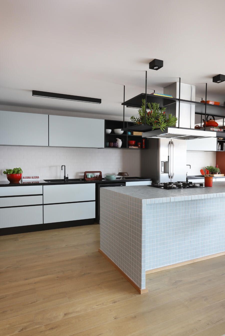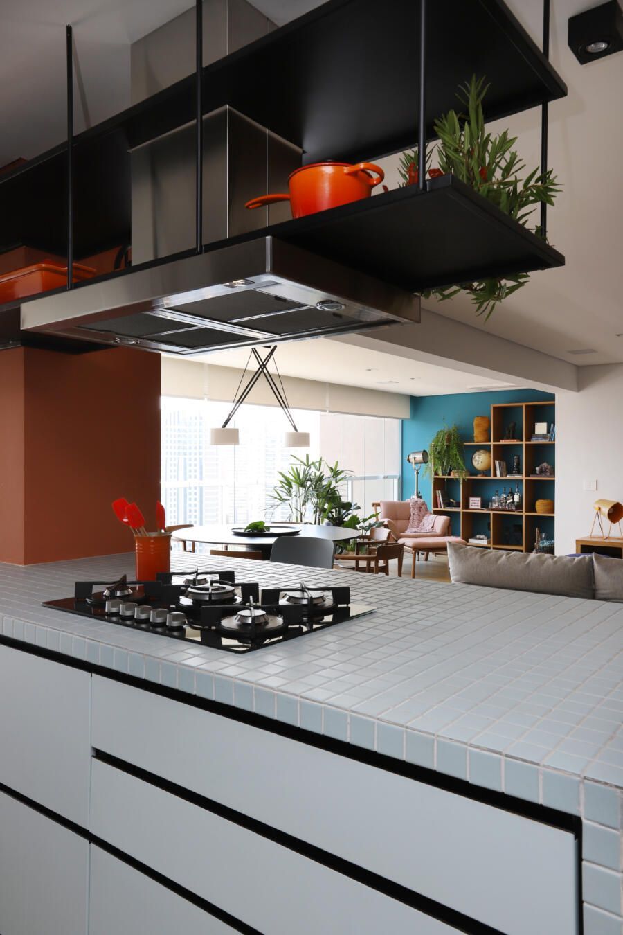 “Acredito que o grande diferencial foi abrir tudo e integrar sala, cozinha e terraço. Essa conexão foi feita através de um super balcão todo revestido com pastilha azul clara. Acredito que trazer essa união dos ambientes com apenas 1 elemento foi bem interessante.”