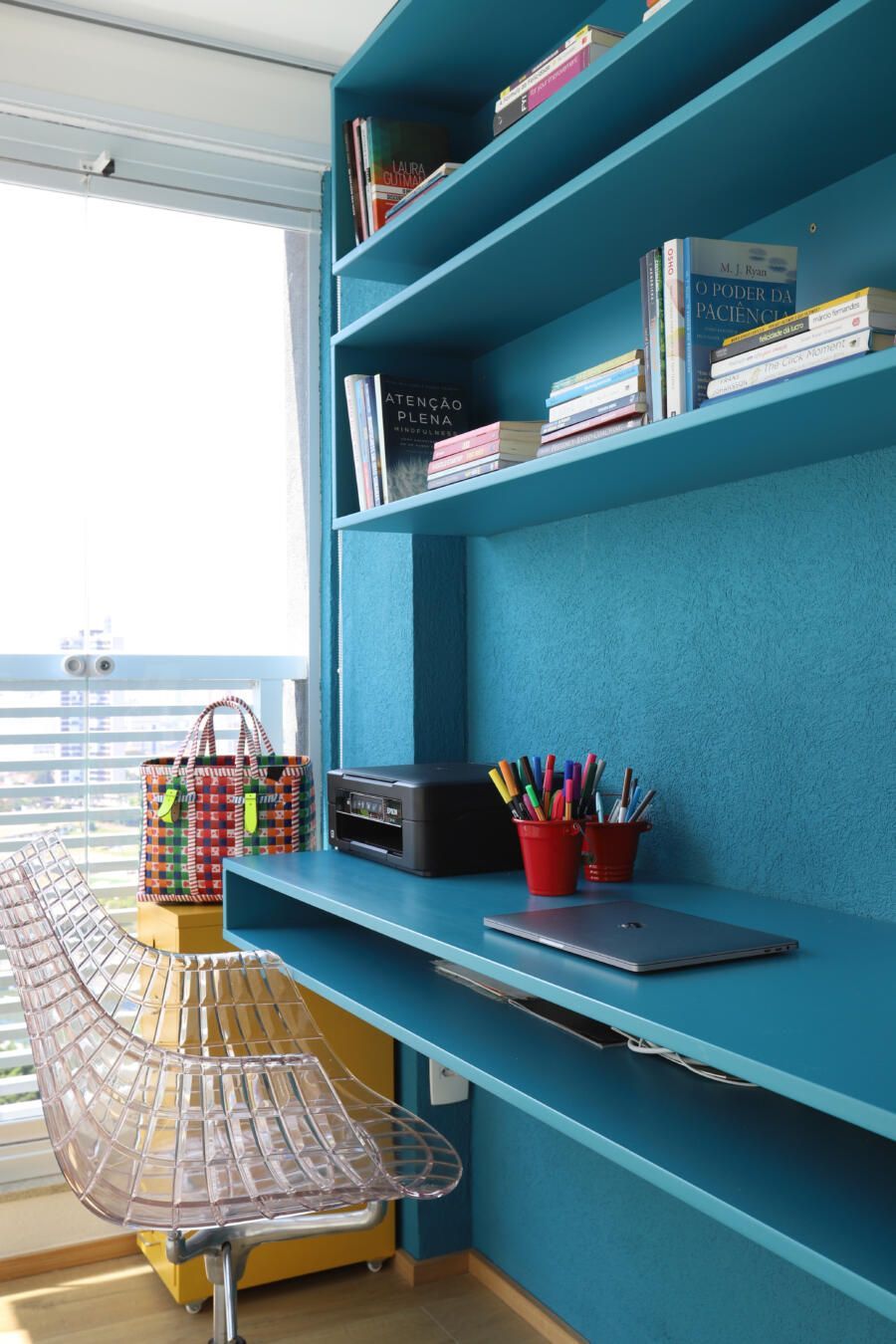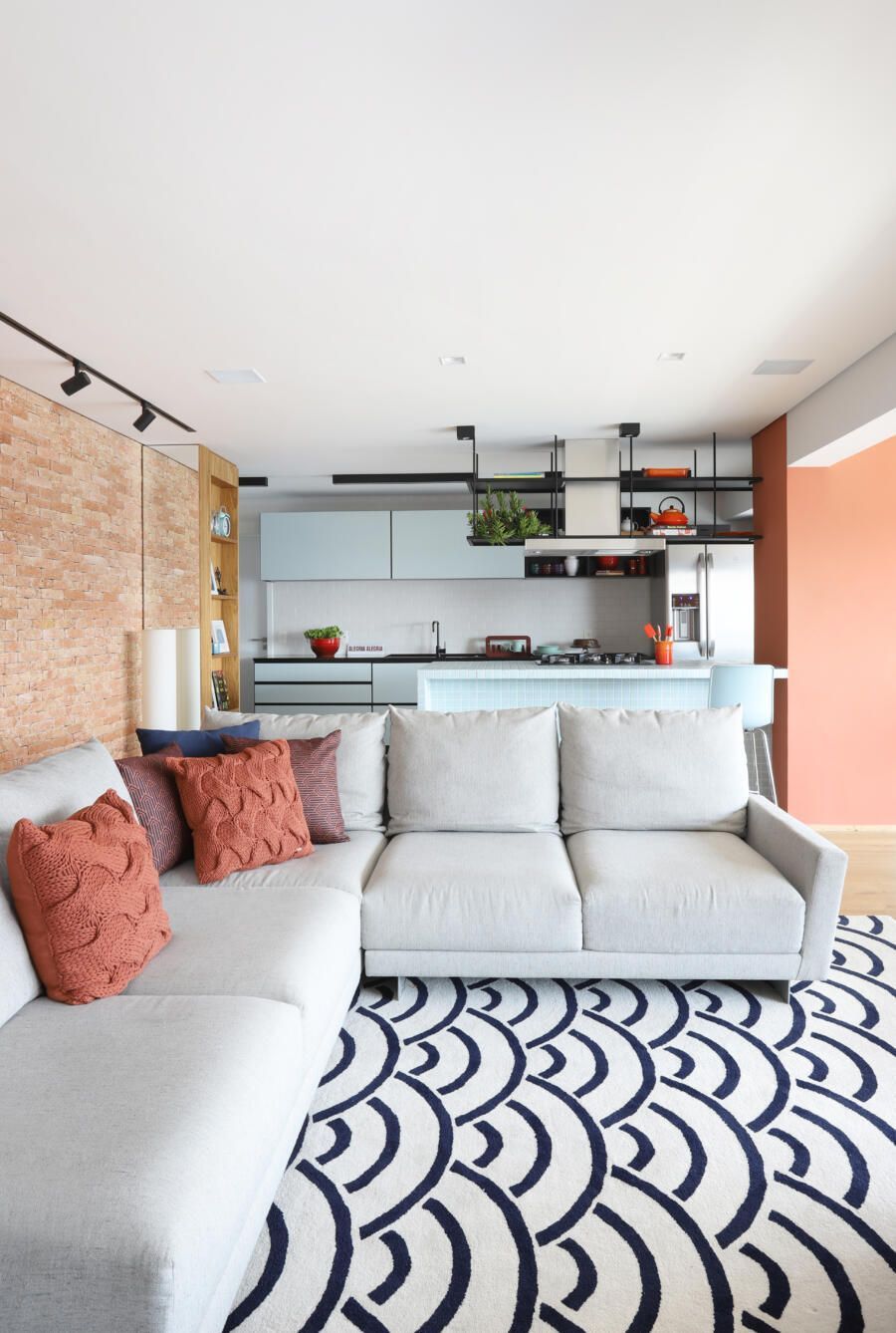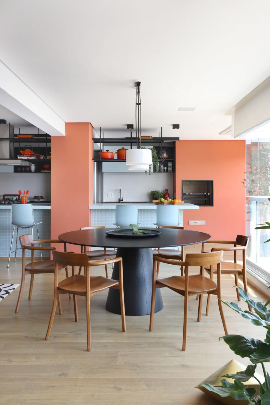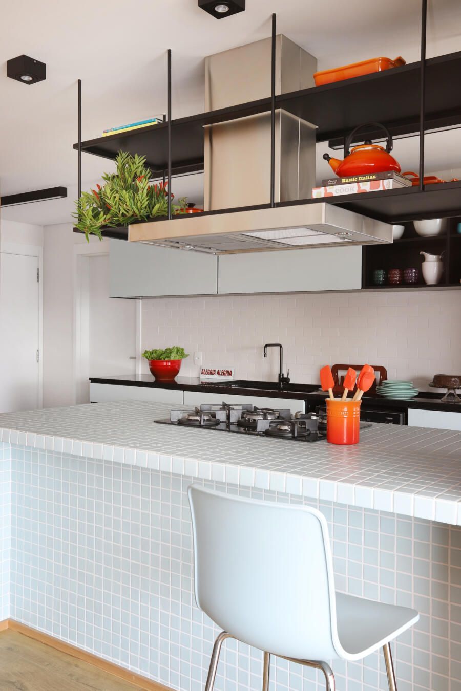 “Acredito que o grande diferencial foi abrir tudo e integrar sala, cozinha e terraço. Essa conexão foi feita através de um super balcão todo revestido com pastilha azul clara. Acredito que trazer essa união dos ambientes com apenas 1 elemento foi bem interessante.”