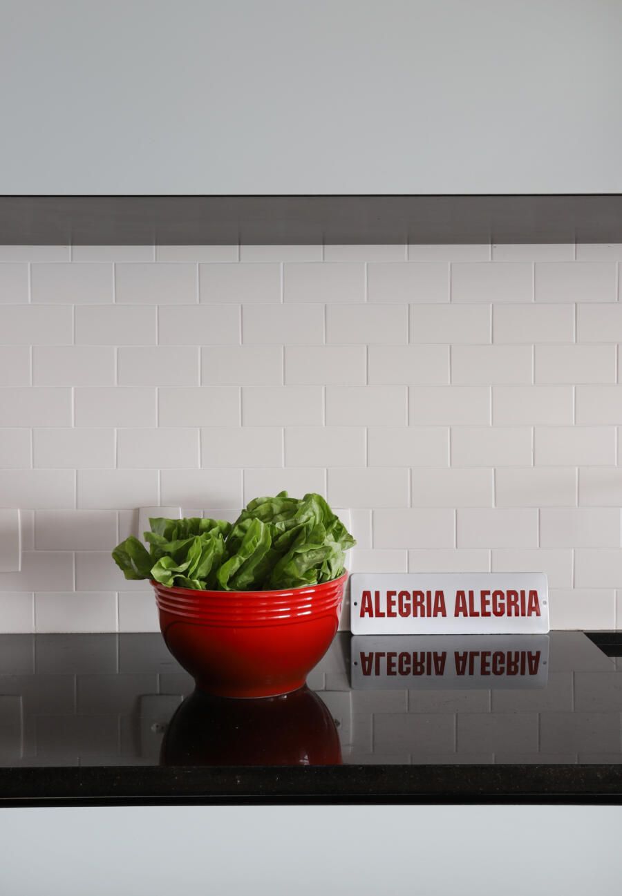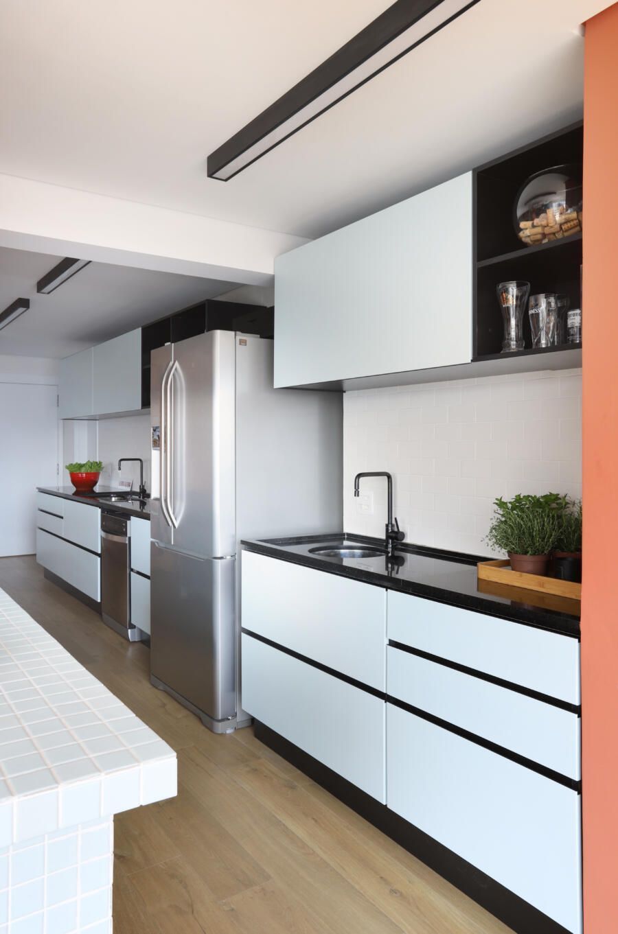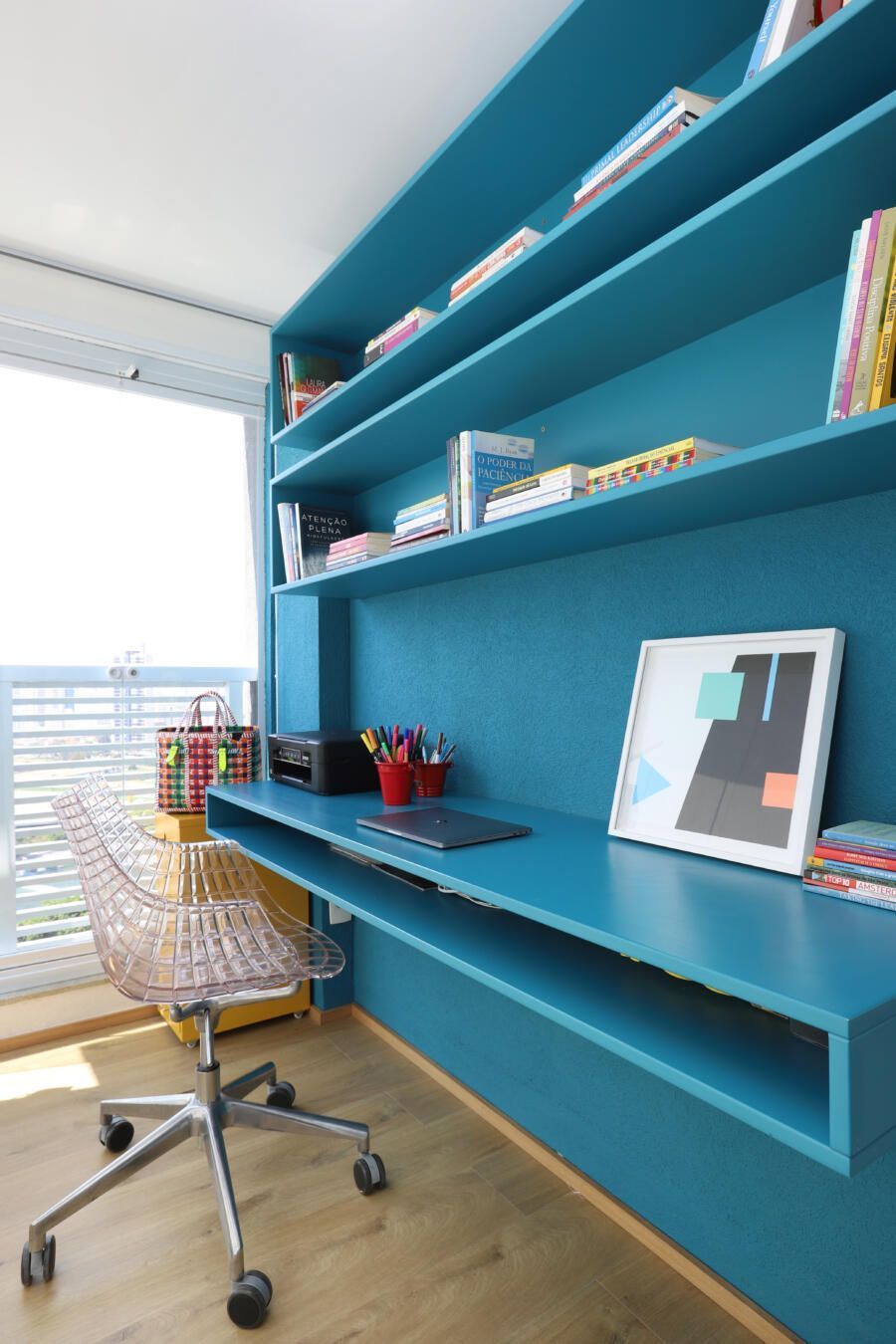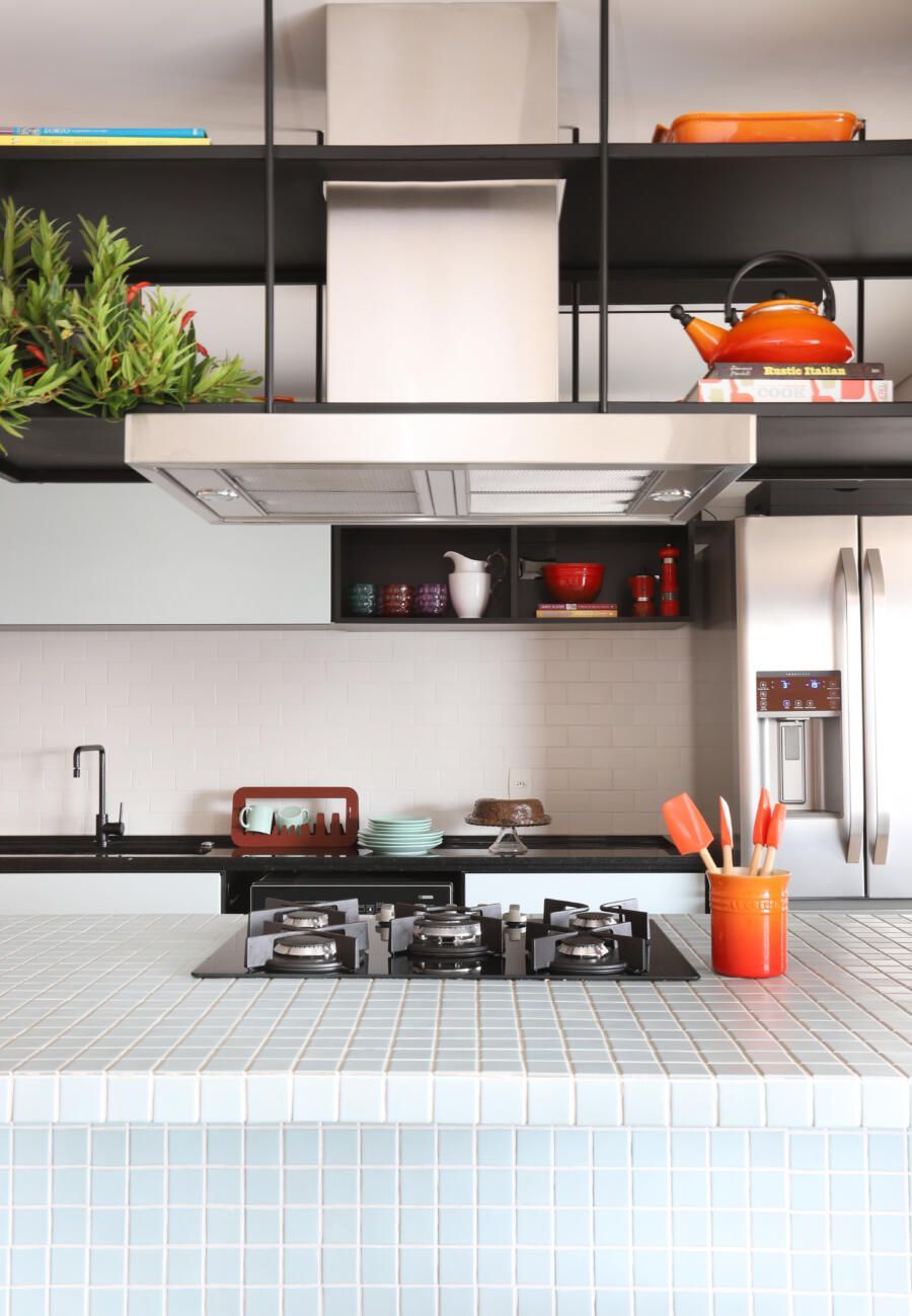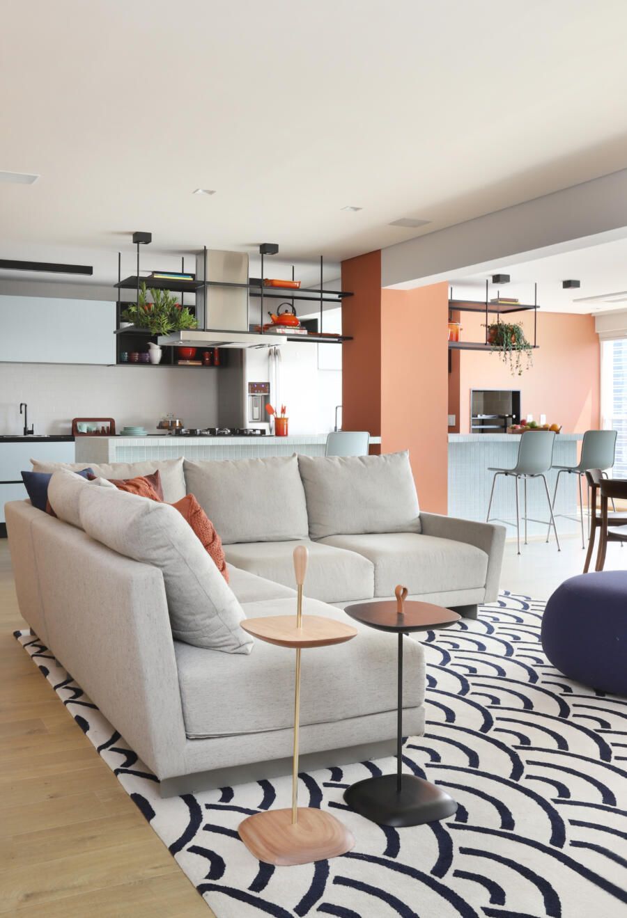 “Acredito que o grande diferencial foi abrir tudo e integrar sala, cozinha e terraço. Essa conexão foi feita através de um super balcão todo revestido com pastilha azul clara. Acredito que trazer essa união dos ambientes com apenas 1 elemento foi bem interessante.”