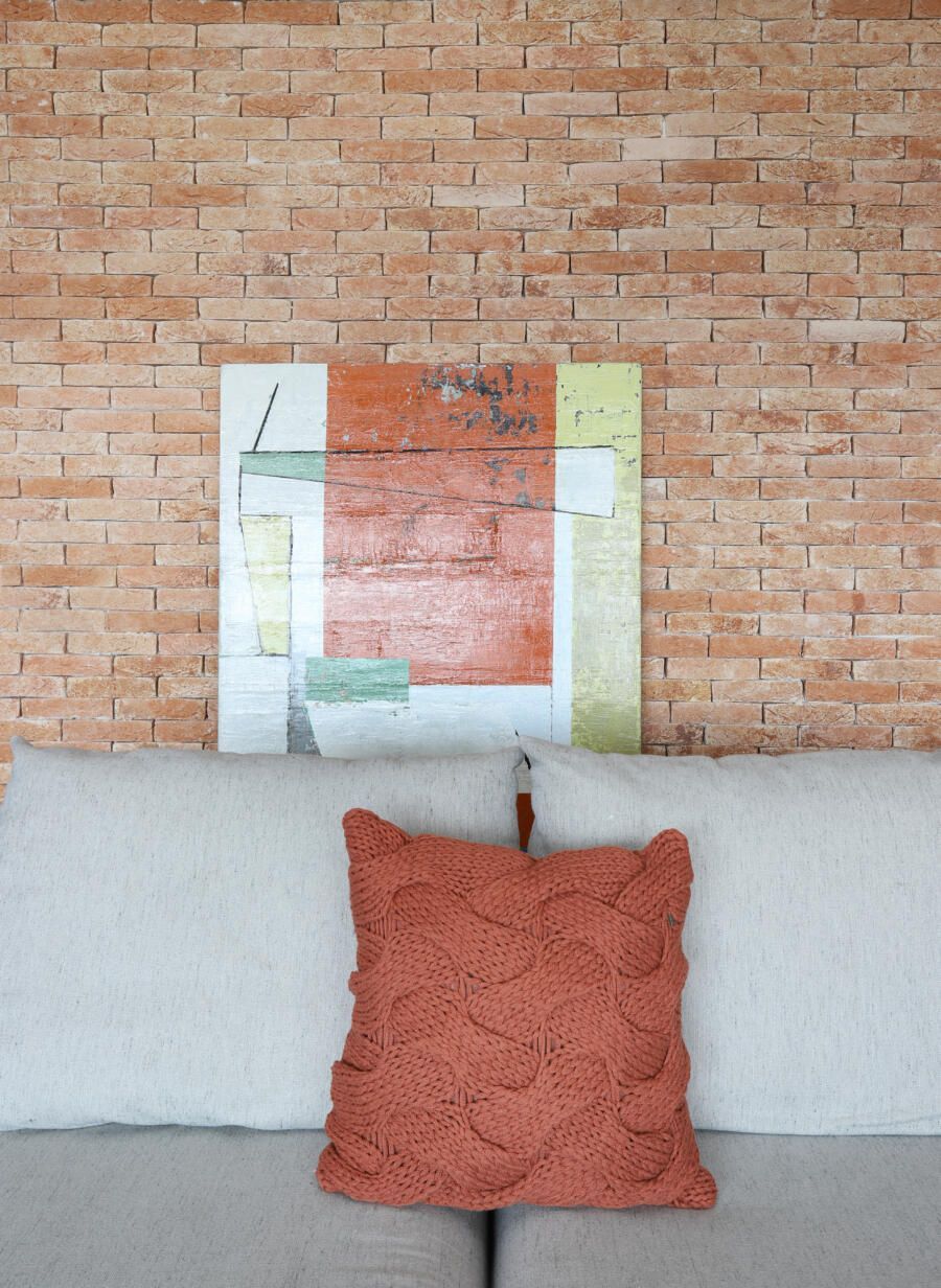 Apartamento com móveis coloridos, detalhes industriais e madeira