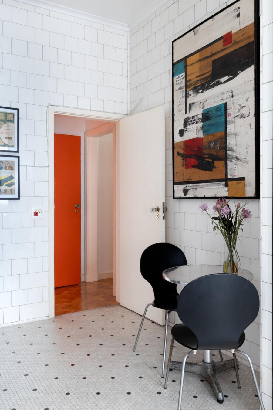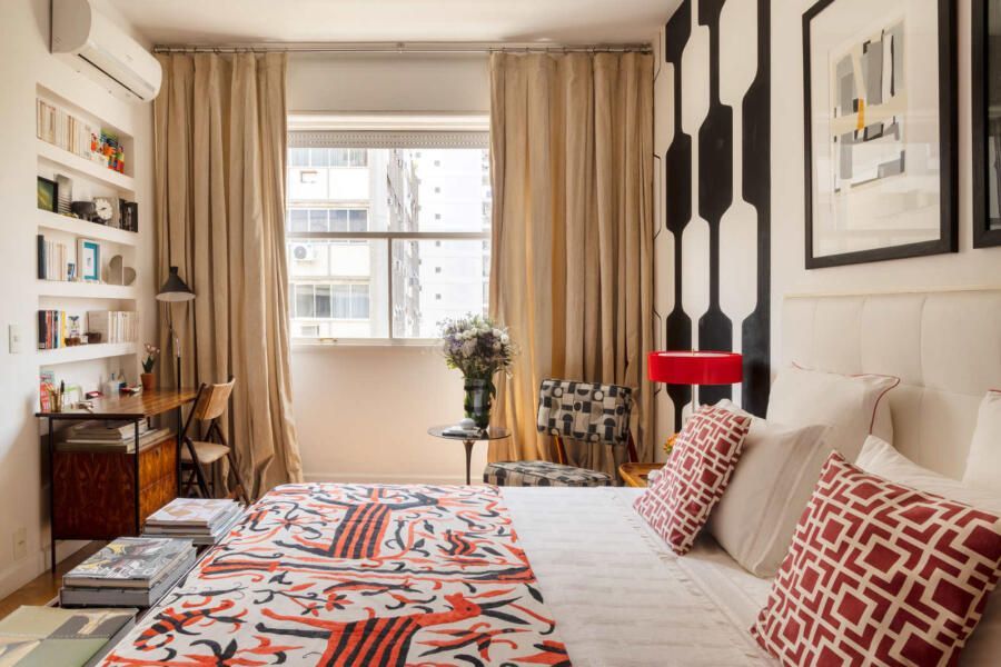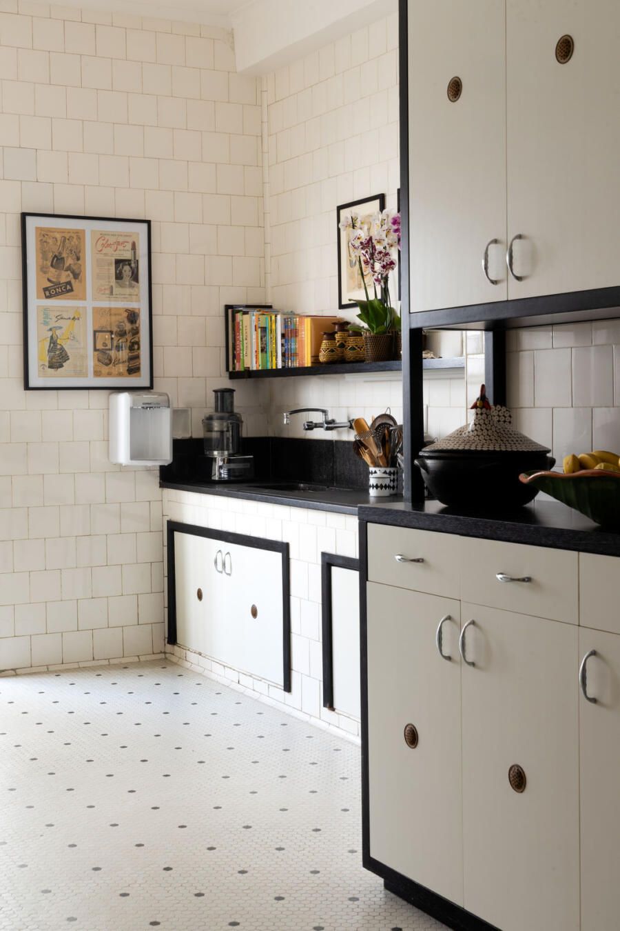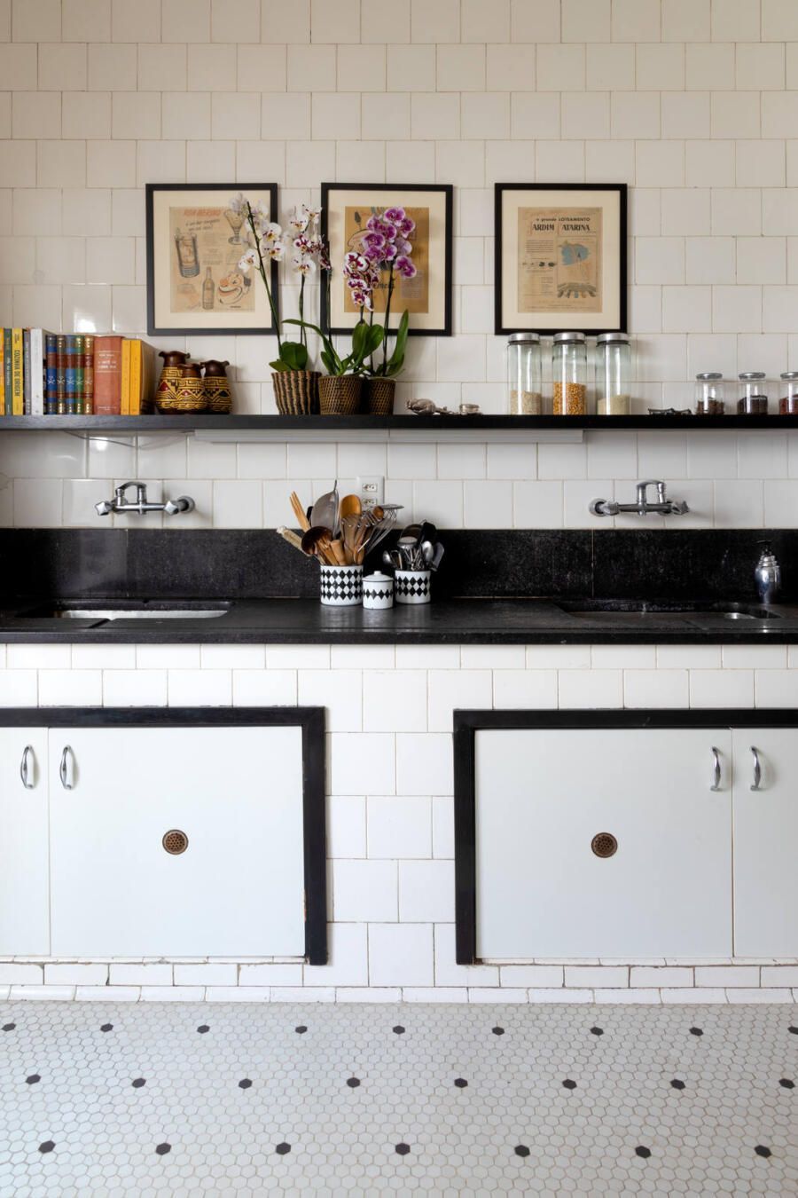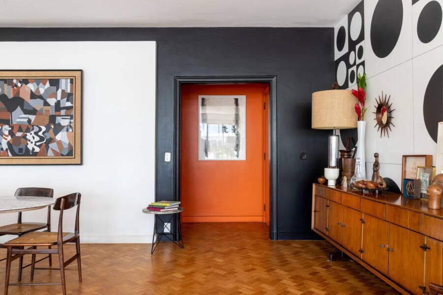“Criamos uma parede de drywall na sala para fazer uma estante que comportasse os quadros e esculturas, transformando assim o ambiente em uma galeria de arte. No quarto de hóspedes a estante de madeira foi feita sob medida e na cozinha mantivemos móveis e cerâmicas antigas, adaptando peças novas a mesma pegada retrô em preto e branco.”