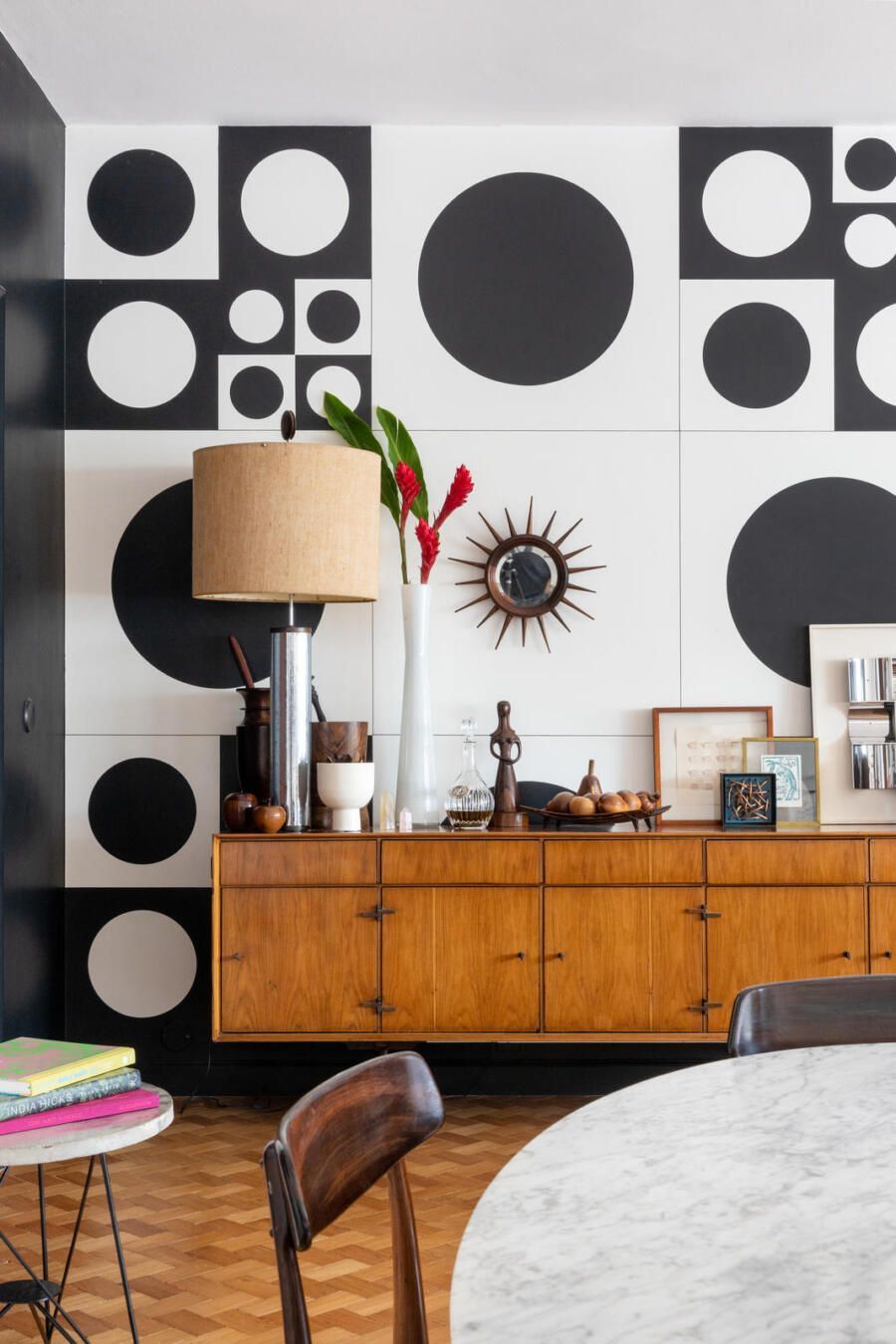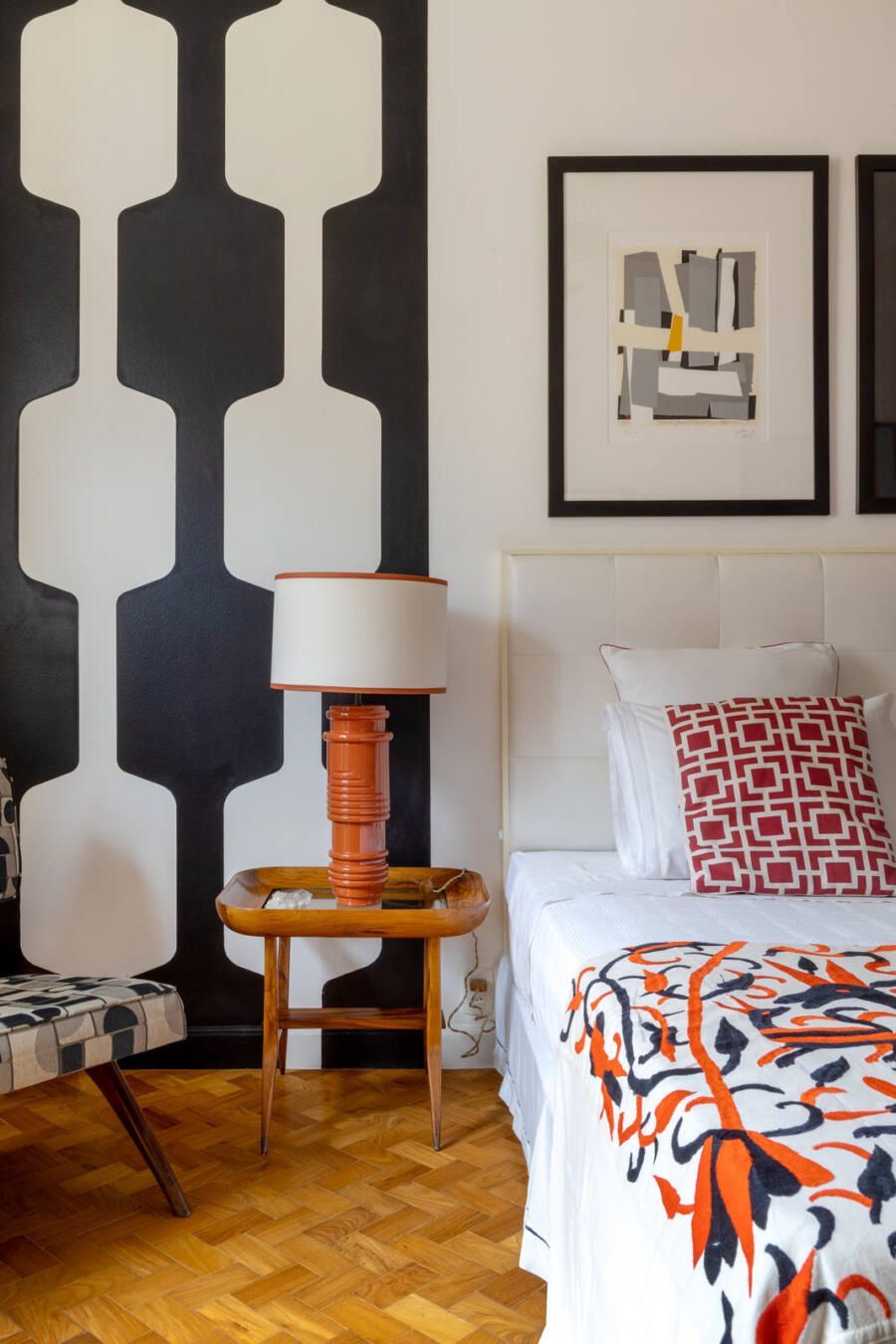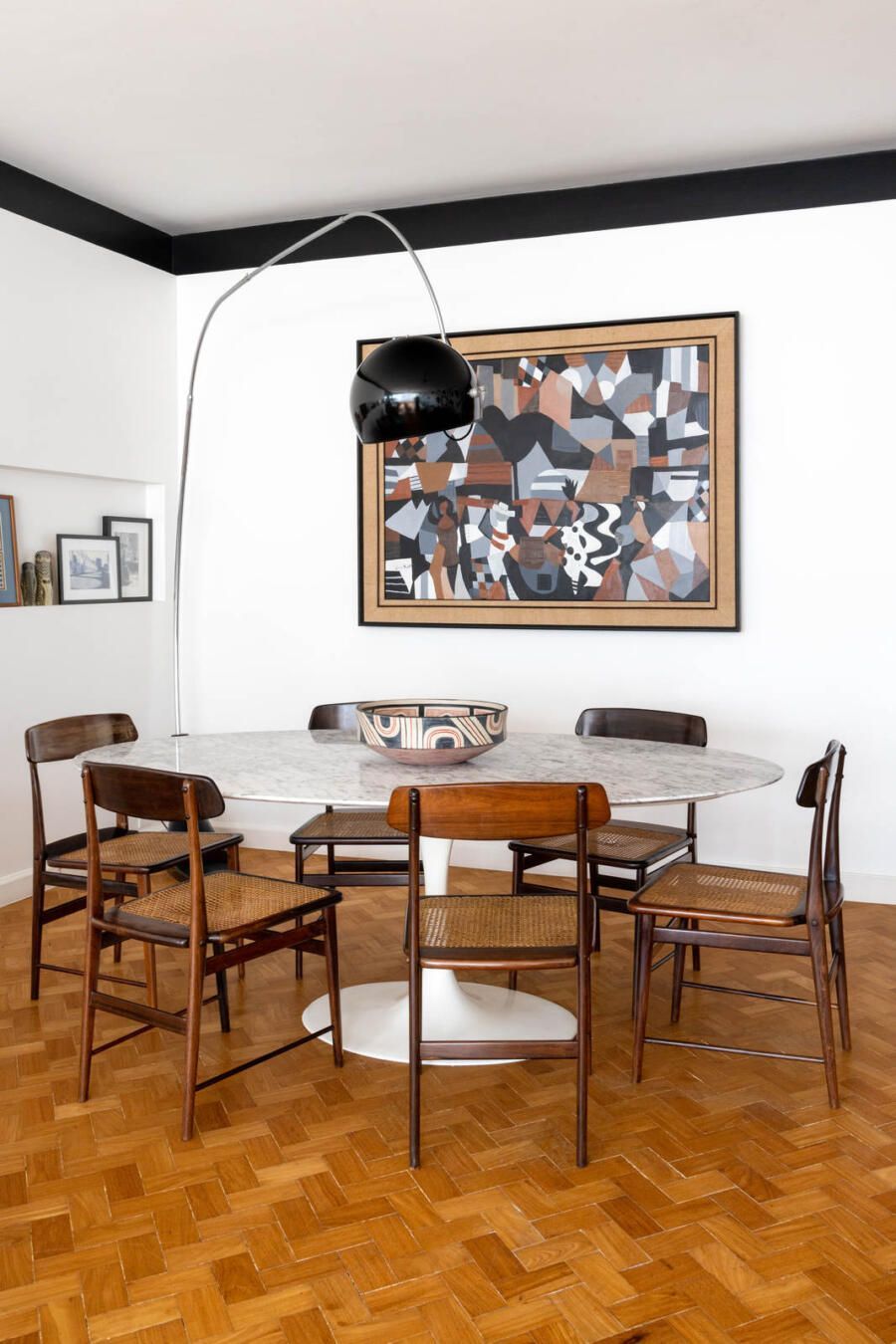 “Criamos uma parede de drywall na sala para fazer uma estante que comportasse os quadros e esculturas, transformando assim o ambiente em uma galeria de arte. No quarto de hóspedes a estante de madeira foi feita sob medida e na cozinha mantivemos móveis e cerâmicas antigas, adaptando peças novas a mesma pegada retrô em preto e branco.”