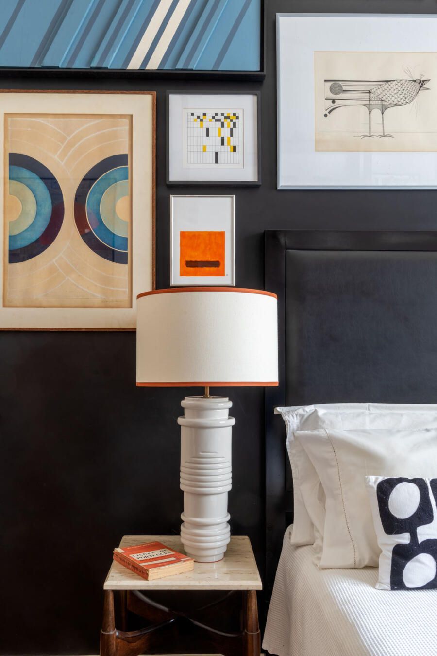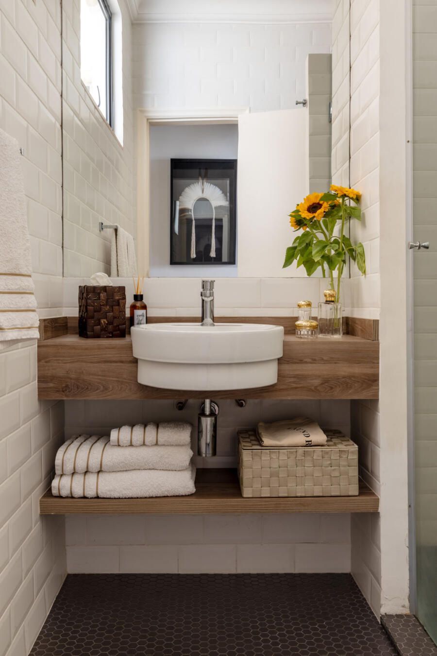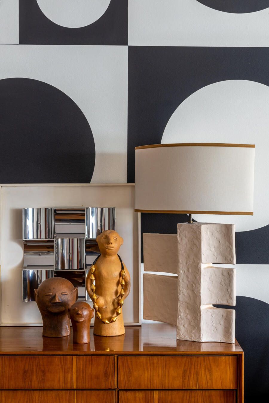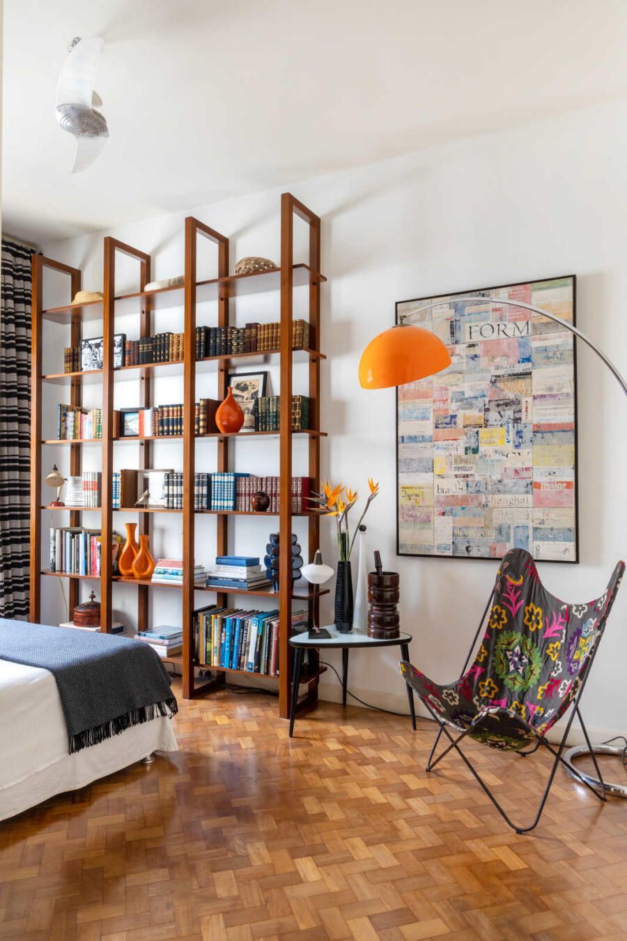 “Criamos uma parede de drywall na sala para fazer uma estante que comportasse os quadros e esculturas, transformando assim o ambiente em uma galeria de arte. No quarto de hóspedes a estante de madeira foi feita sob medida e na cozinha mantivemos móveis e cerâmicas antigas, adaptando peças novas a mesma pegada retrô em preto e branco.”