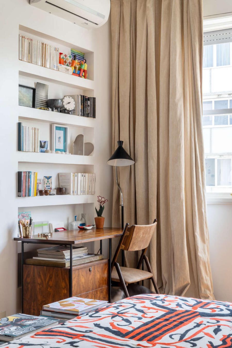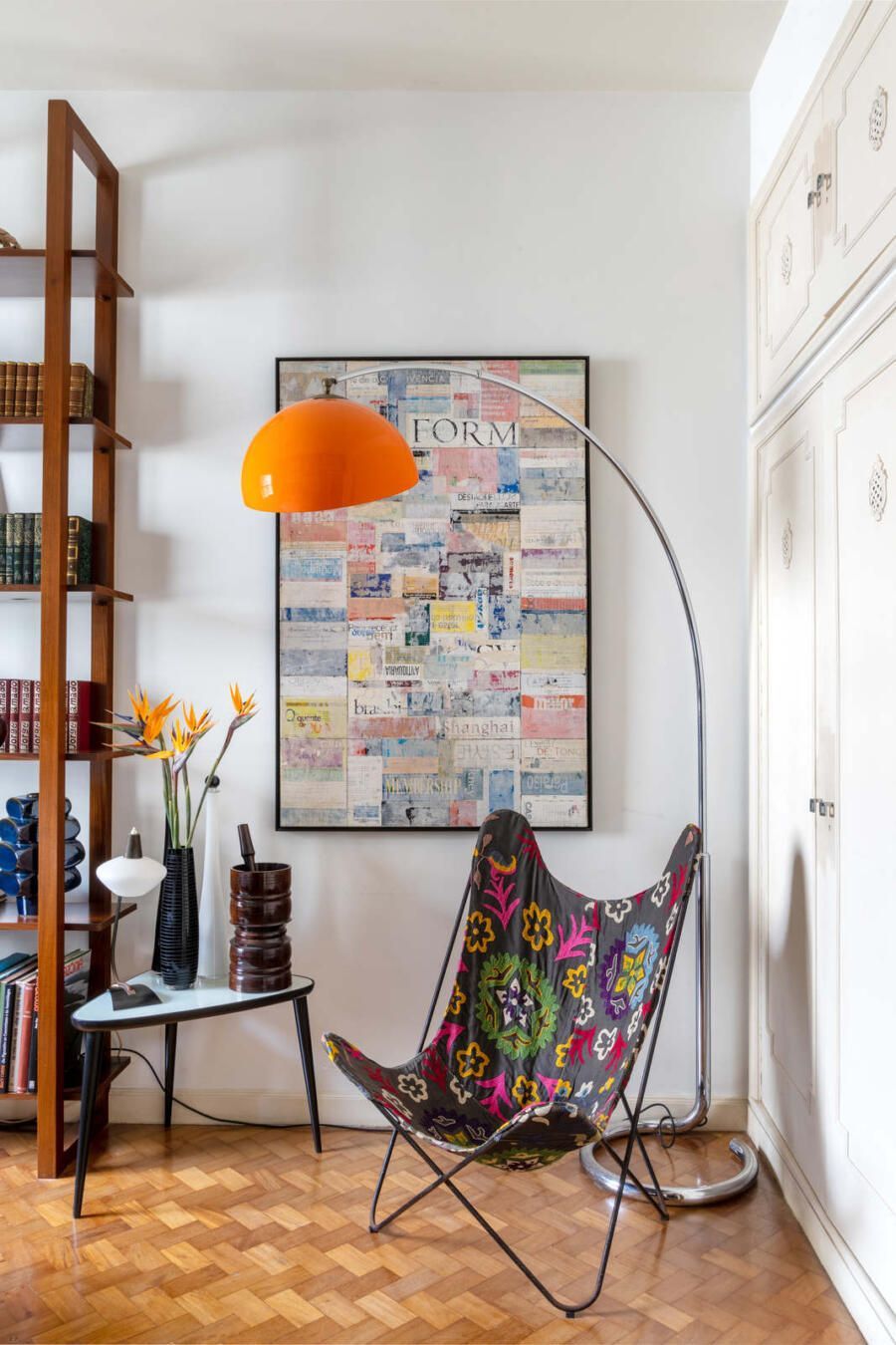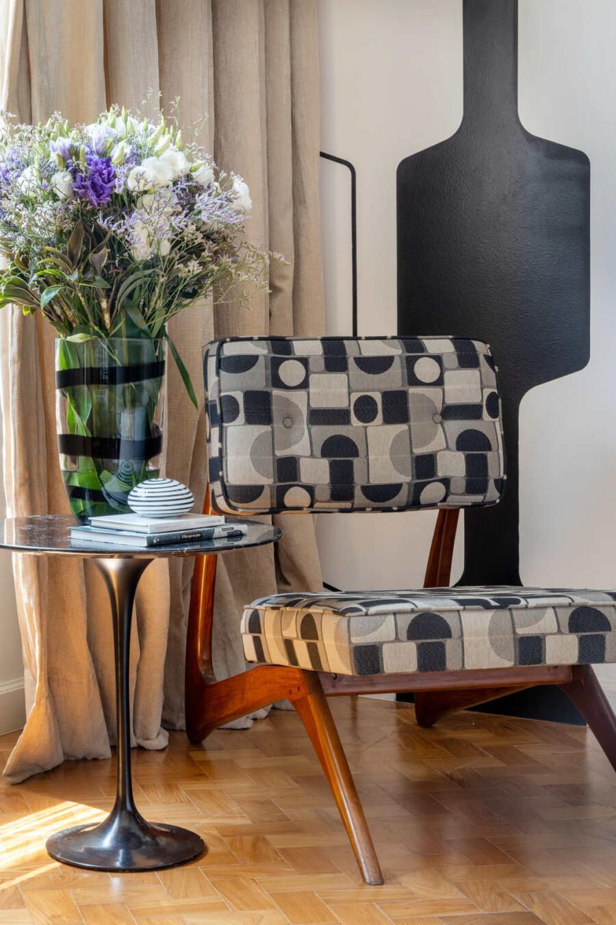 “Moro no apartamento há 8 anos e ele está desde o começo em constante evolução. Como o imóvel tem uma arquitetura marcante das décadas de 1960 e 1950, eu e meu namorado Laurent, que também é arquiteto e designer de interiores, optamos por manter a maioria de suas características, principalmente em termos estruturais, mas trazendo um conforto moderno.”