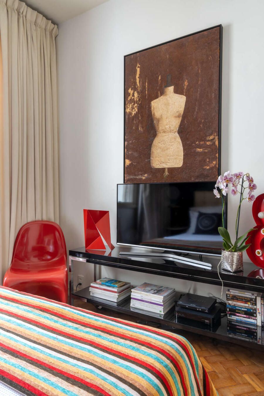 “Acho interessante ter peças pelas quais você é apaixonado, e para que isso aconteça não precisam ser necessariamente itens caros ou assinados. Sempre falam que eu faço misturas ousadas entre coisas simples e baratas e itens caros, mas para mim essa é a parte mais interessante da decoração: saber misturas. Até porque não é o valor que determina a beleza de um objeto. É preciso saber comprar com o coração.”
