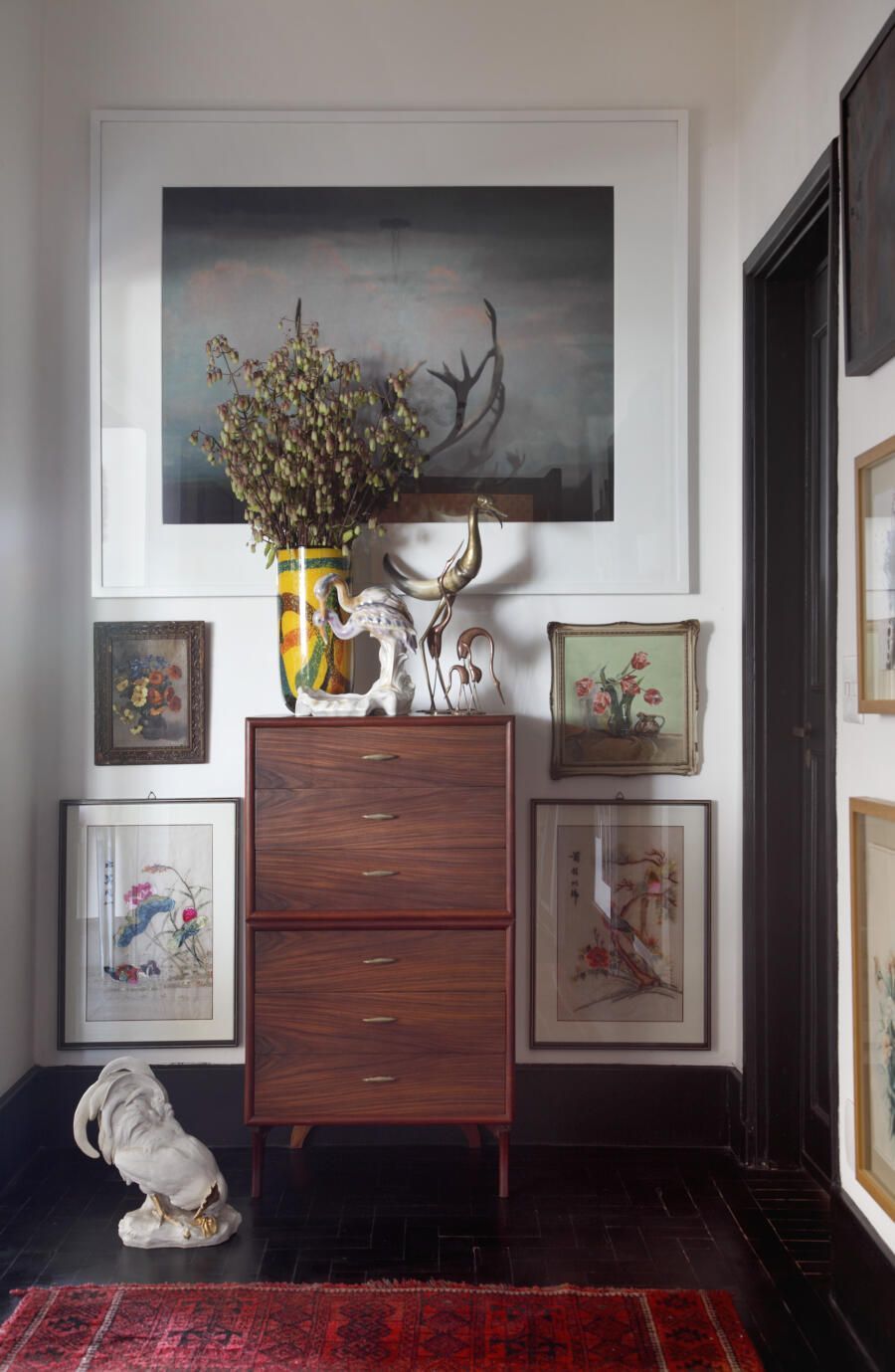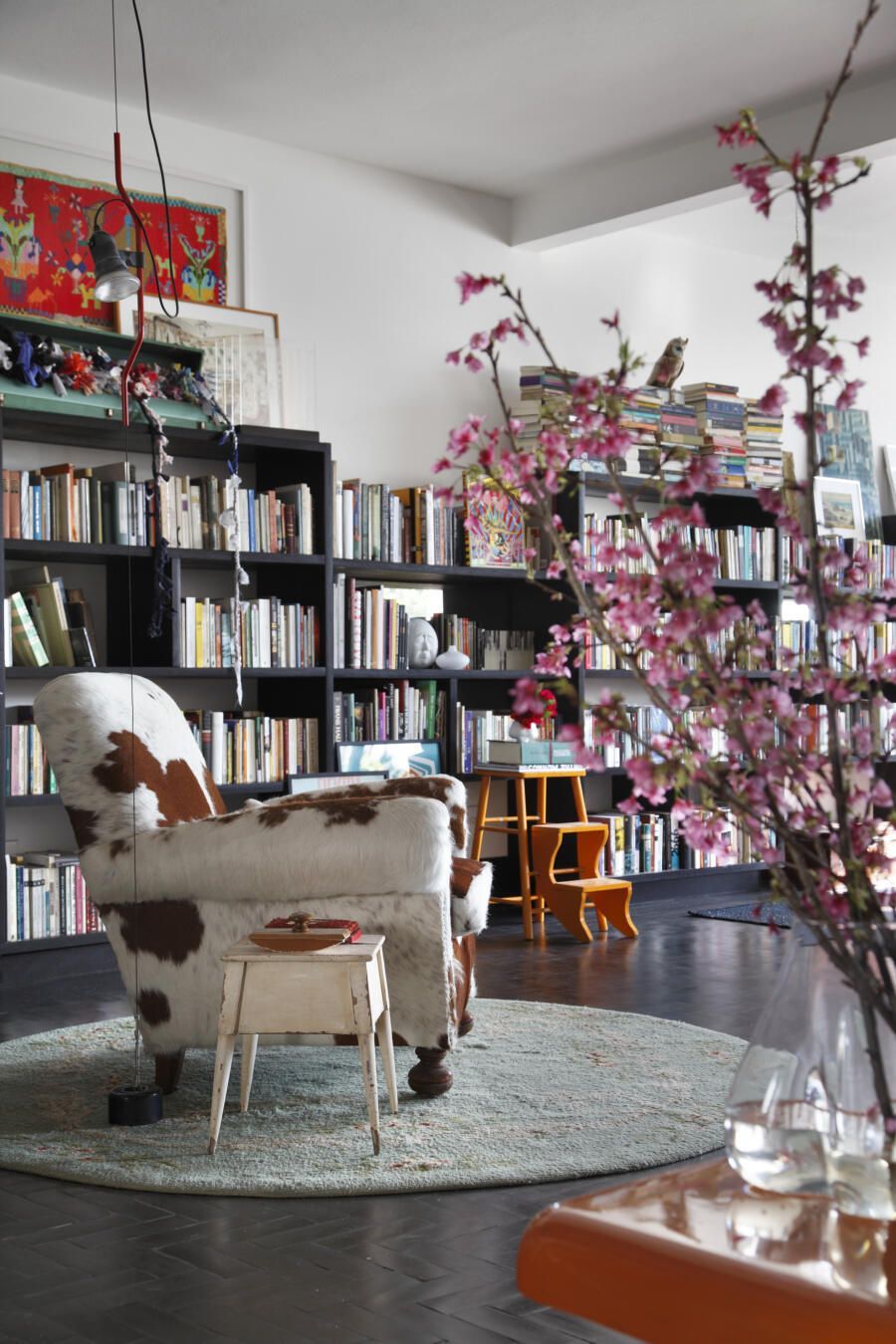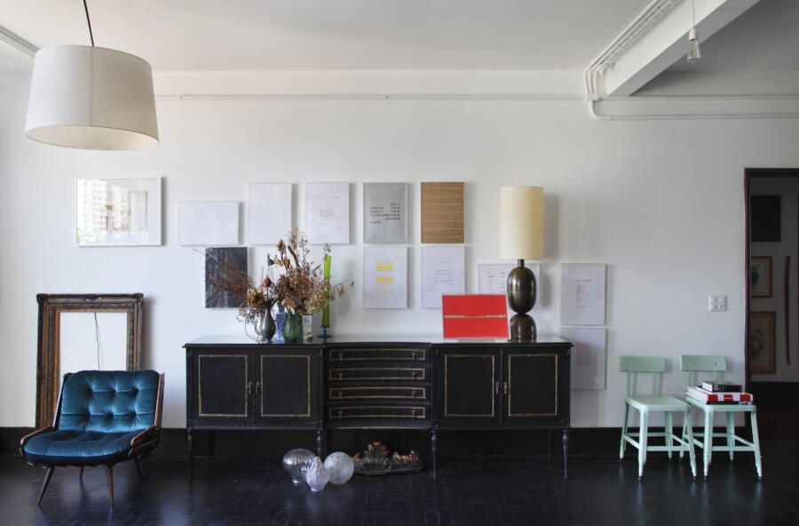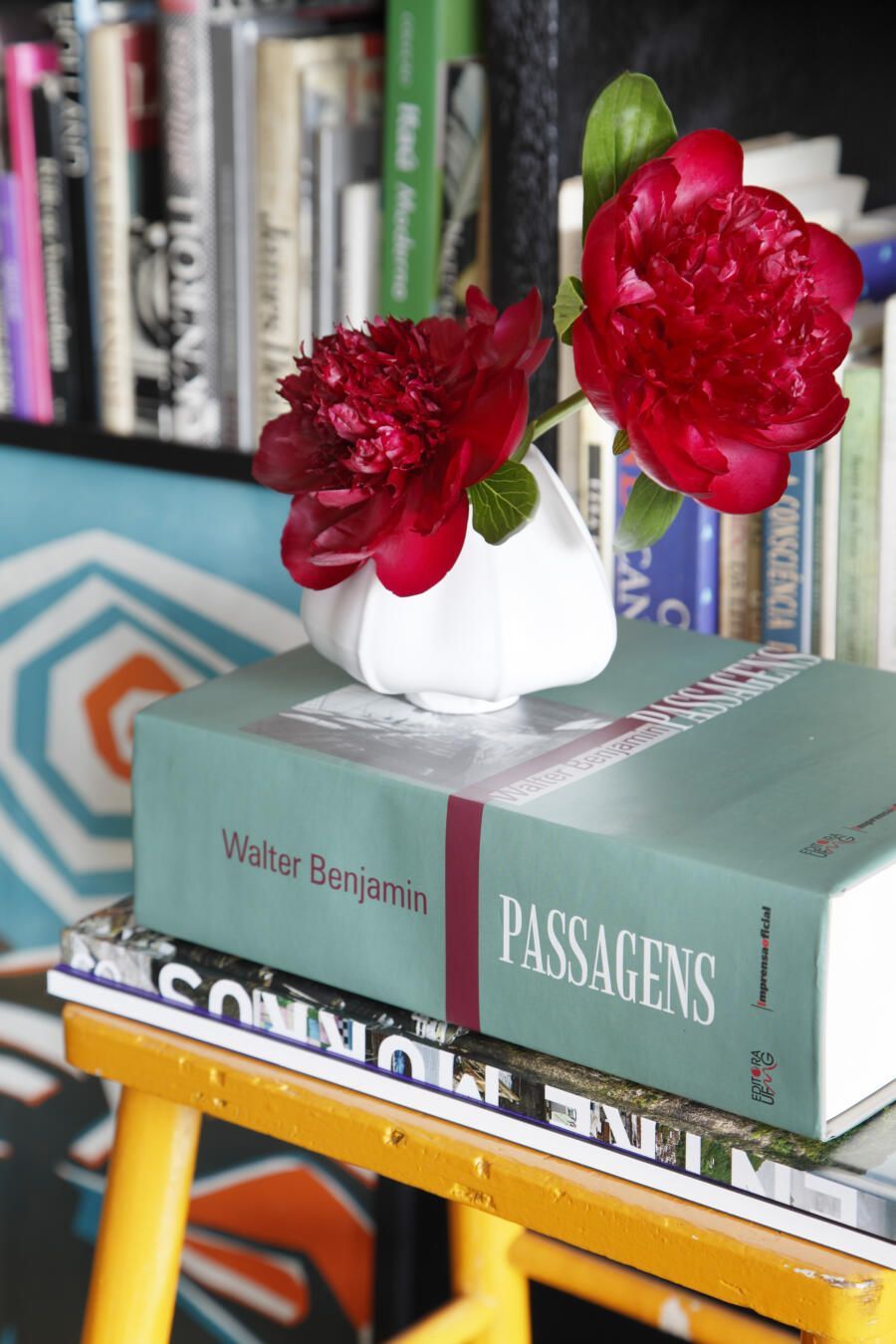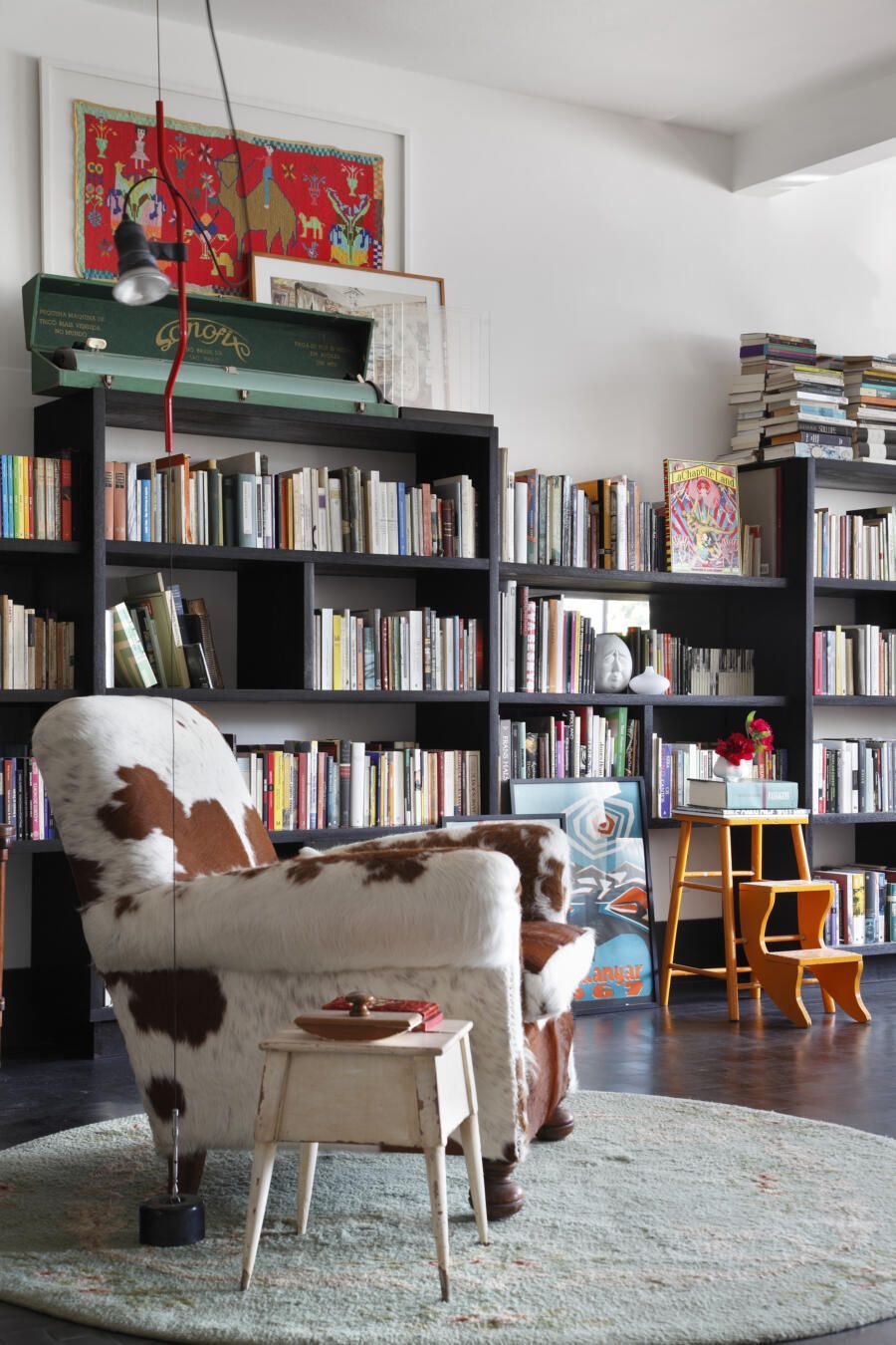 Apartamento com muitos livros e garimpos de diferentes épocas