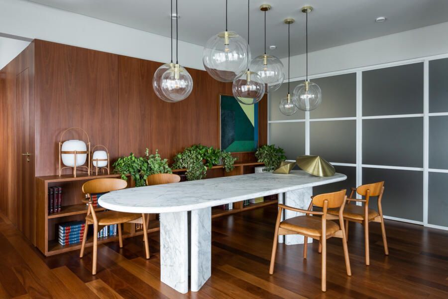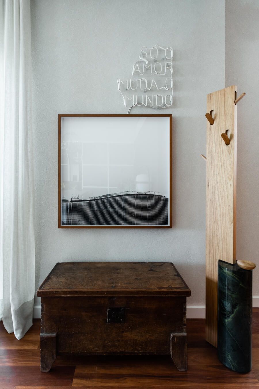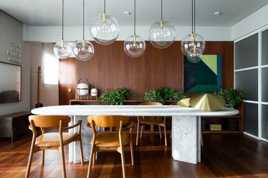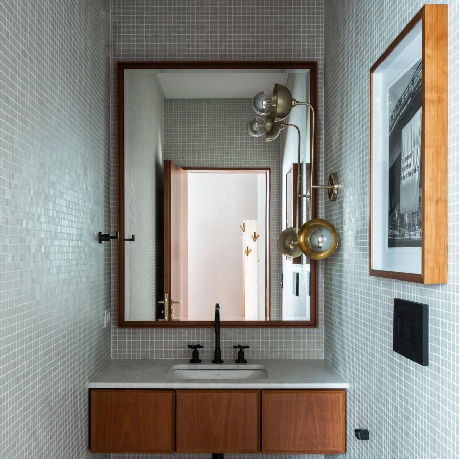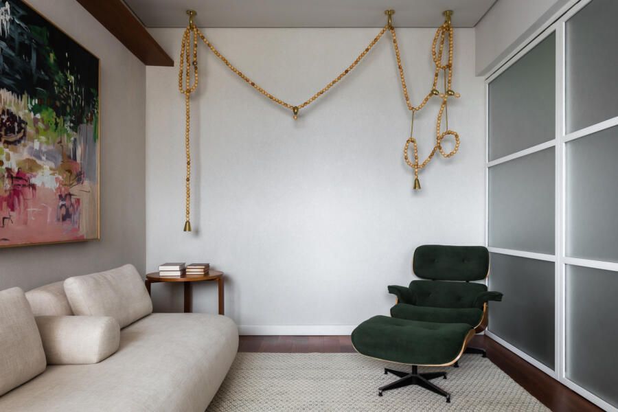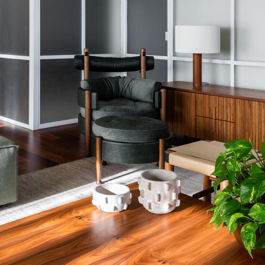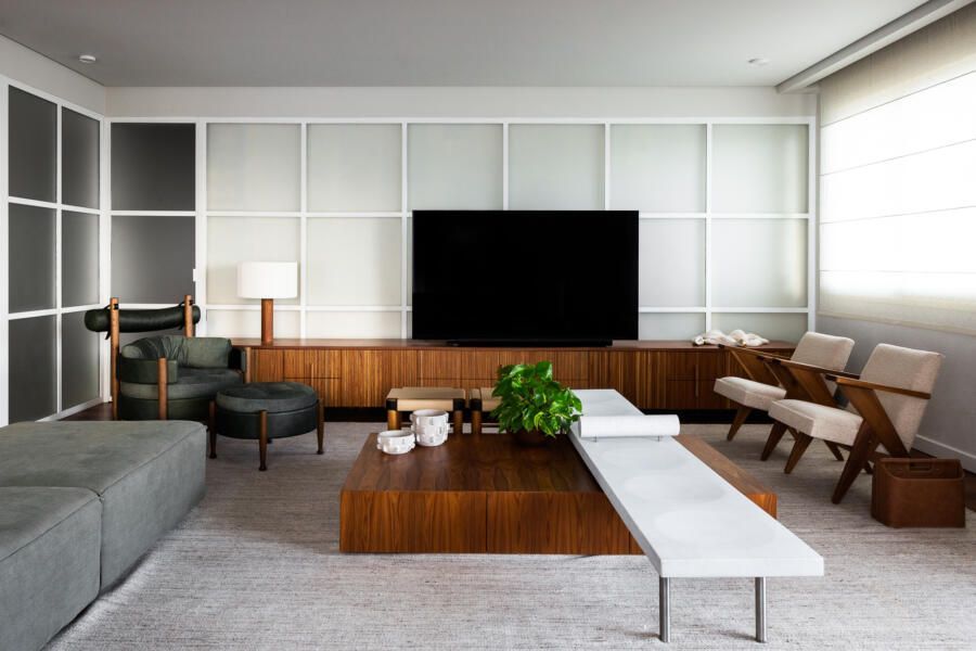 “Gostamos muito de personalizar cada projeto, e em quase todos fazemos desenhos especiais (muito inspirados pela estética mid-century). Neste caso, desenhamos os espelhos dos banheiros e lavabo, a mesa de jantar e algumas peças de iluminação. Além de móveis como a mesa de centro em pau ferro, com desenho limpo para harmonizar com o banco de concreto da Claudia Moreira Salles e as banquetas de couro da Alva Design. Outra peça desenhada pelo Studio, foi o Rack da TV todo revestido com pequenas hastes de madeira roliça – ao mesmo tempo em que o móvel possui um desenho limpo, ganha aconchego com esta textura.”