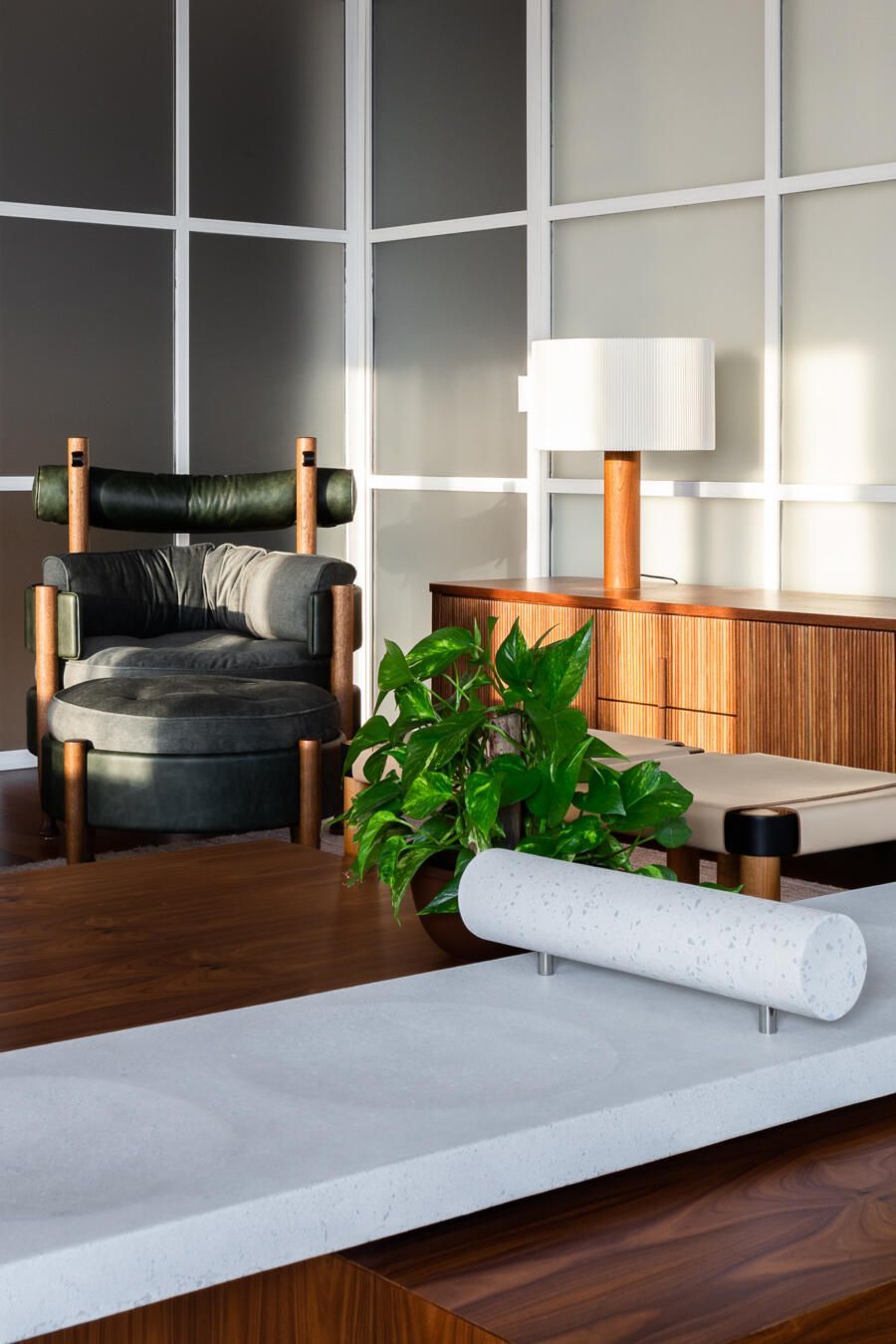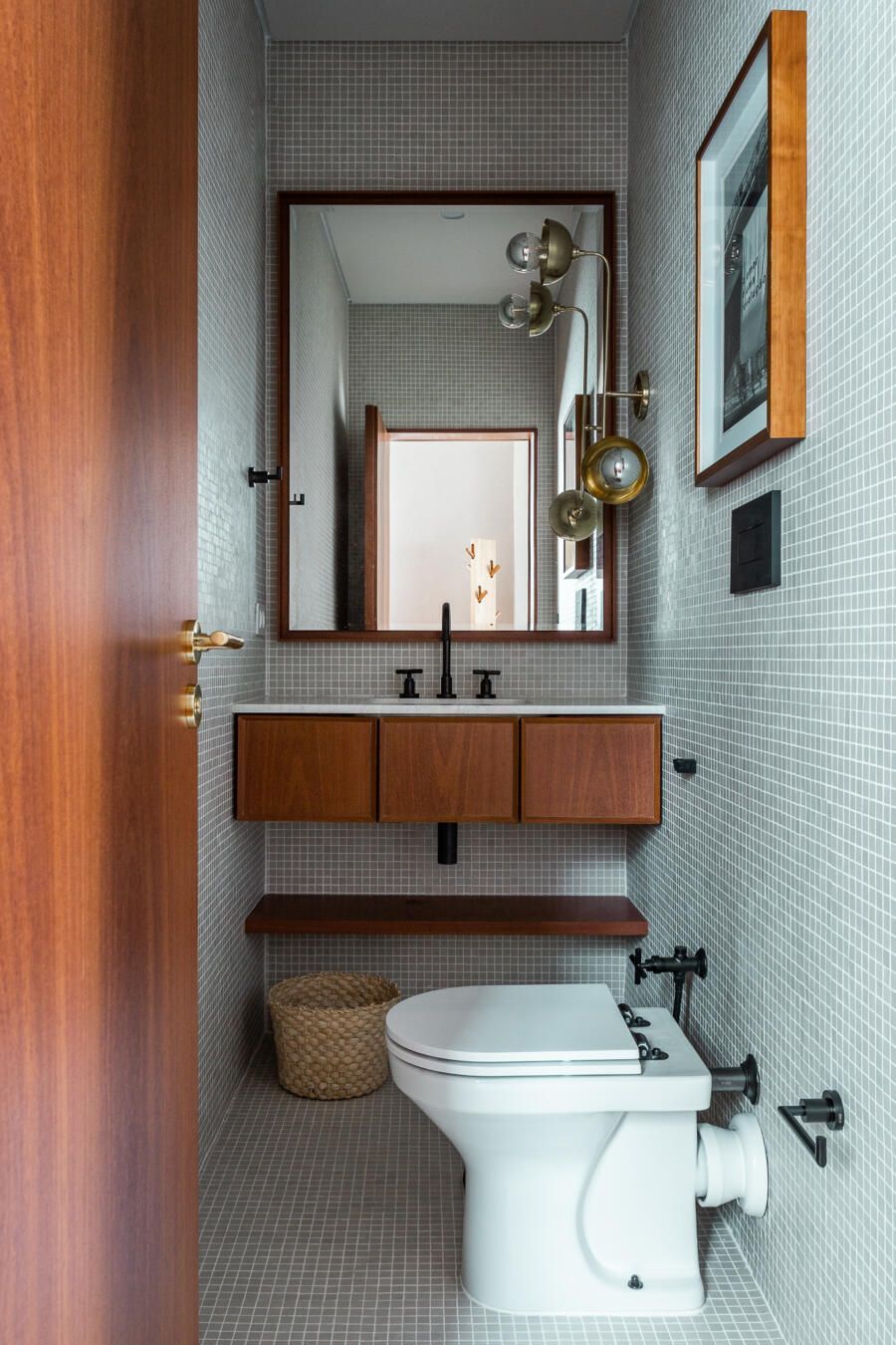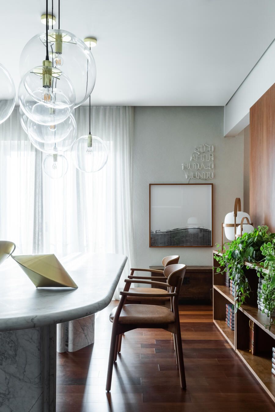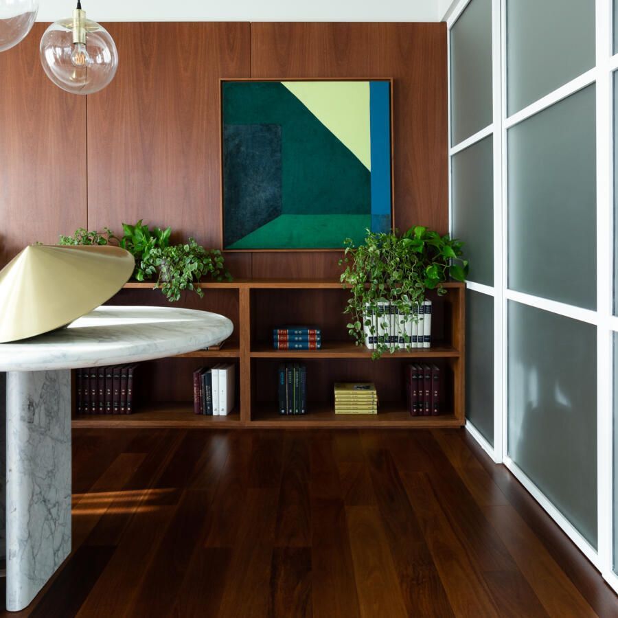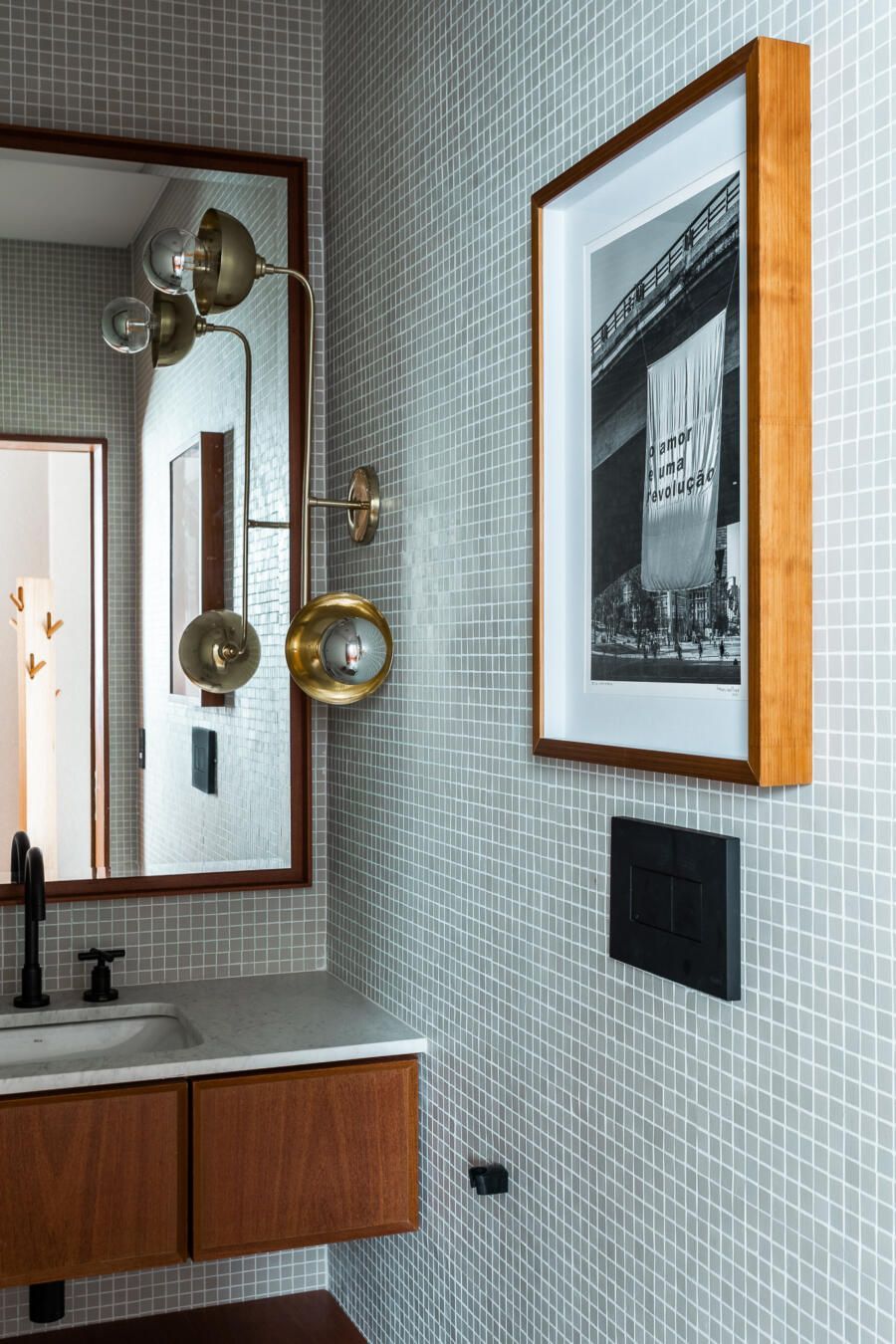“Gostamos muito de personalizar cada projeto, e em quase todos fazemos desenhos especiais (muito inspirados pela estética mid-century). Neste caso, desenhamos os espelhos dos banheiros e lavabo, a mesa de jantar e algumas peças de iluminação. Além de móveis como a mesa de centro em pau ferro, com desenho limpo para harmonizar com o banco de concreto da Claudia Moreira Salles e as banquetas de couro da Alva Design. Outra peça desenhada pelo Studio, foi o Rack da TV todo revestido com pequenas hastes de madeira roliça – ao mesmo tempo em que o móvel possui um desenho limpo, ganha aconchego com esta textura.”