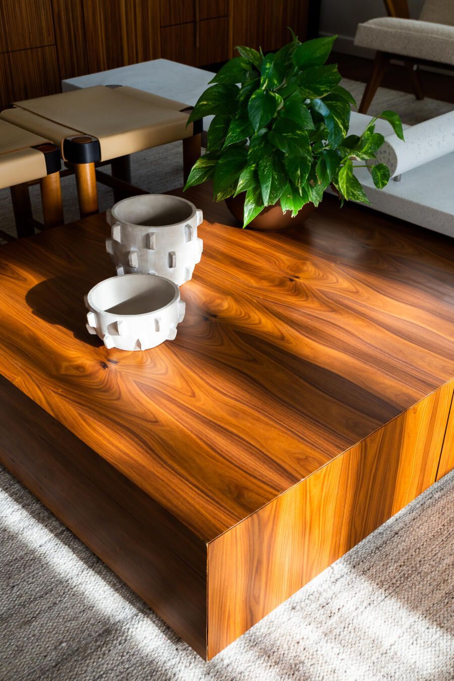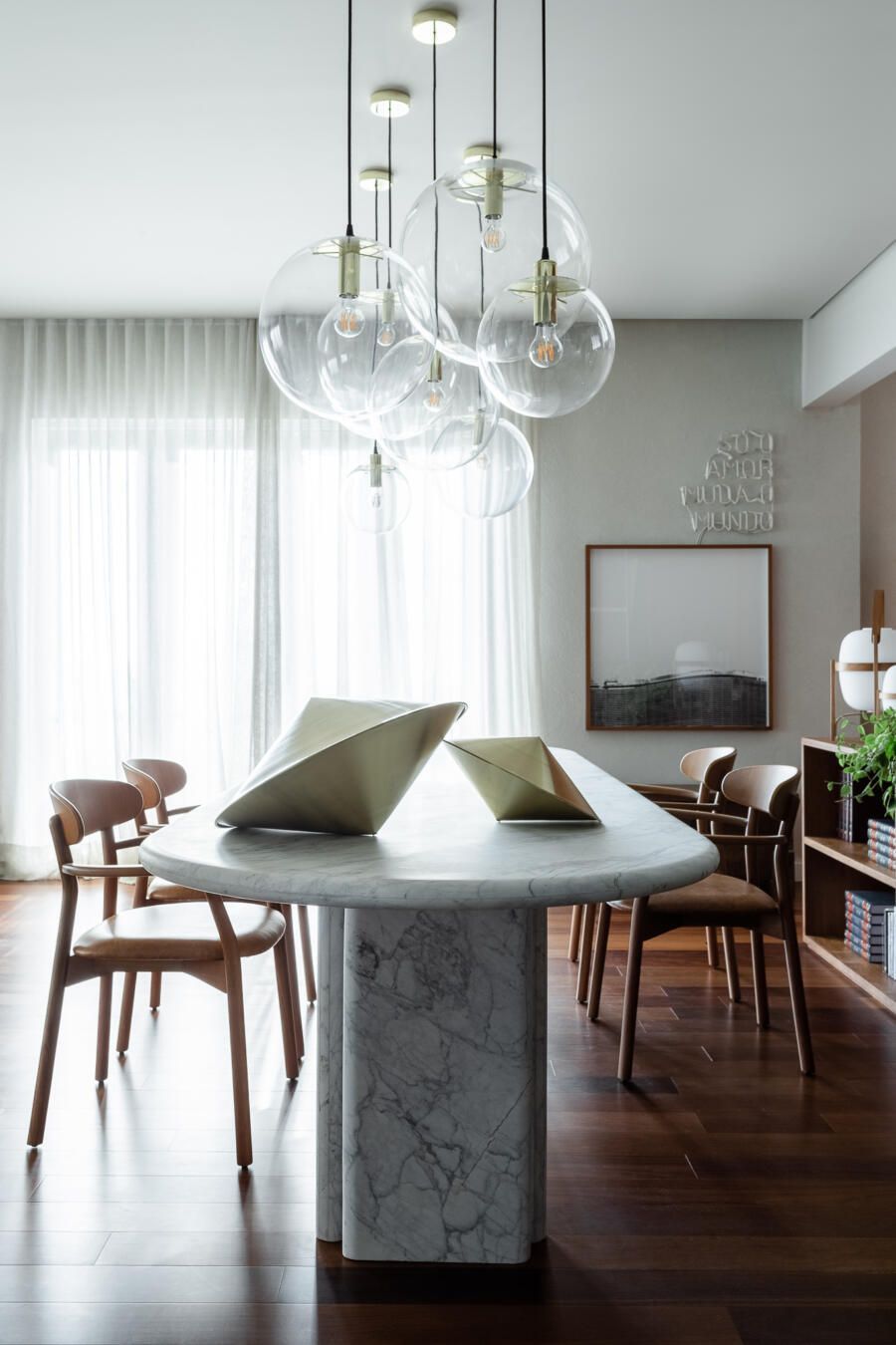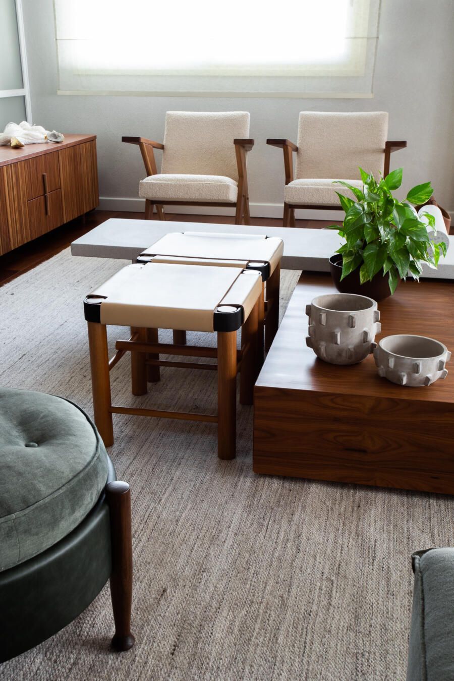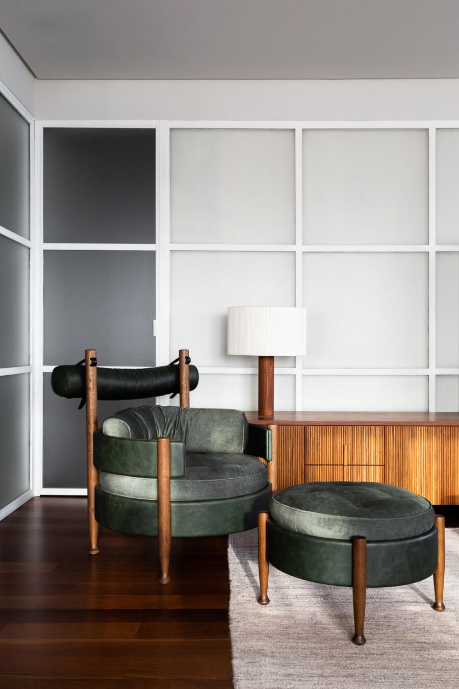 “Gostamos muito de personalizar cada projeto, e em quase todos fazemos desenhos especiais (muito inspirados pela estética mid-century). Neste caso, desenhamos os espelhos dos banheiros e lavabo, a mesa de jantar e algumas peças de iluminação. Além de móveis como a mesa de centro em pau ferro, com desenho limpo para harmonizar com o banco de concreto da Claudia Moreira Salles e as banquetas de couro da Alva Design. Outra peça desenhada pelo Studio, foi o Rack da TV todo revestido com pequenas hastes de madeira roliça – ao mesmo tempo em que o móvel possui um desenho limpo, ganha aconchego com esta textura.”
