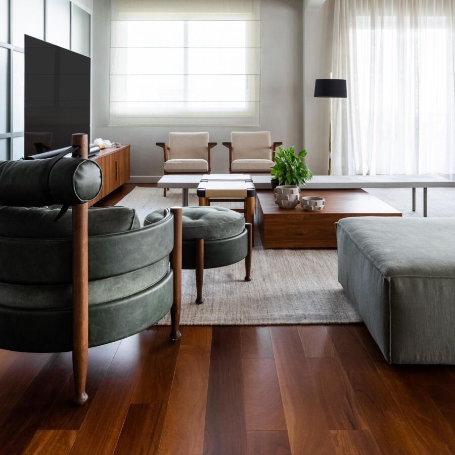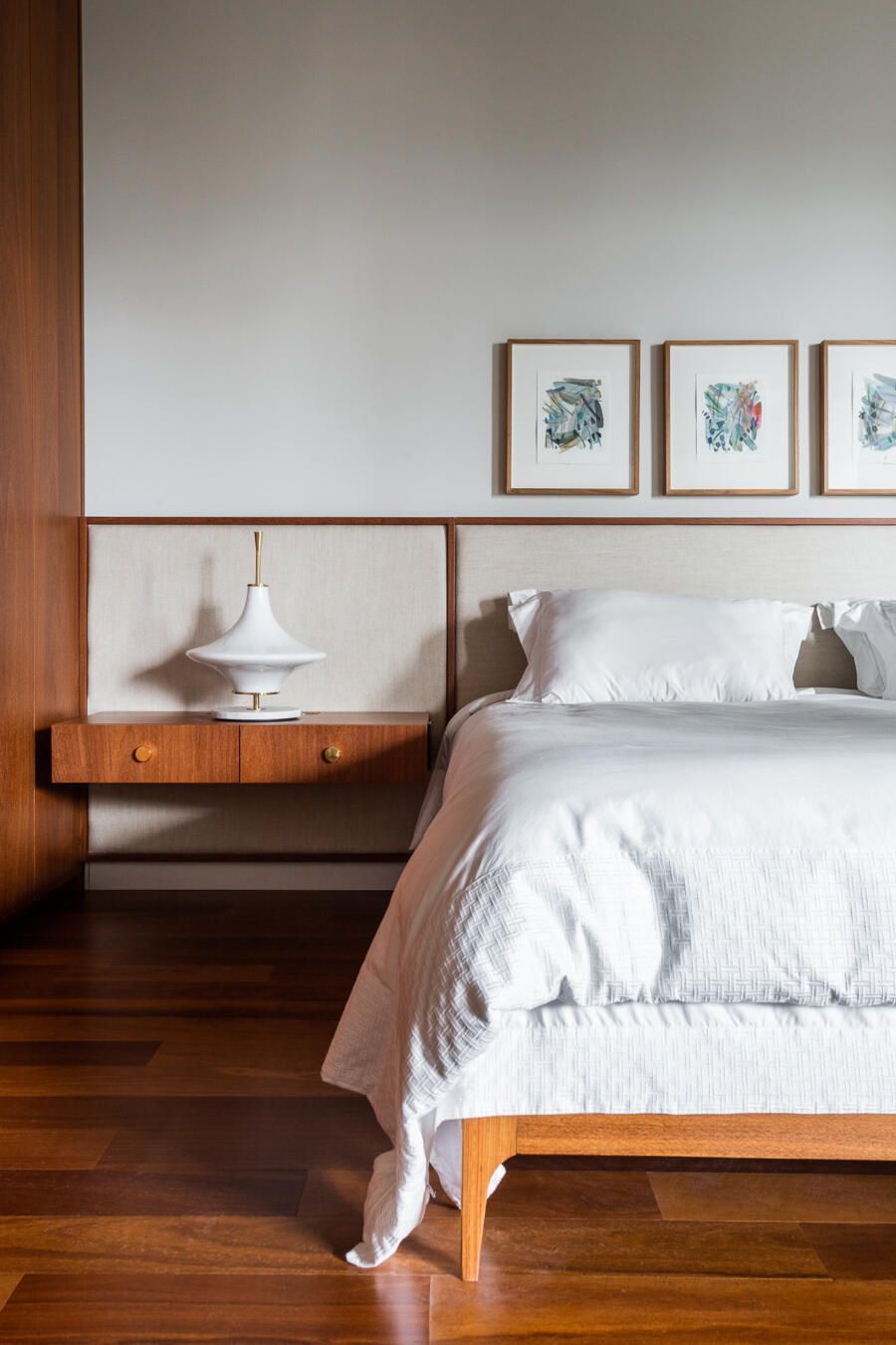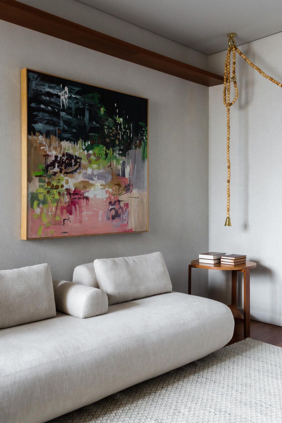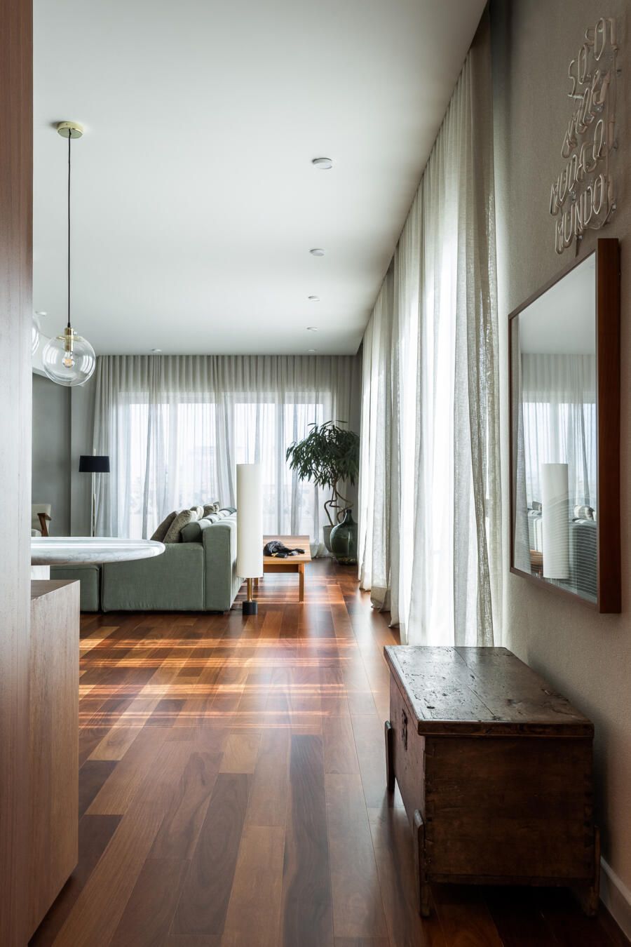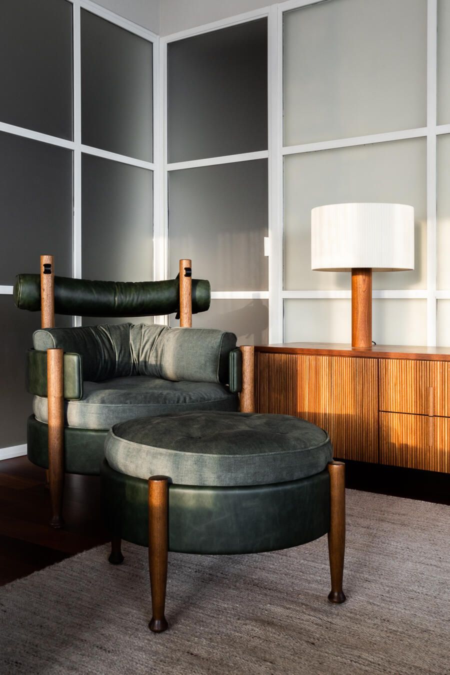 “Gostamos muito de personalizar cada projeto, e em quase todos fazemos desenhos especiais (muito inspirados pela estética mid-century). Neste caso, desenhamos os espelhos dos banheiros e lavabo, a mesa de jantar e algumas peças de iluminação. Além de móveis como a mesa de centro em pau ferro, com desenho limpo para harmonizar com o banco de concreto da Claudia Moreira Salles e as banquetas de couro da Alva Design. Outra peça desenhada pelo Studio, foi o Rack da TV todo revestido com pequenas hastes de madeira roliça – ao mesmo tempo em que o móvel possui um desenho limpo, ganha aconchego com esta textura.”