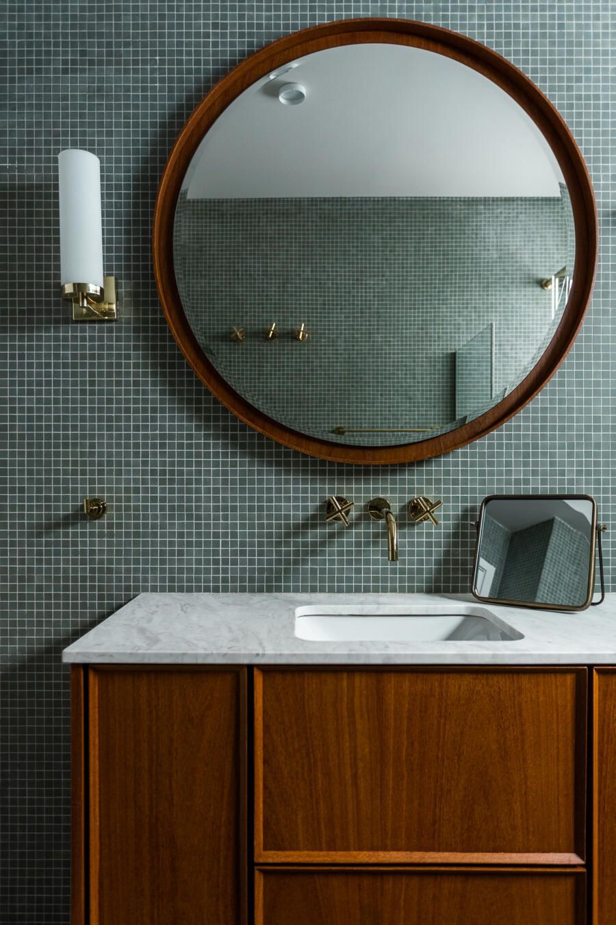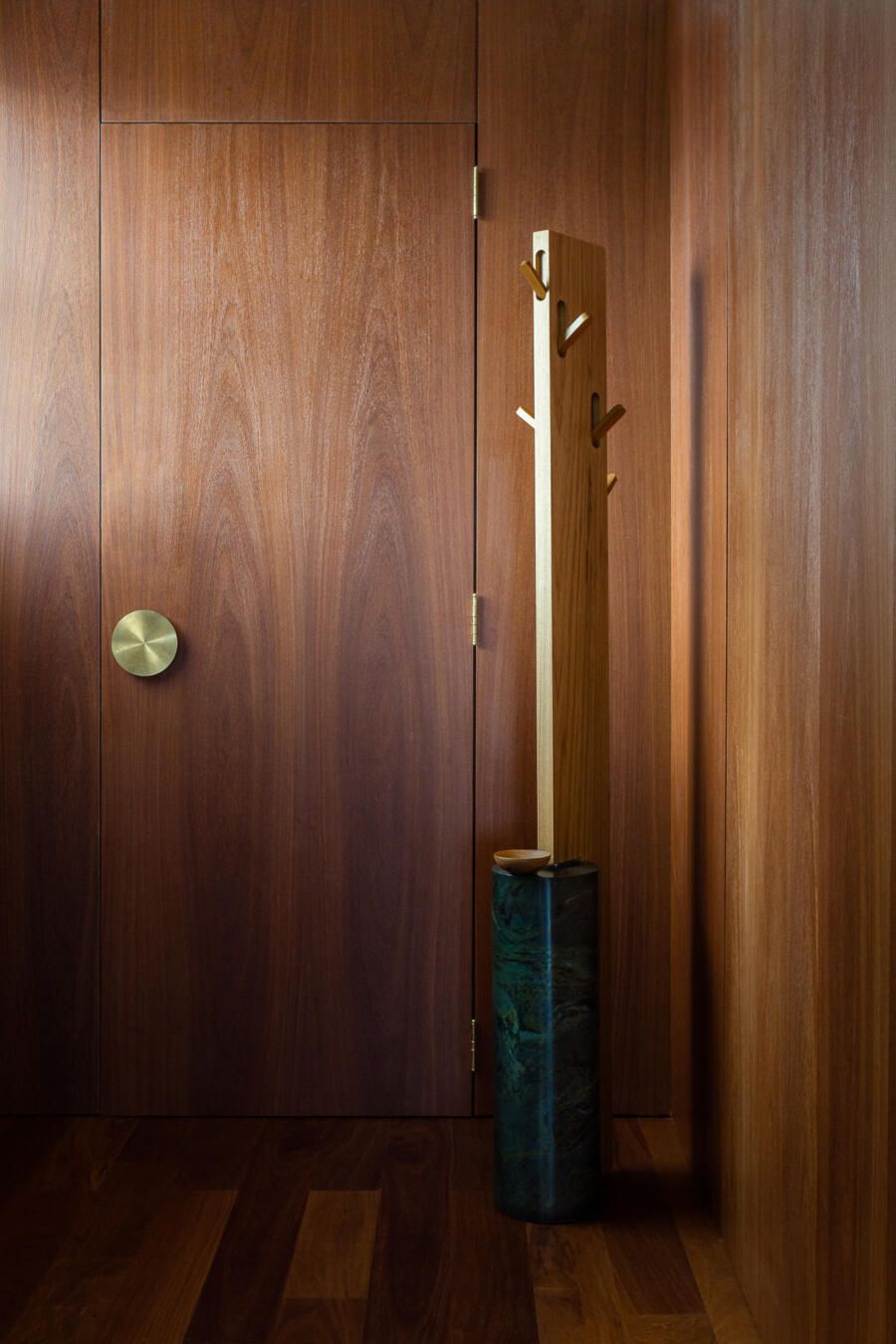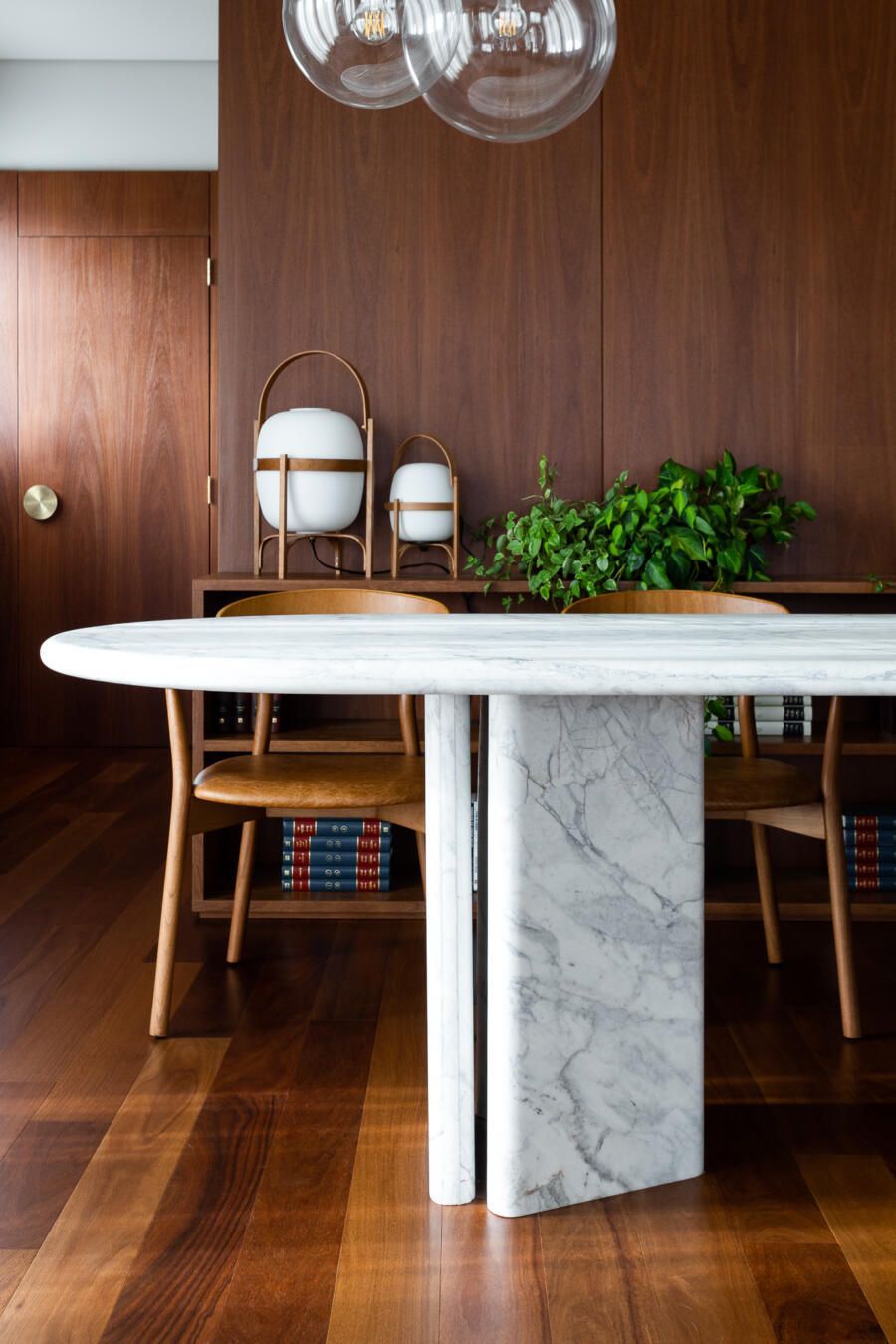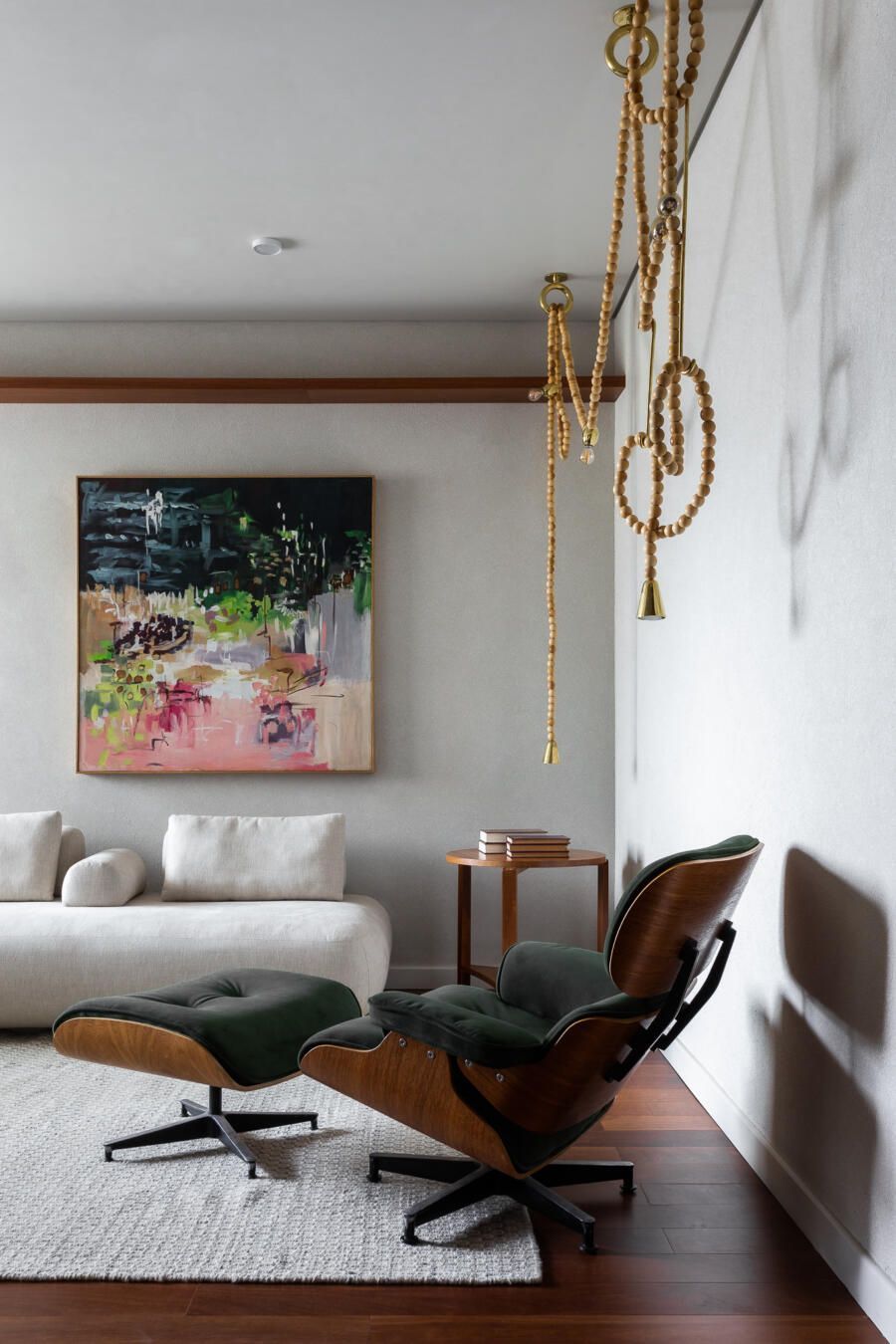 “Gostamos muito de personalizar cada projeto, e em quase todos fazemos desenhos especiais (muito inspirados pela estética mid-century). Neste caso, desenhamos os espelhos dos banheiros e lavabo, a mesa de jantar e algumas peças de iluminação. Além de móveis como a mesa de centro em pau ferro, com desenho limpo para harmonizar com o banco de concreto da Claudia Moreira Salles e as banquetas de couro da Alva Design. Outra peça desenhada pelo Studio, foi o Rack da TV todo revestido com pequenas hastes de madeira roliça – ao mesmo tempo em que o móvel possui um desenho limpo, ganha aconchego com esta textura.”