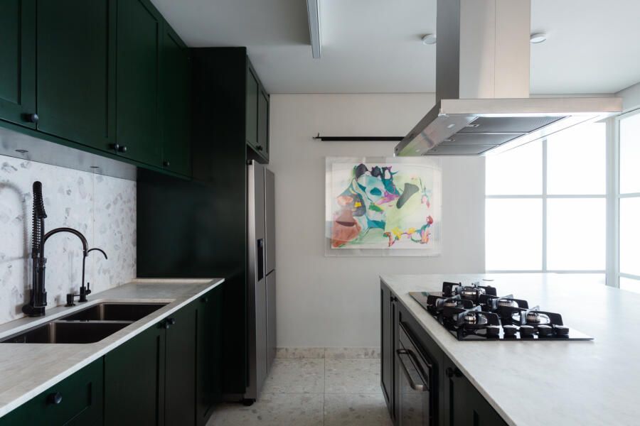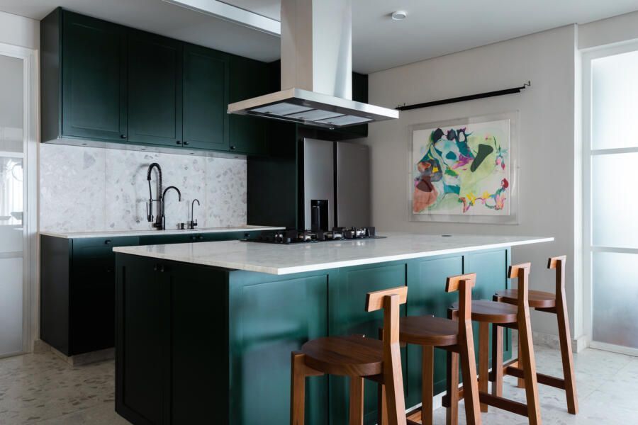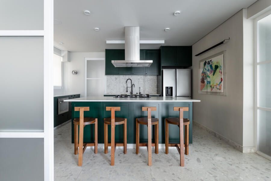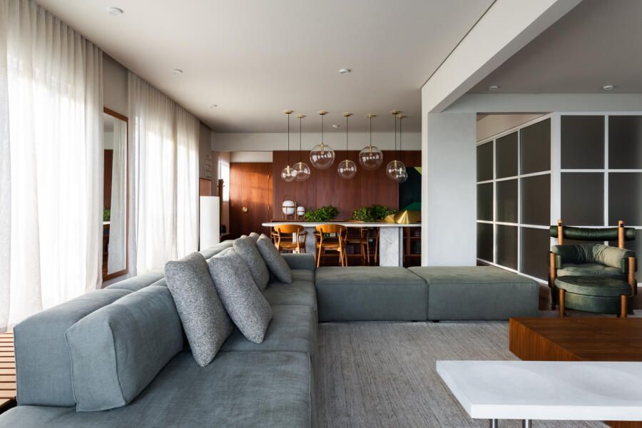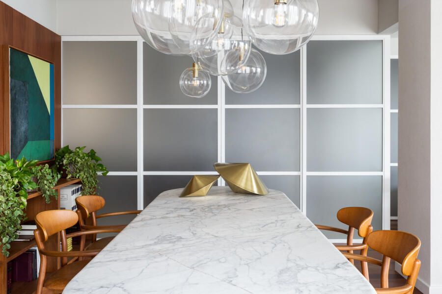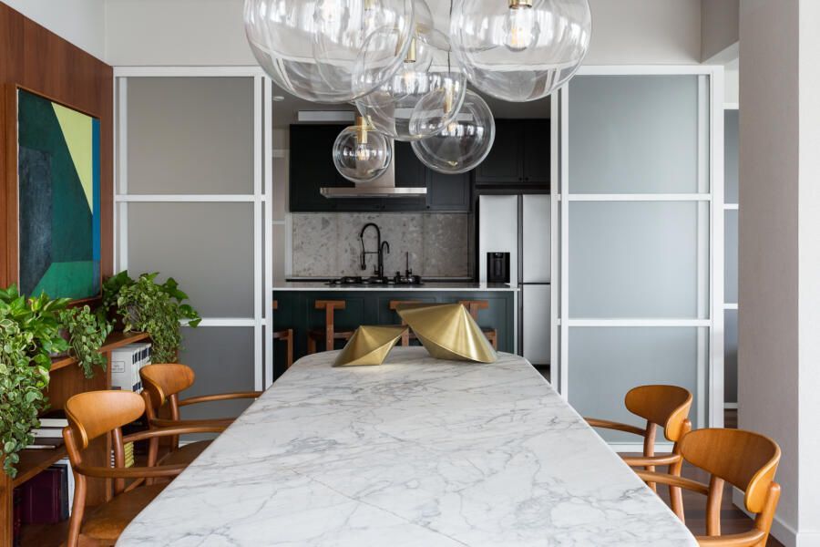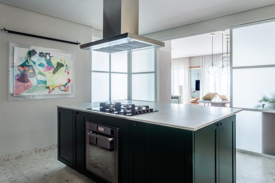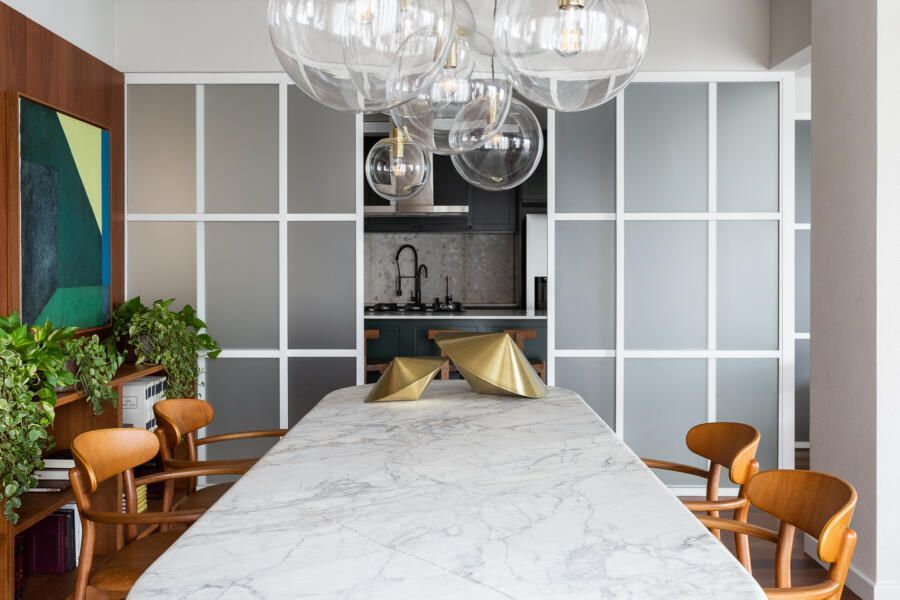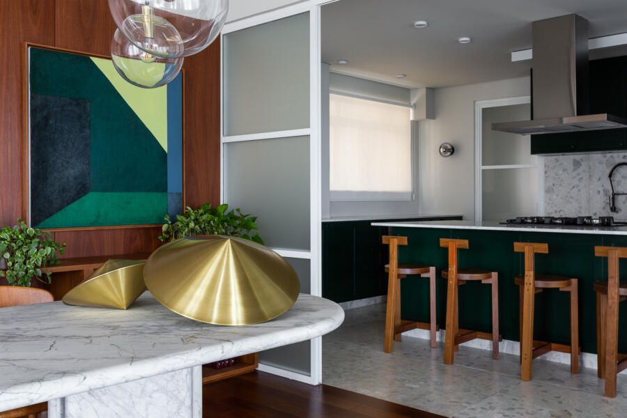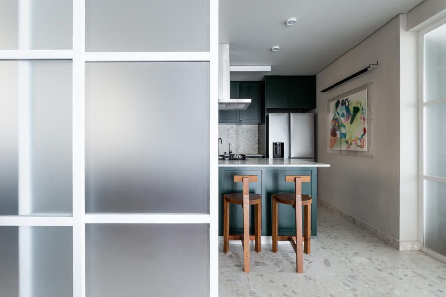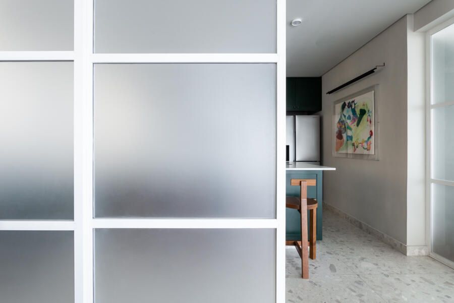 Algumas paredes presentes na planta original deram espaço a esquadrias com vidro anodizado, como na cozinha e no banheiro da suíte principal, permitindo com que a luz natural passasse a atravessar os ambientes.