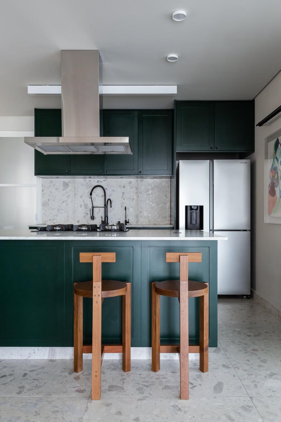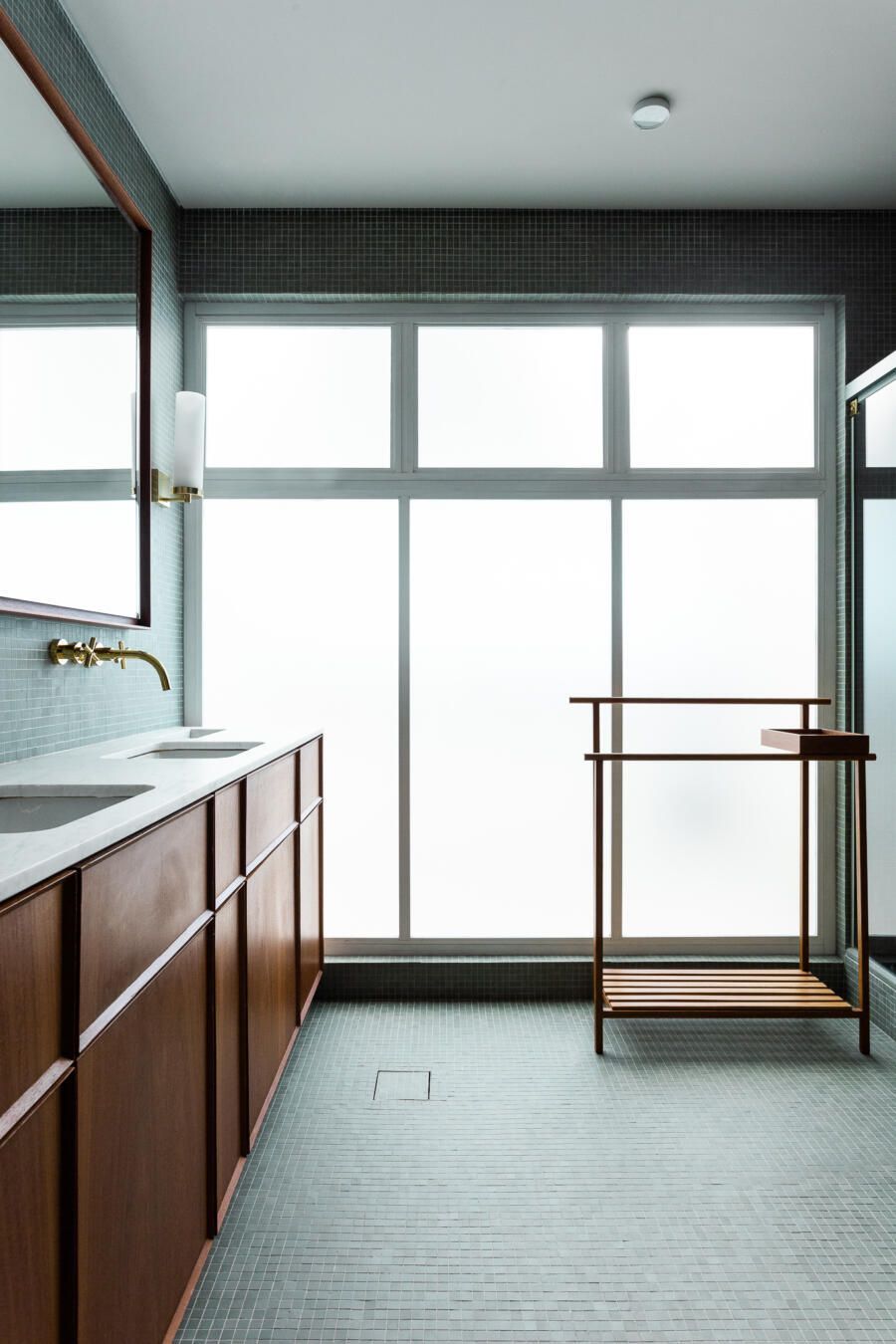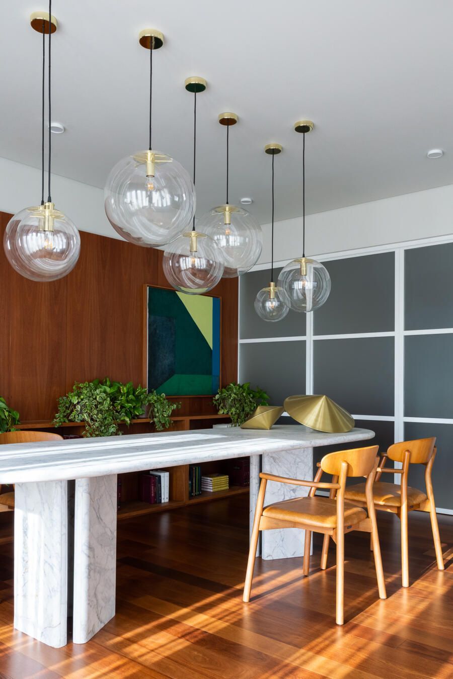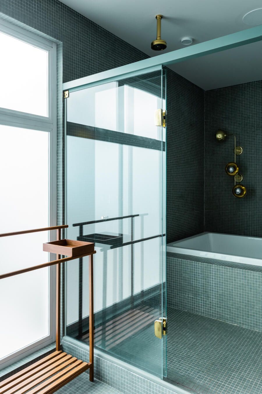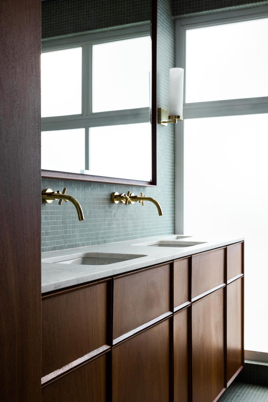 Algumas paredes presentes na planta original deram espaço a esquadrias com vidro anodizado, como na cozinha e no banheiro da suíte principal, permitindo com que a luz natural passasse a atravessar os ambientes.