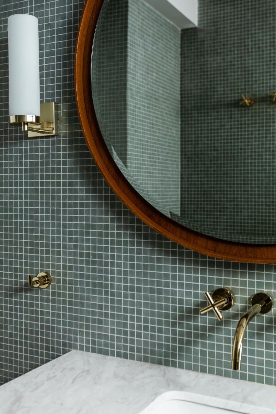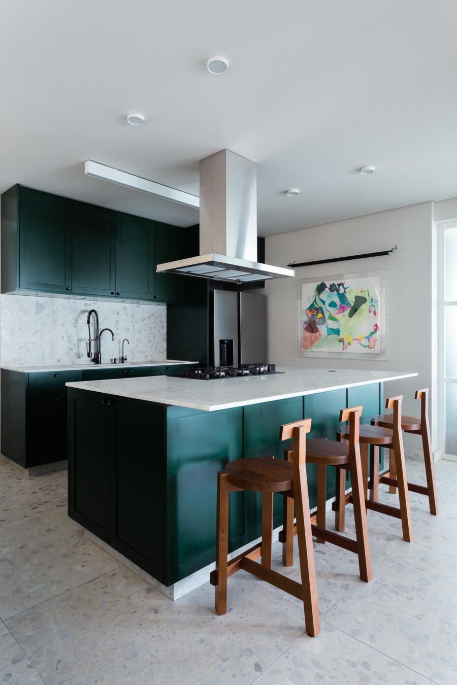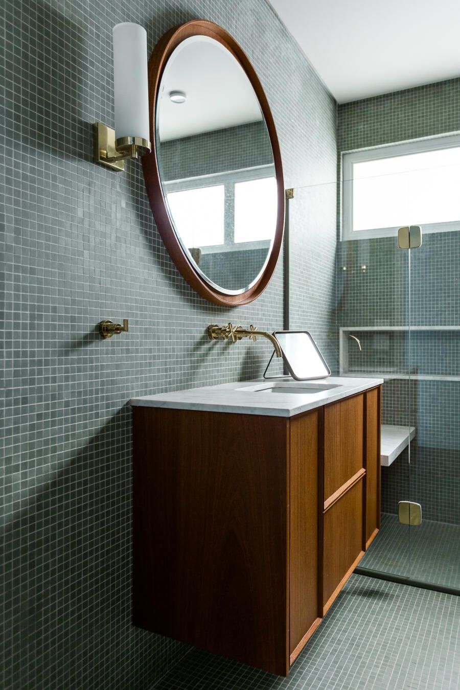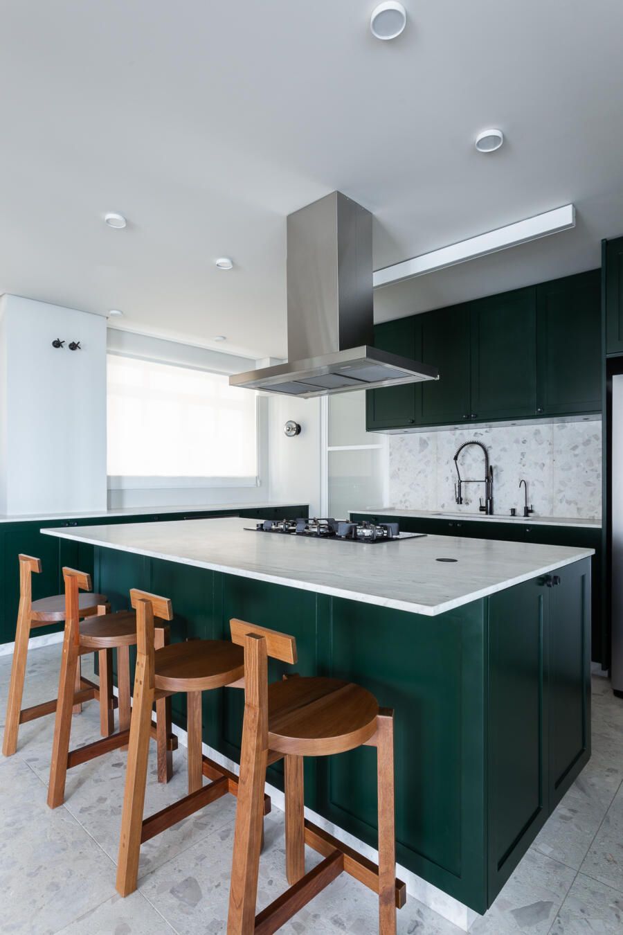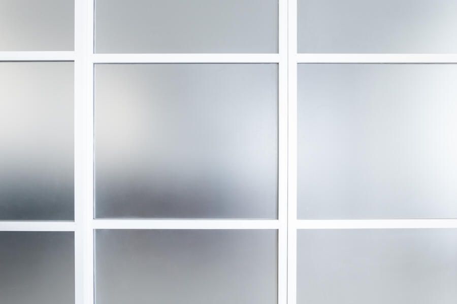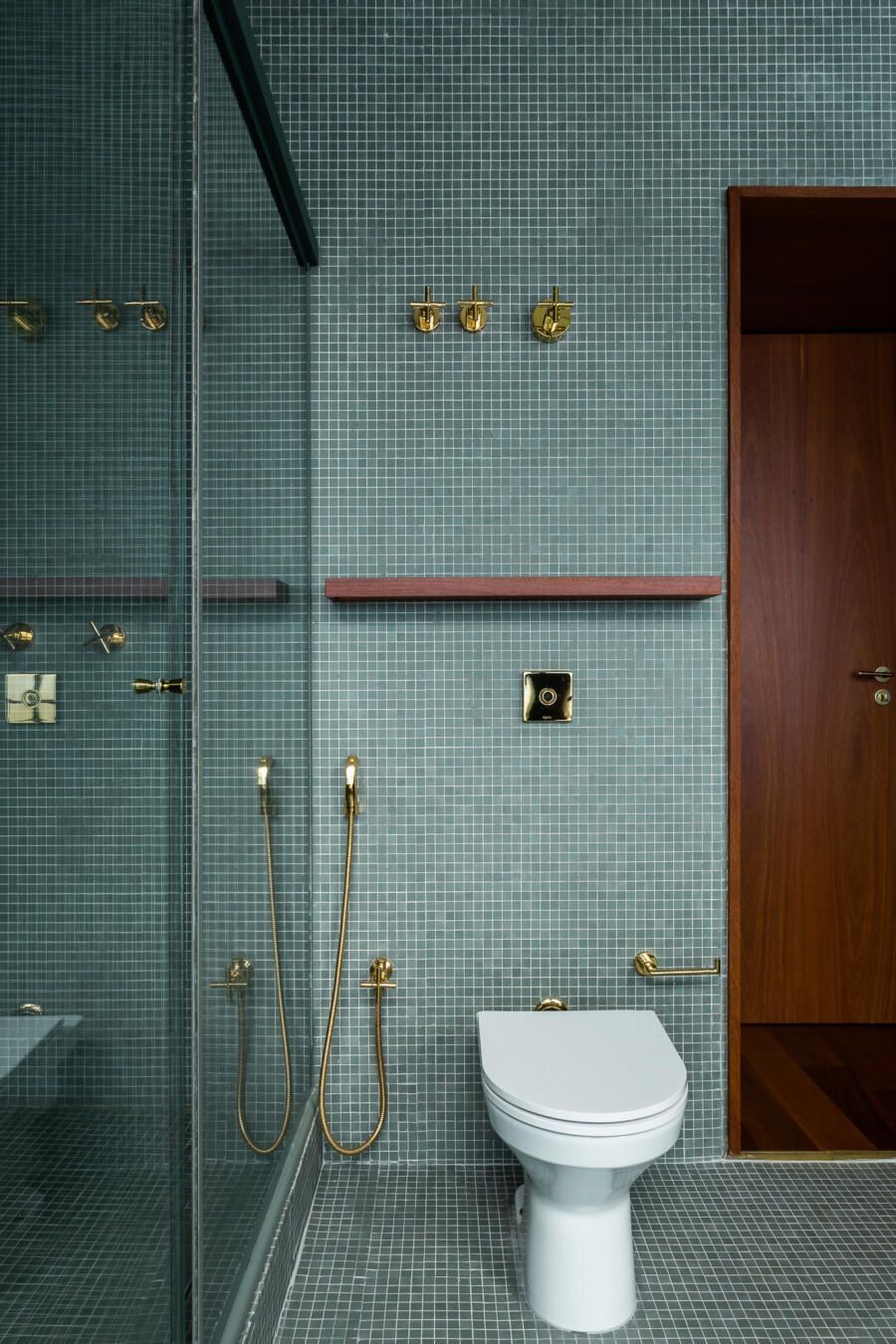 Algumas paredes presentes na planta original deram espaço a esquadrias com vidro anodizado, como na cozinha e no banheiro da suíte principal, permitindo com que a luz natural passasse a atravessar os ambientes.