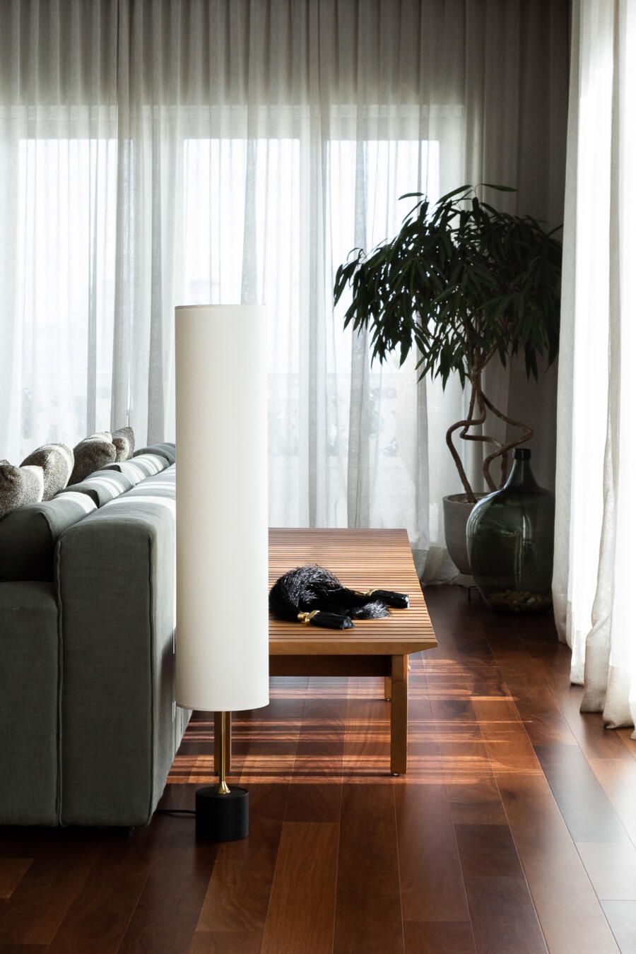 “O cliente desde o começo demonstrou gostar de uma luz mais calma, aconchegante. Por isso, todas as luminárias de mesa e piso estão conectadas a tomadas comandadas (ou seja, aquelas que podem ser acionadas pelos interruptores). No dia a dia, o cliente utiliza mais essa luz difusa, acionando a iluminação do teto somente quando necessário. O sistema de som também possui este conforto, podendo funcionar na casa toda ou em ambientes isolados. Além disso, as persianas dos quartos são automatizadas.”