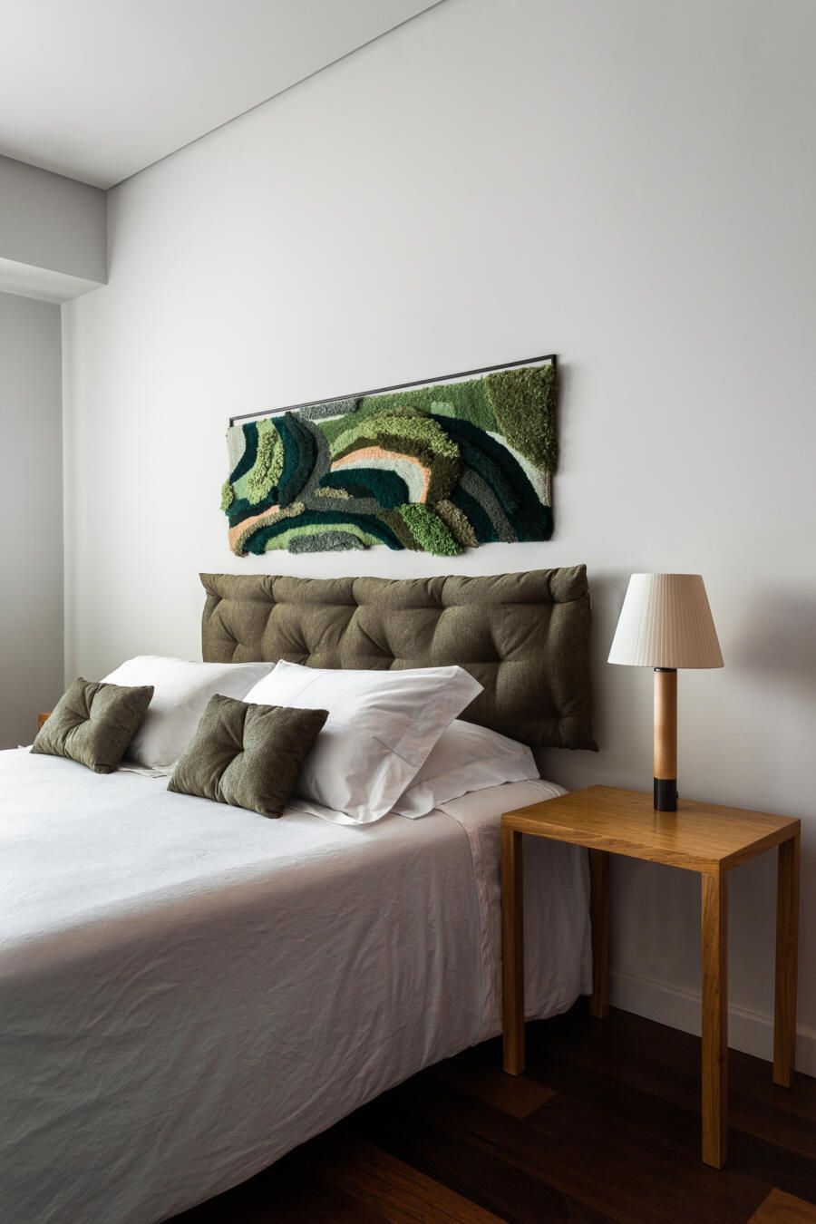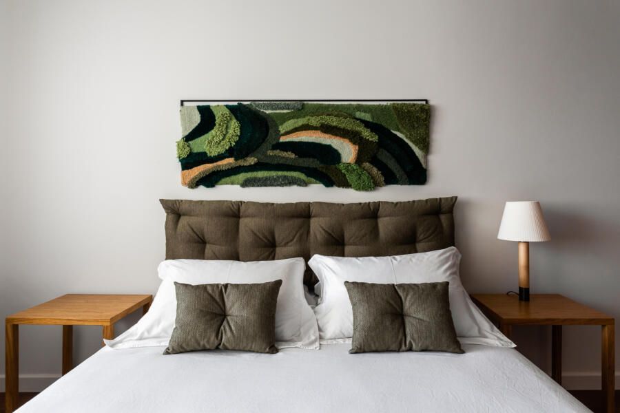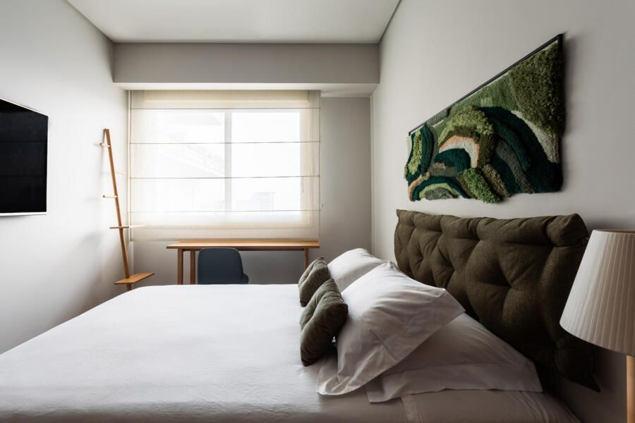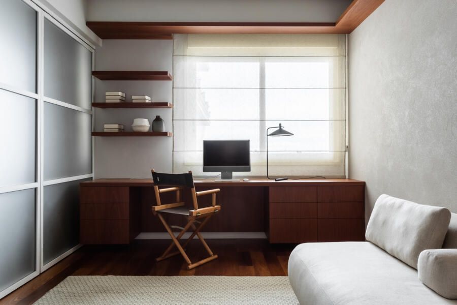 “Havia uma contradição no imóvel, a suíte principal possuía a menor janela entre os quartos. Como umas das necessidades do cliente era um Home Office, resolvemos juntar o quarto mais próximo à suíte (servindo como local de trabalho), e assim, com os ambientes integrados, a suíte ganhou uma “antessala”, mais luminosidade e espaço.”