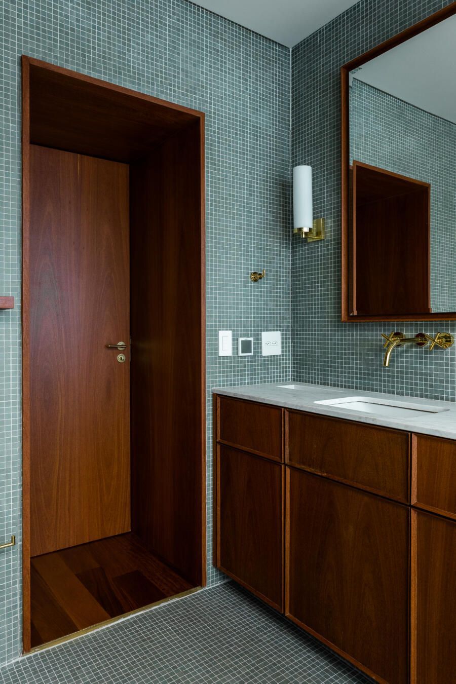 “O cliente tinha duas necessidades: adequar a planta do seu novo apartamento ao seu modo de vida, e fazer com que aquele espaço tivesse uma conexão visual com a sua identidade. Poucas mudanças programáticas foram feitas, o quarto de serviço foi extinto, possibilitando a ampliação do banheiro da suíte principal, e um dos pedidos mais enfáticos foi que o banheiro lembrasse um spa.”