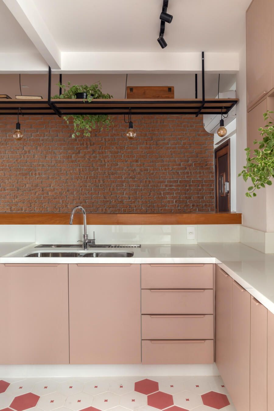 “Desenhei uma bancada mais profunda que o normal para embutir uma calha úmida atrás do misturador, dispensando assim o armário aéreo com escorredor de pratos”