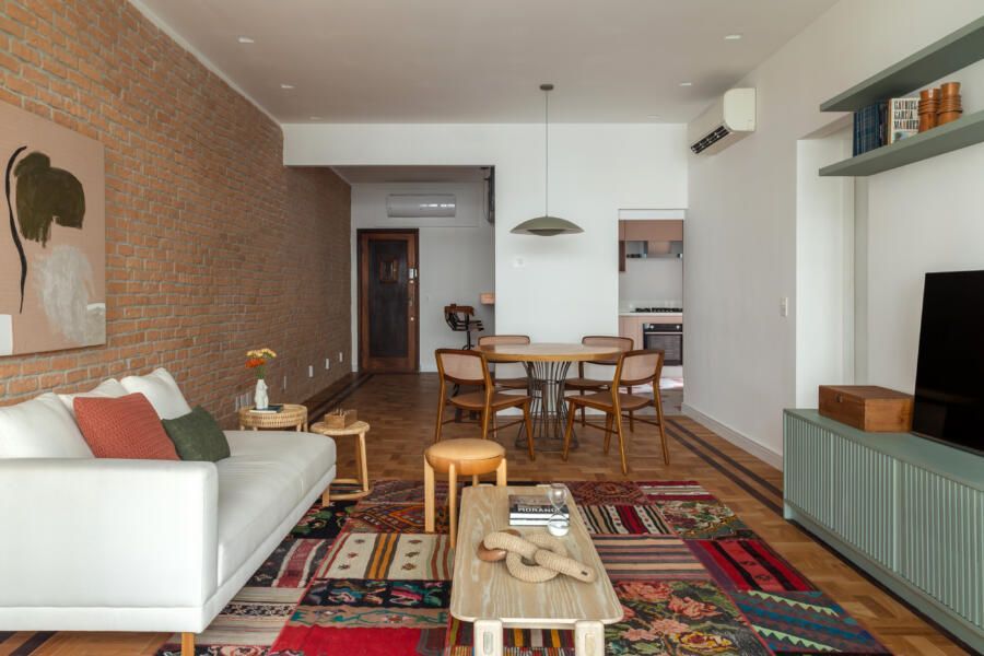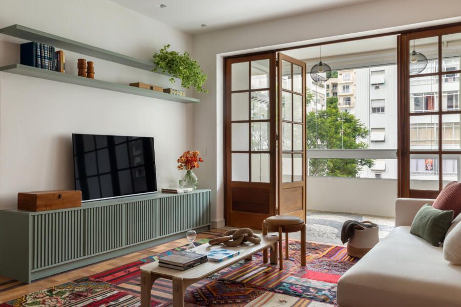 O resultado é um apartamento aconchegante, com ladrilhos hidráulicos, patchwork e vidros canelados que trazem toques retrô ao decór e com piso original em taco revitalizado.