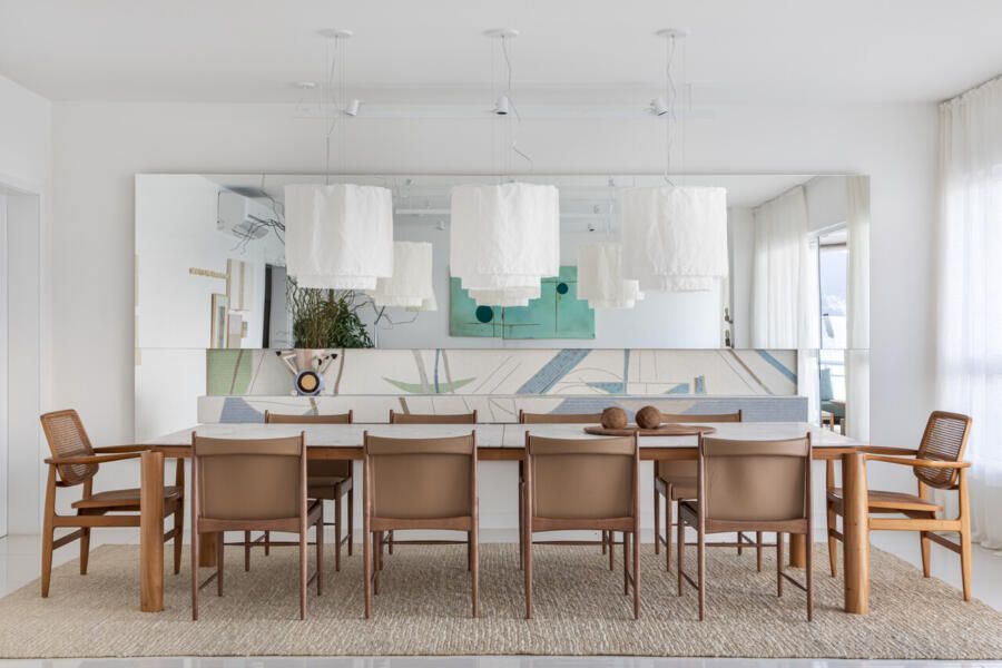 Um dos destaques do projeto é a sala de jantar, integrada à varanda com vista aberta para o mar. Esse tipo de integração entre interior e exterior é uma solução muito buscada por quem deseja valorizar a paisagem e trazer mais luz natural para os ambientes.