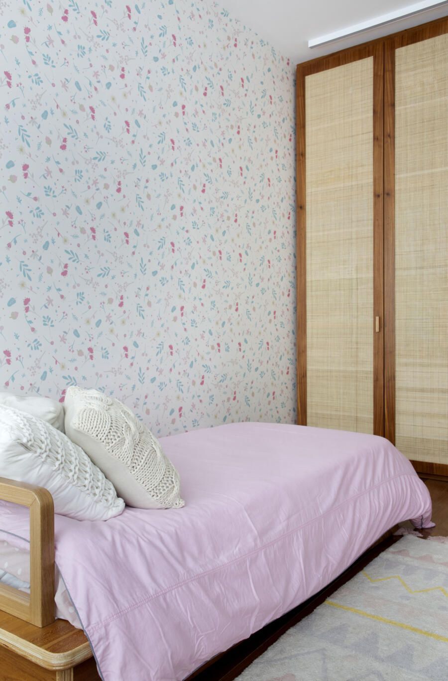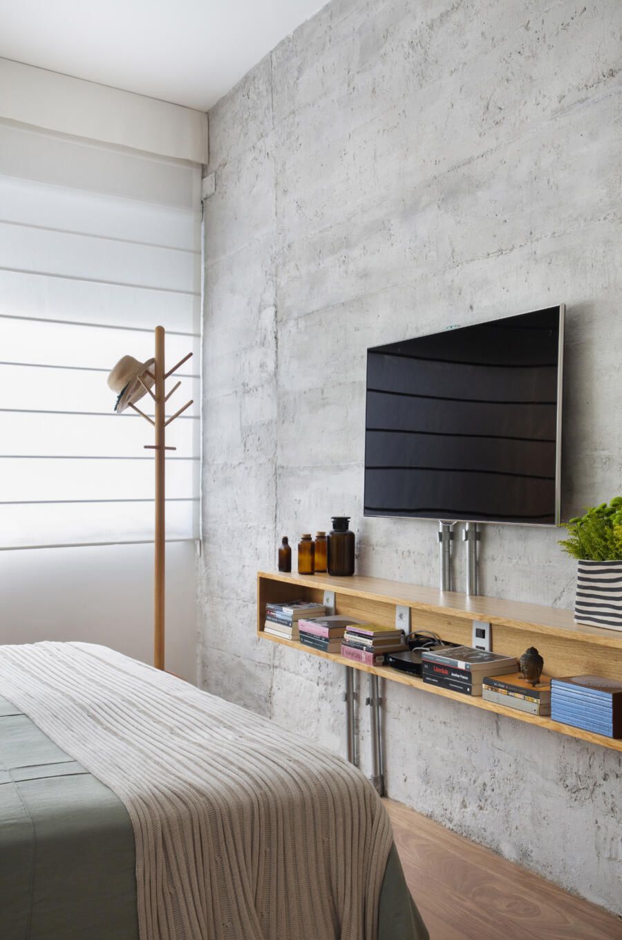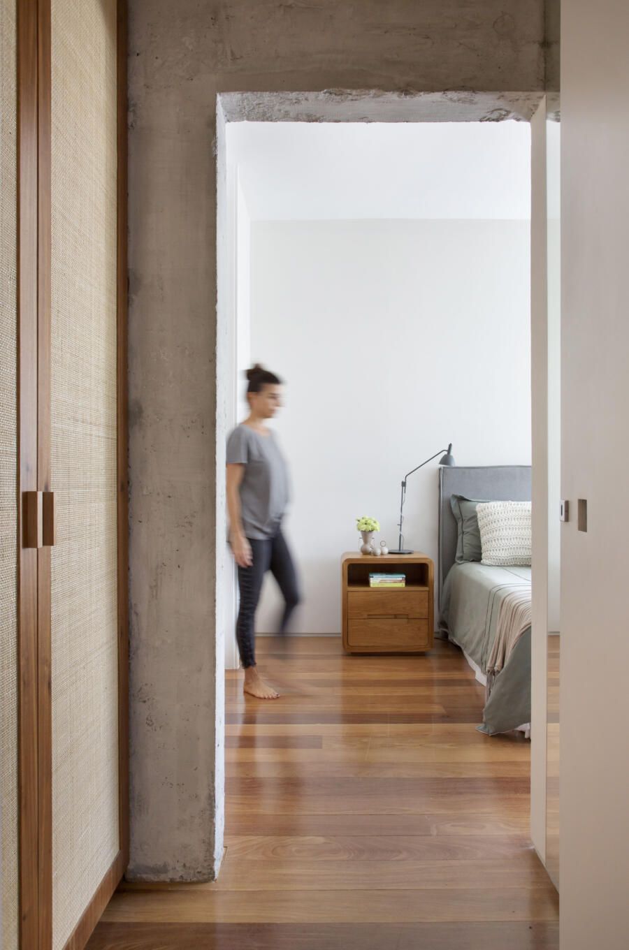 Para quebrar a frieza e brutalidade das paredes de concreto, optamos por um piso em réguas de ipê na sala, e armários executados em madeira com detalhes de palhinha no quarto da moradora.