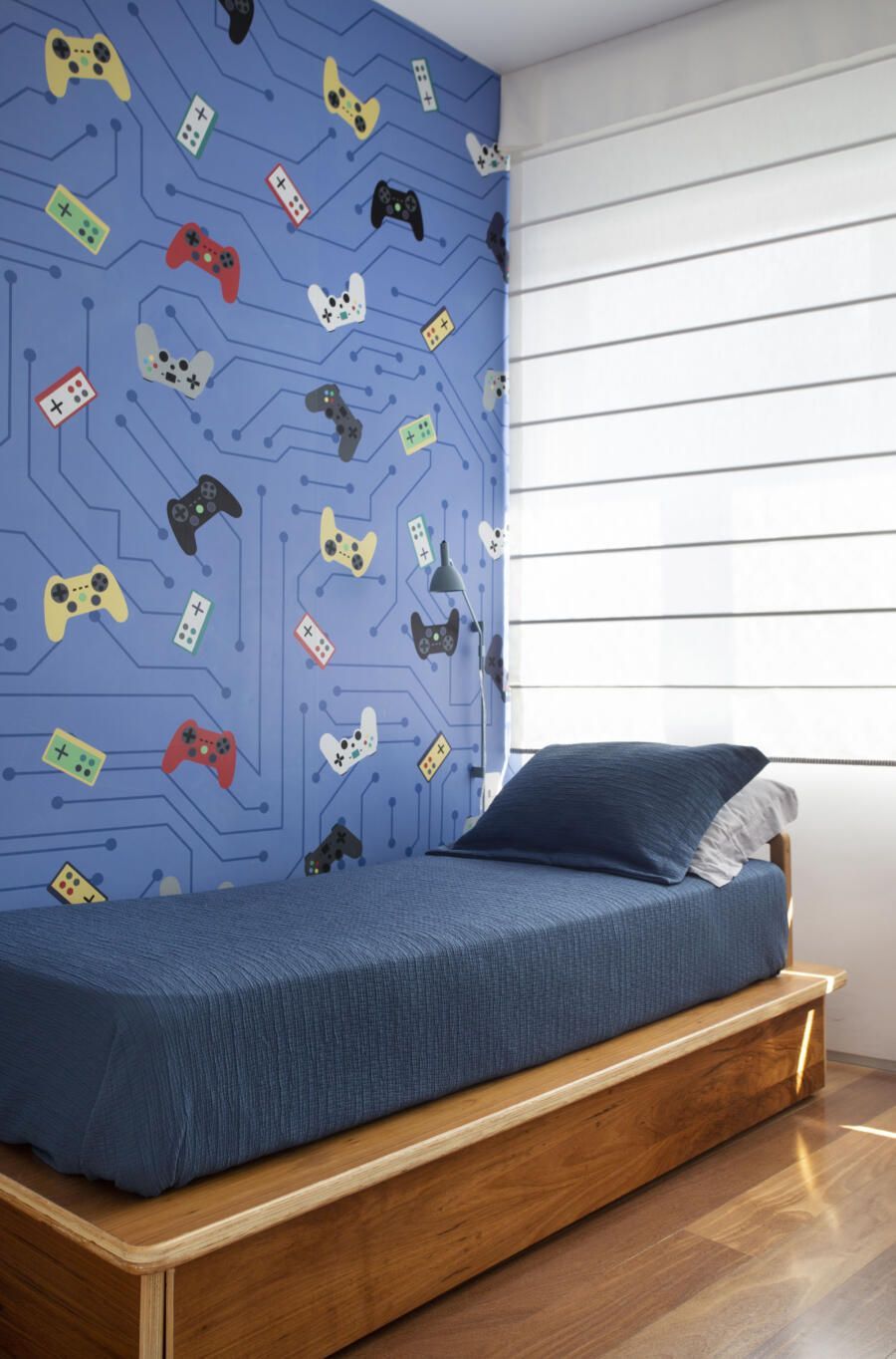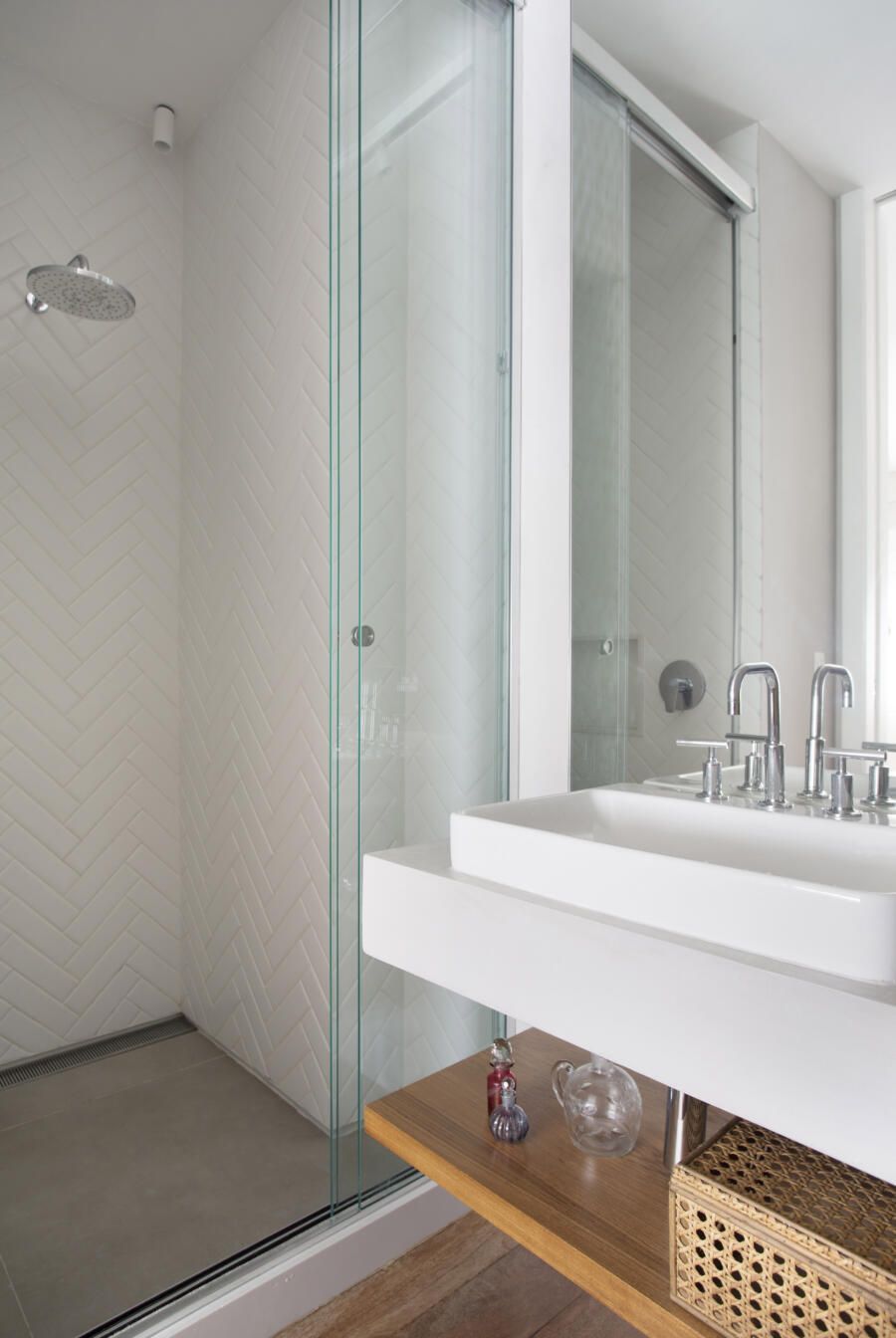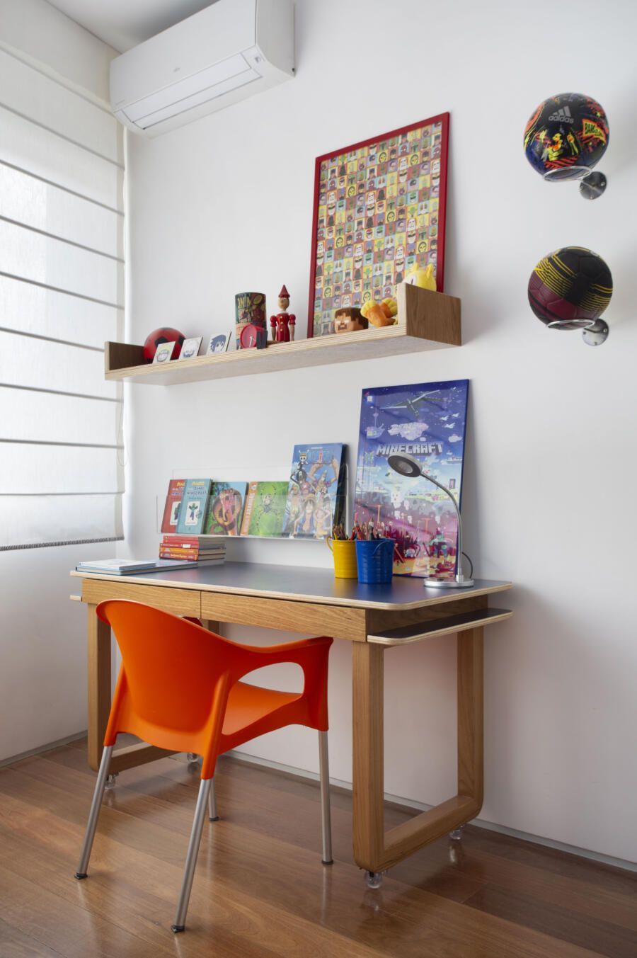 “Mudamos a planta da cozinha, tornando o espaço totalmente integrado ao estar e jantar, sem nenhum tipo de divisão entre esses ambientes. Ao lado, foi mantido um pequeno espaço fechado para área de serviço e dependência de empregada. Criamos também uma suíte para a proprietária, além de dois quartos para os filhos com um banheiro.”