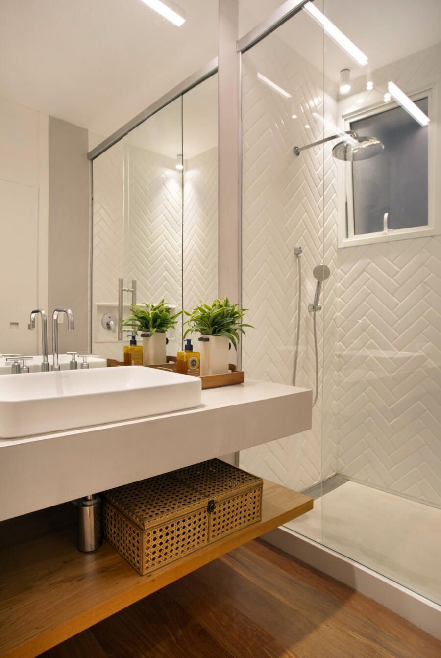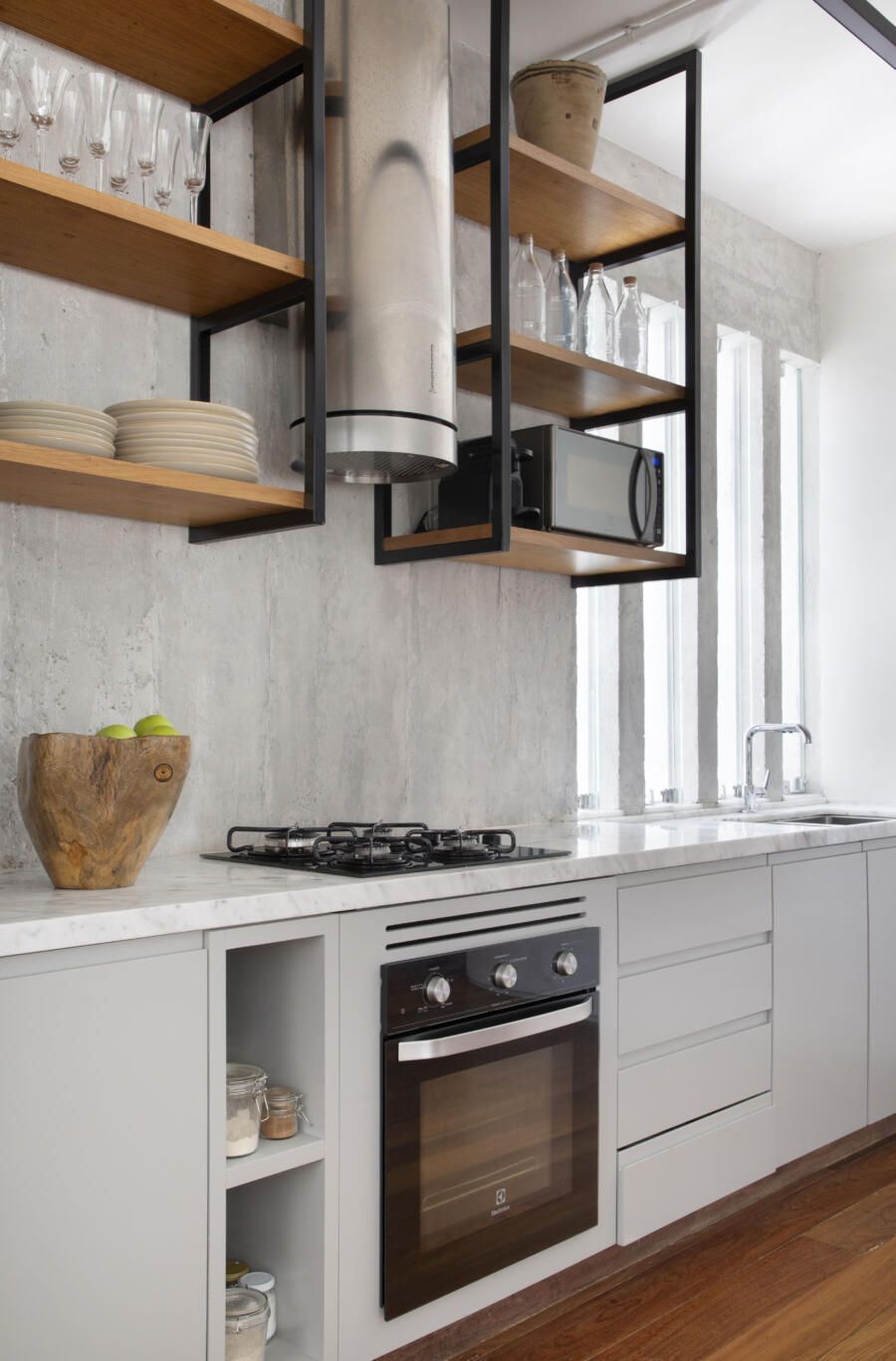 “A cozinha é um super destaque no projeto. Desenhamos uma marcenaria especial que deixa à mostra itens que normalmente ficariam escondidos, como pratos, copos e travessas.”
