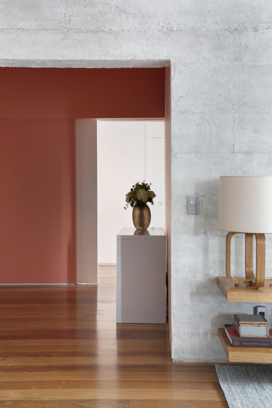 E uma vez que a ideia de assumir as paredes de concreto veio à tona, isso impactou na escolha de cores e mix de materiais.