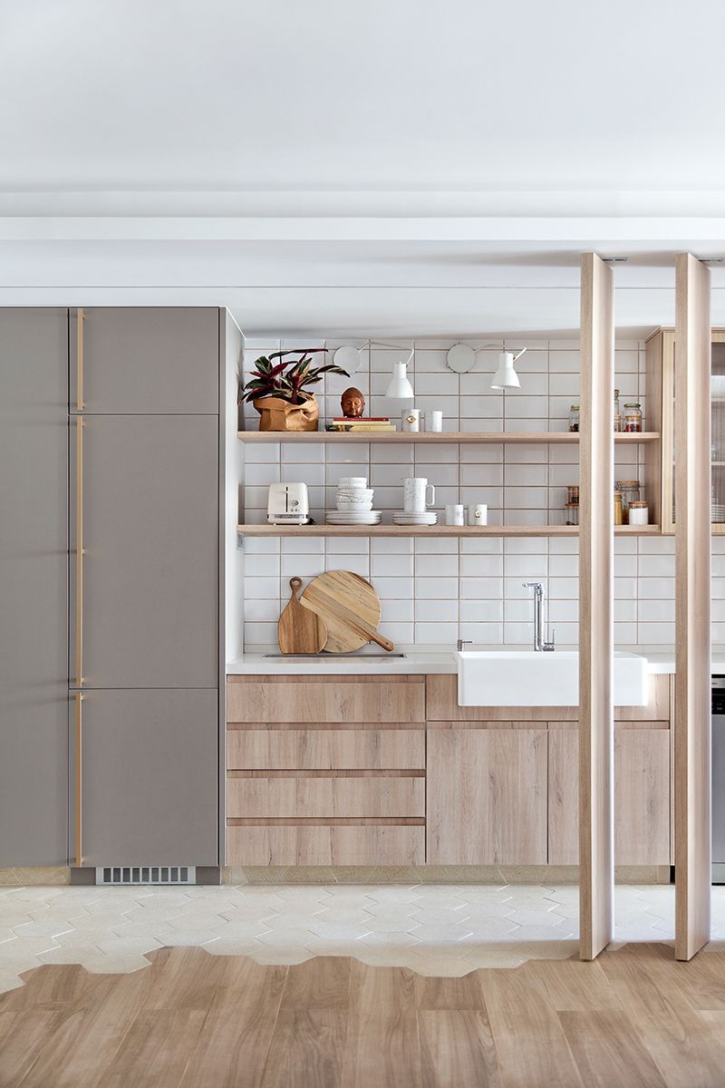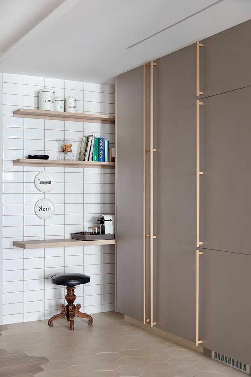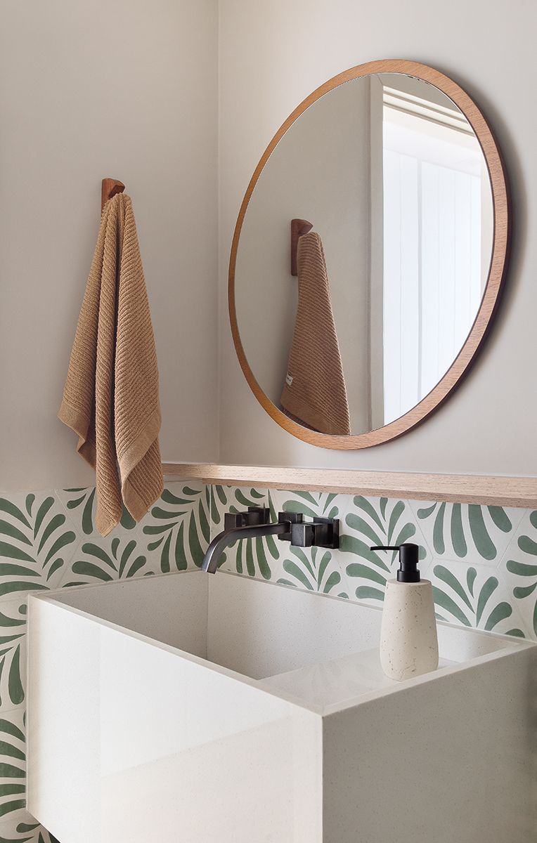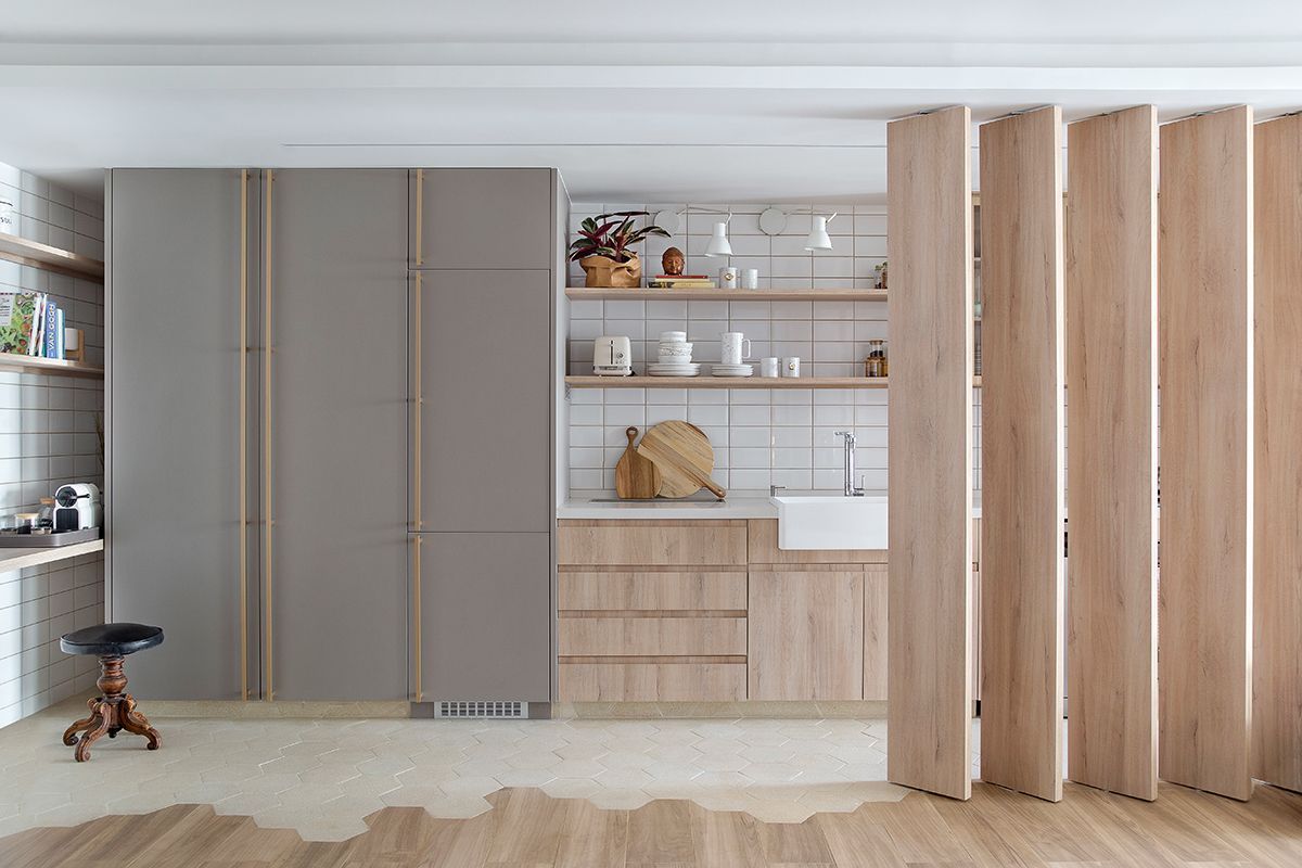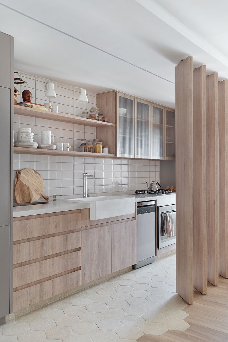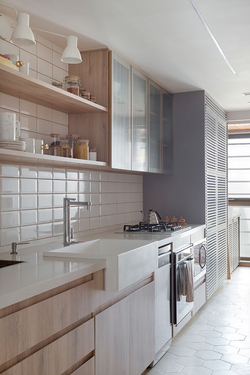 O projeto buscou criar espaços aconchegantes e estilosos, ao mesmo tempo, e adotou uma paleta de cores em tons suaves para deixar o apartamento claro e bem iluminado. A cozinha, por exemplo, tem cuba em estilo farm sink, que remete a fazenda, piso de ladrilho hidráulico com formato sextavado, paredes de cerâmica branca com toque retrô e armários com portas amadeiradas combinadas com portas de vidro canelado.