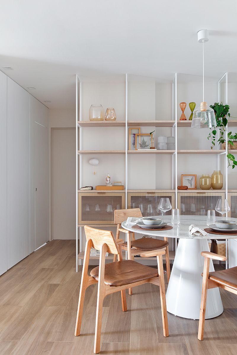 A estante serve de apoio à mesa de jantar, ao mesmo tempo que funciona como aparador ou buffet. Além disso, sua estrutura vazada de serralheria branca e os módulos de marcenaria fechados com portas de vidro canelado não pesam visualmente no ambiente.