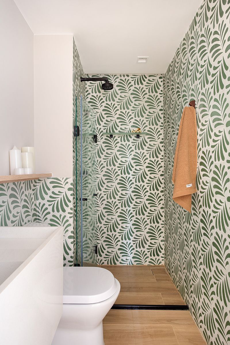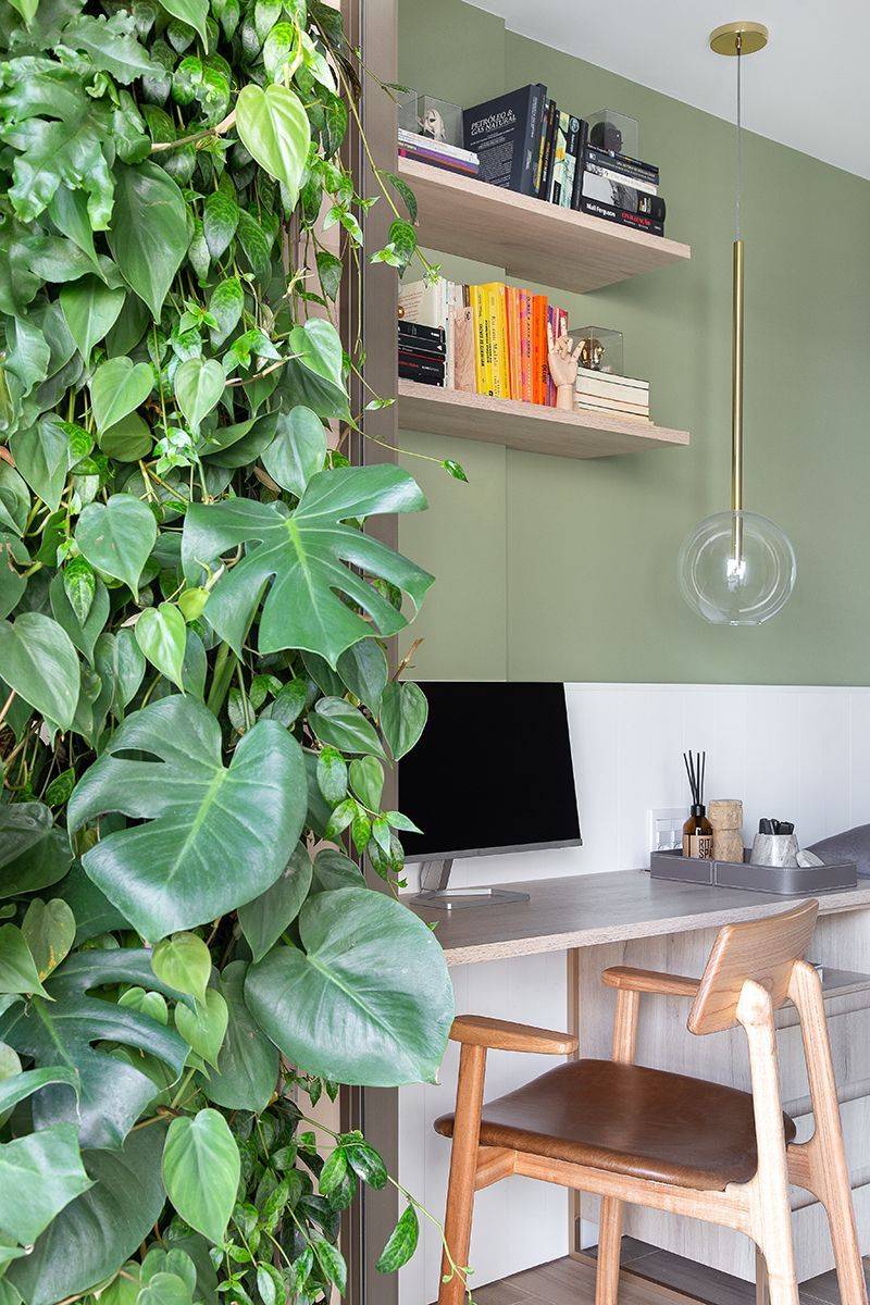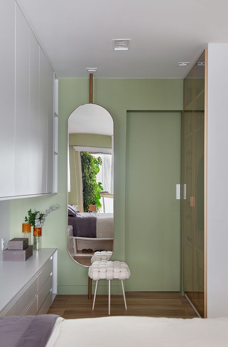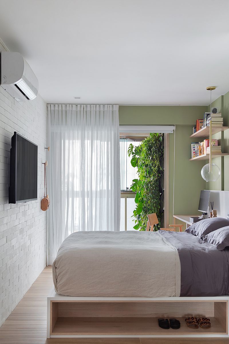 No quarto do casal, a tinta verde aplicada nas principais paredes é uma solução simples e de baixo custo que fez toda a diferença no resultado final. Já a combinação do revestimento em tijolinho claro na parede da tv com a marcenaria branca e a cortina de linho branco ajudou a suavizar a paleta cromática do espaço, ao mesmo tempo que acrescentou diferentes texturas. Outros destaques deste cômodo são o espelho giratório alongado ao lado da porta de entrada, fixado no piso e no teto, e o jardim vertical da varanda.