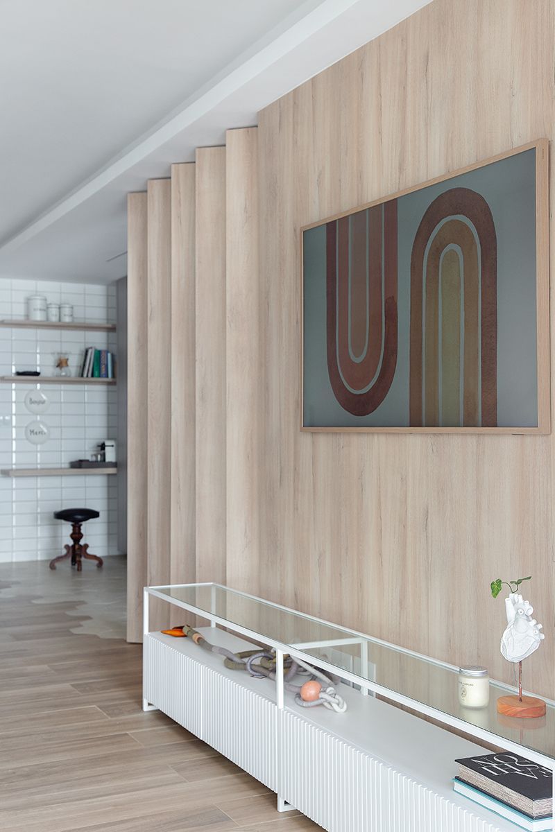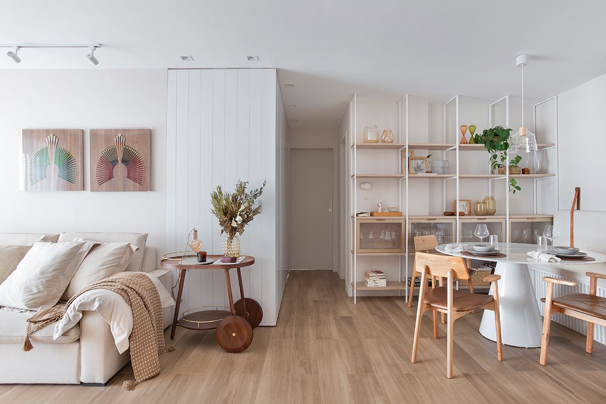 Brises verticais giratórios foram instalados entre a sala e a cozinha, não só para oferecer privacidade e controle da luz natural, quando necessário, como também para criar uma conexão visual elegante entre os espaços. Na sala, destacam-se também os painéis de parede de marcenaria, ora em lambri branco ora em melanina amadeirada, alguns móveis de madeira e detalhes em couro natural caramelo.