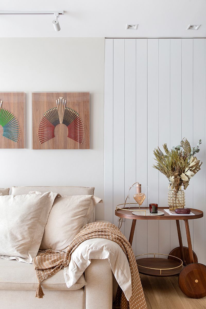 Na decoração, que segue o estilo contemporâneo com pitadas de bo-ho, algumas peças de valor afetivo já faziam parte do acervo do casal e foram aproveitados no novo lar, a exemplo do banquinho antigo de madeira, o vaso de vidro exposto no carrinho-bar, os quadros da sala acima do sofá e a escultura Nuvem com Balanço, da designer Nara Ota. Entre os móveis novos, na área social ela destaca as cadeiras, o carrinho-bar Moon e a estante que vai do piso ao teto.