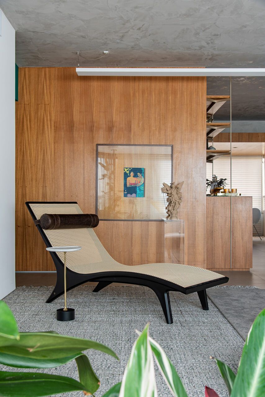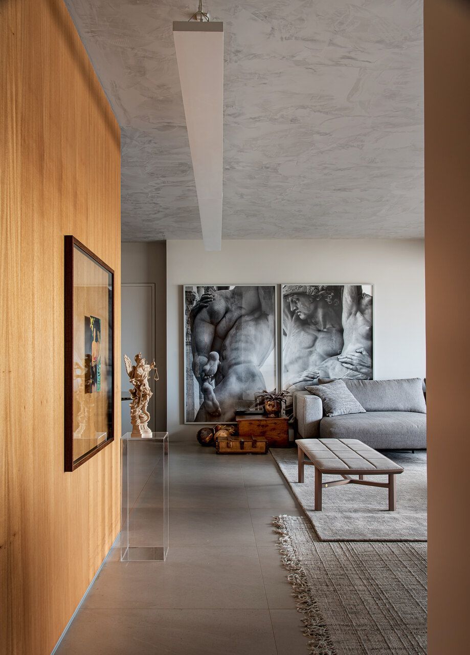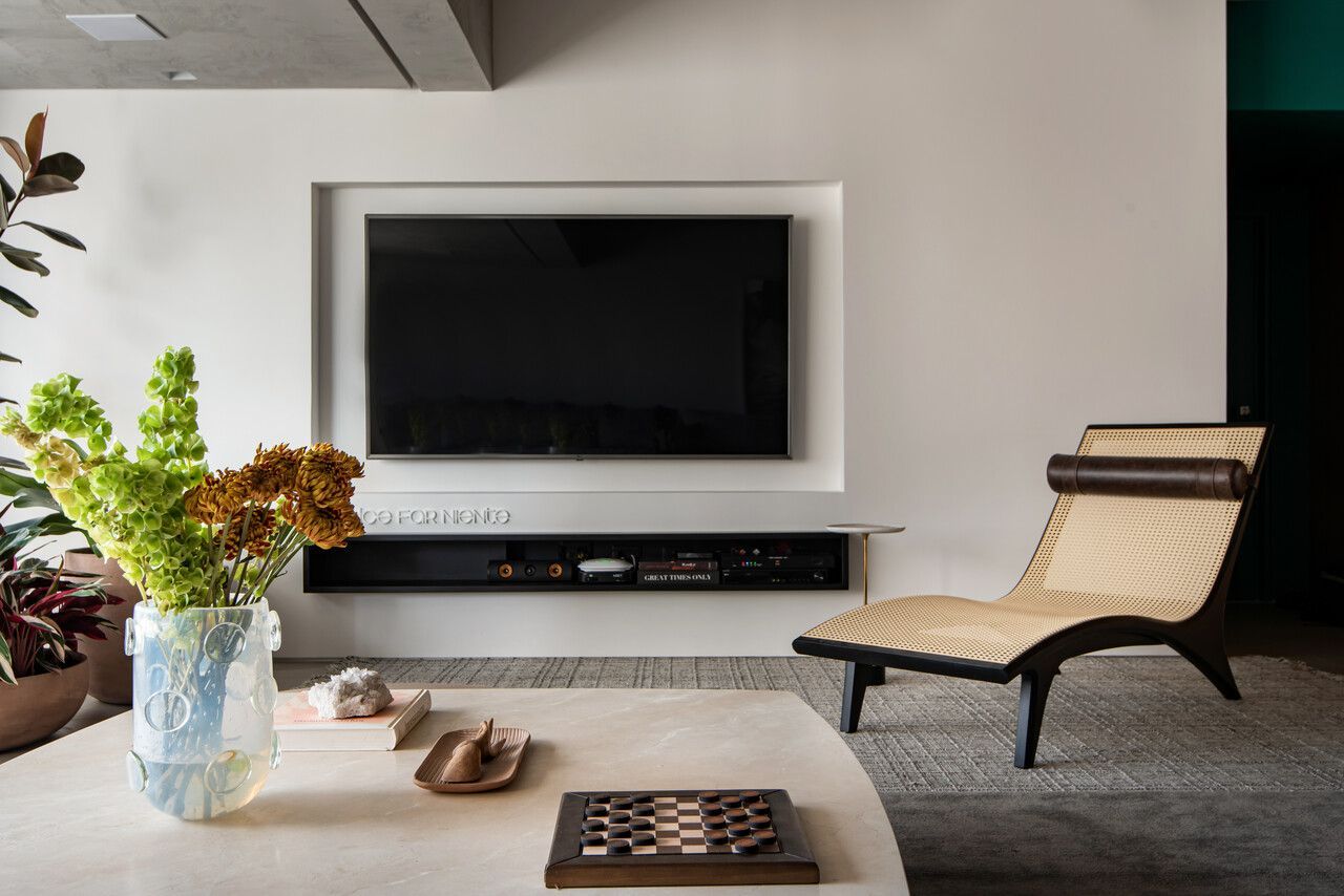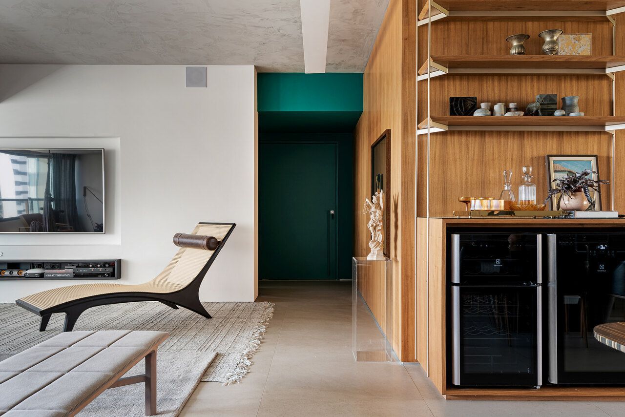 Ela é designer visual e ele é escultor. Casal jovem sem filhos se mudando para um apê maior, de 242m² no Horto Florestal, Bahia, pensando em construir família. A ideia era um projeto contemporâneo que não fosse muito casual e nem tão sofisticado. Chegar nesse ponto de equilíbrio foi um desafio para o do escritório Sinta Arquitetura.