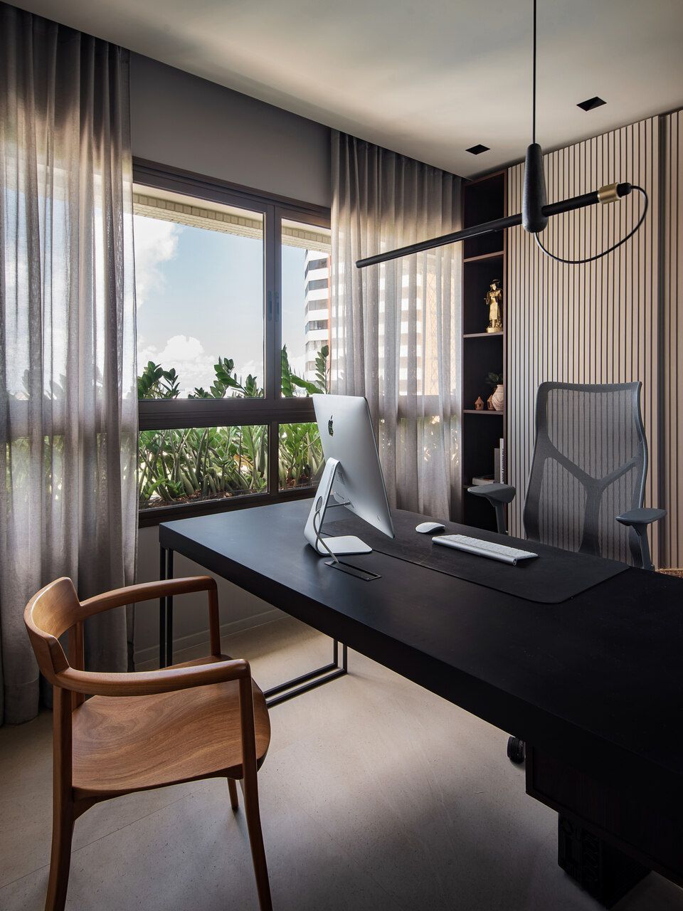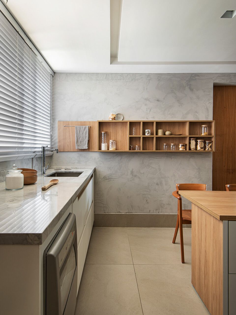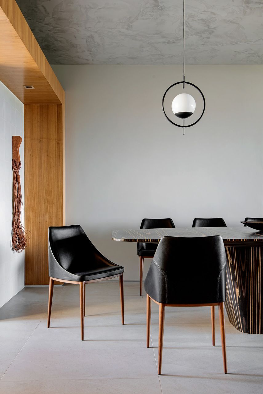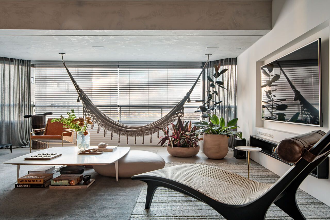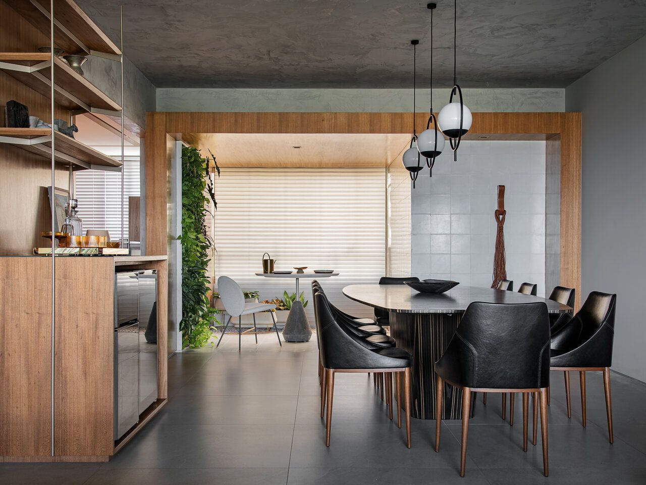 Ela é designer visual e ele é escultor. Casal jovem sem filhos se mudando para um apê maior, de 242m² no Horto Florestal, Bahia, pensando em construir família. A ideia era um projeto contemporâneo que não fosse muito casual e nem tão sofisticado. Chegar nesse ponto de equilíbrio foi um desafio para o do escritório Sinta Arquitetura.