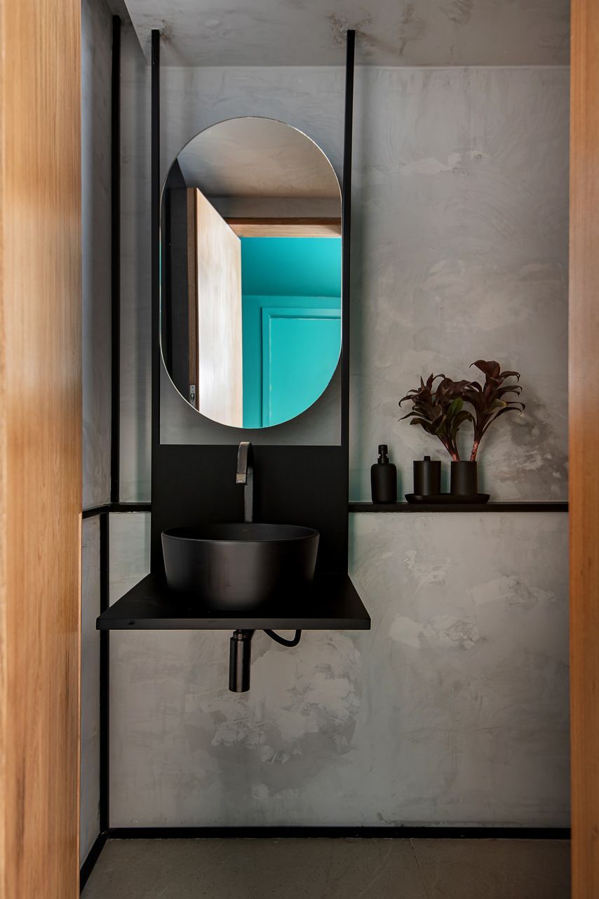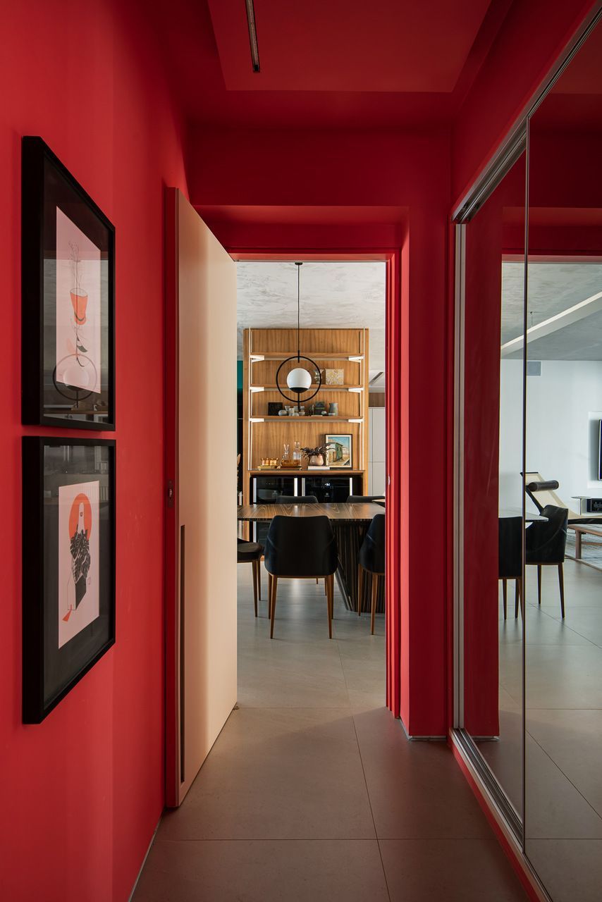 A planta é tradicional: escritório próximo à entrada, junto com lavabo, e a amplitude da sala foi aproveitada para atender o desejo deles de ter uma rede na área social. As cores eram um desejo dos moradores, o verde fechado foi pontuado no hall de entrada e o tom melancia no hall íntimo. A maioria das peças eram dos moradores, algumas de família outras de viagens. Além disso, o projeto tem muitos garimpos feitos pela internet.