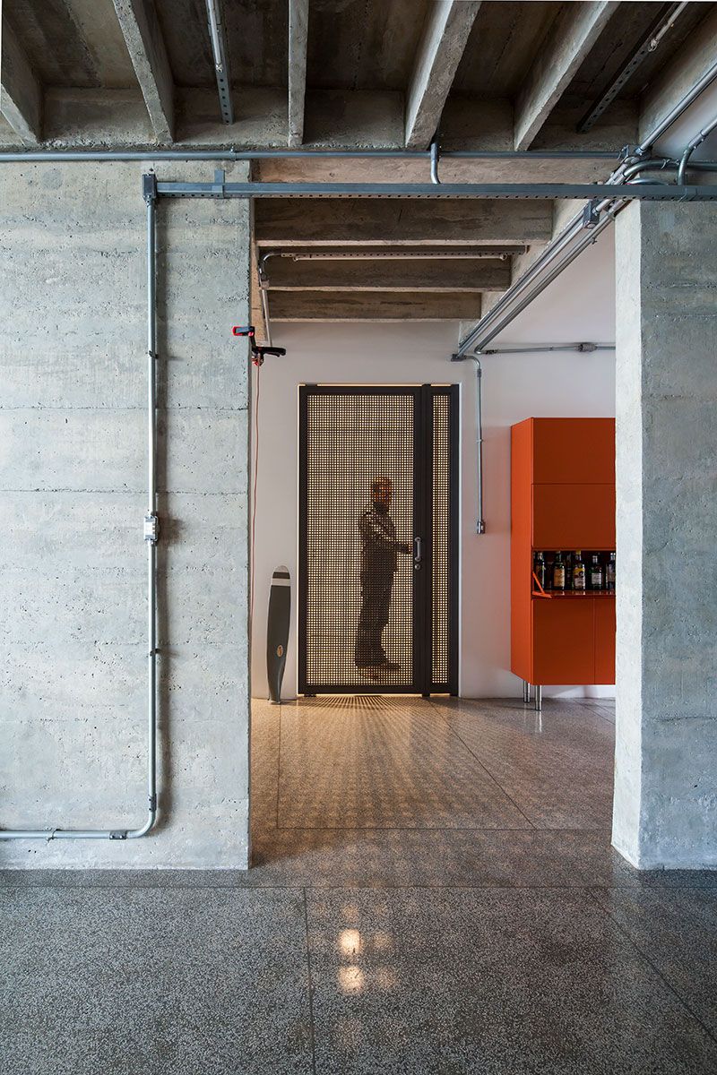 As paredes foram descascadas e o concreto foi exposto, mostrando as marcas de madeira da concretagem. O forro de gesso foi removido evidenciando a solução estrutural do edifício. As instalações elétricas ficaram aparentes em tubos de aço galvanizado, que percorrem o teto e as paredes.