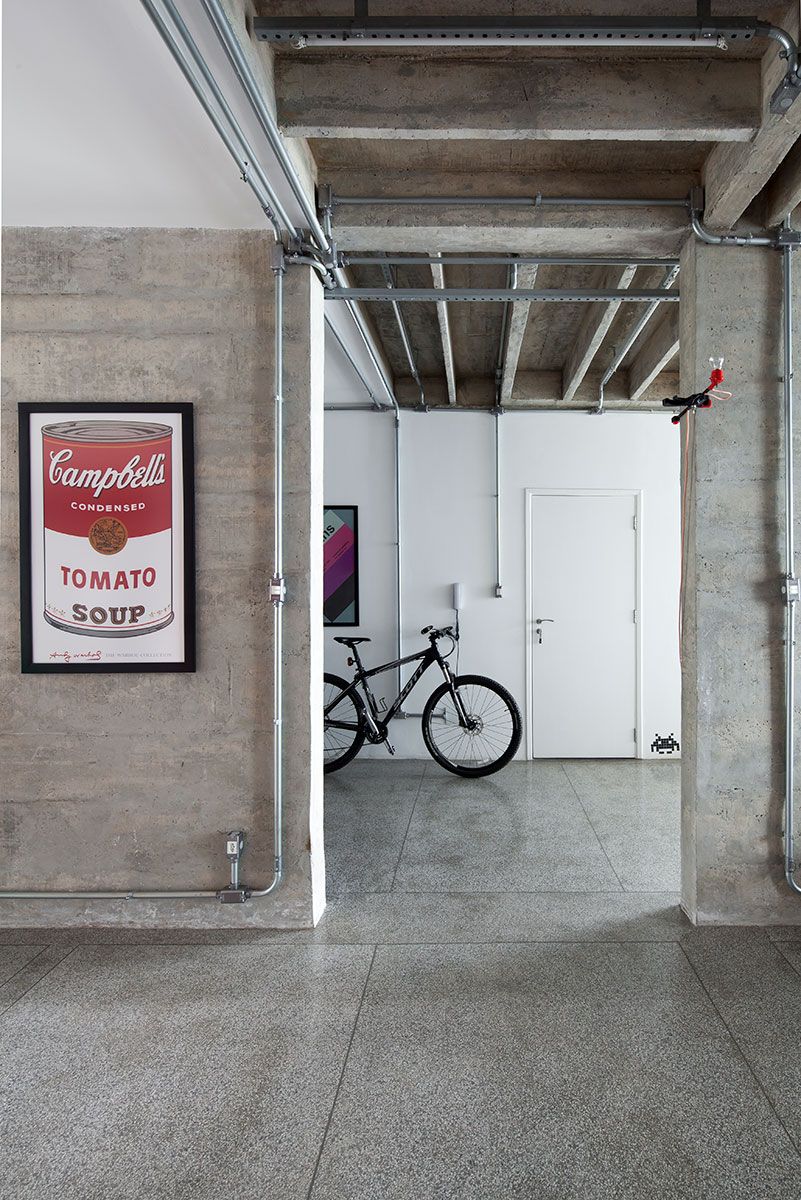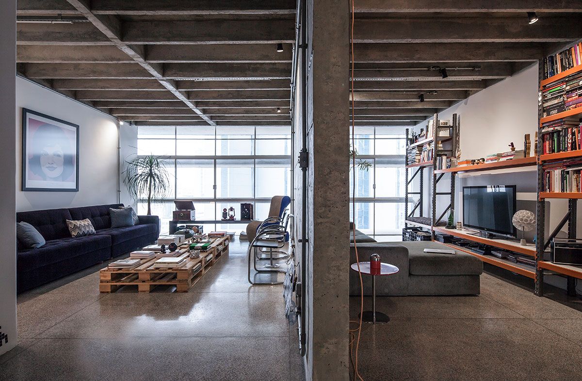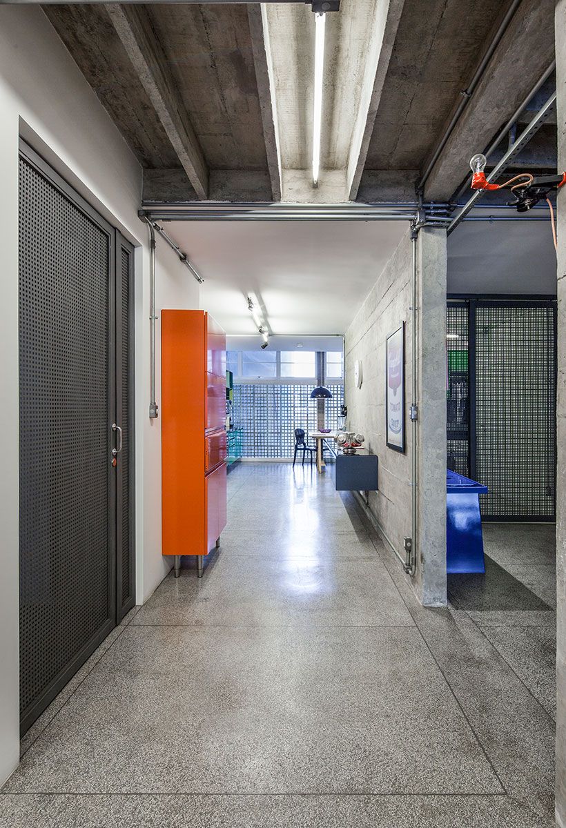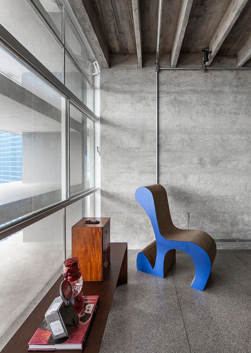 As paredes foram descascadas e o concreto foi exposto, mostrando as marcas de madeira da concretagem. O forro de gesso foi removido evidenciando a solução estrutural do edifício. As instalações elétricas ficaram aparentes em tubos de aço galvanizado, que percorrem o teto e as paredes.