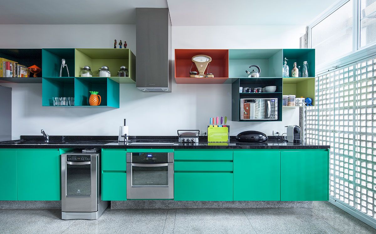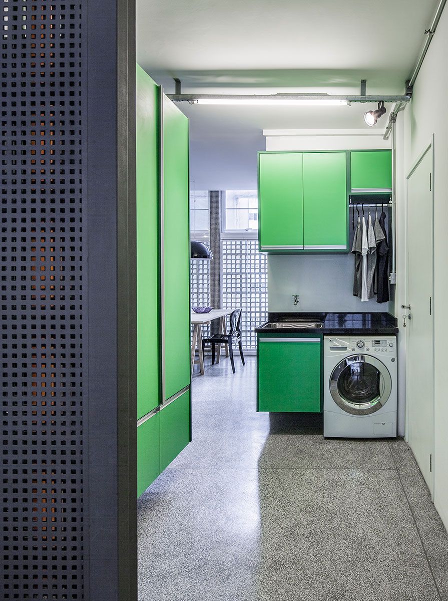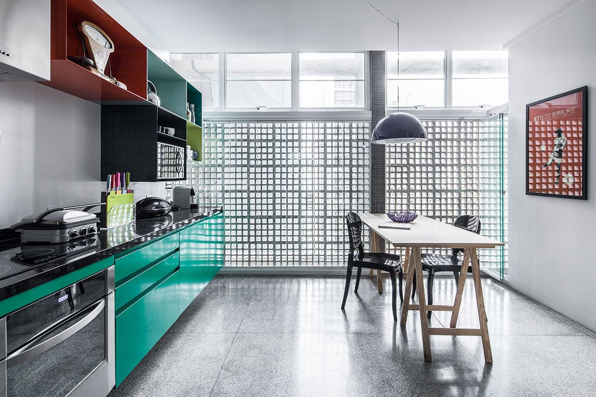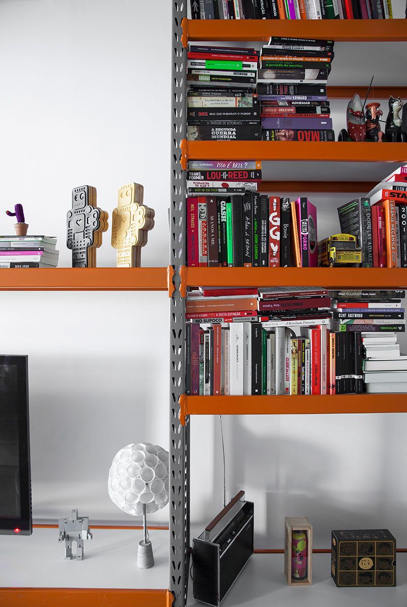 A linguagem informal é reforçada nos interiores, na estante montada em estrutura de aço, e na cozinha, com os armários de aço com pintura colorida. A lavanderia, nos fundos, ocupa a área deixada pelo antigo quarto de serviço e é integrada à cozinha. Separando estes espaços, um portão de chapa metálica perfurada que confere mais privacidade as áreas. E o banheiro de serviço, no novo projeto, tornou-se um lavabo para o apartamento.