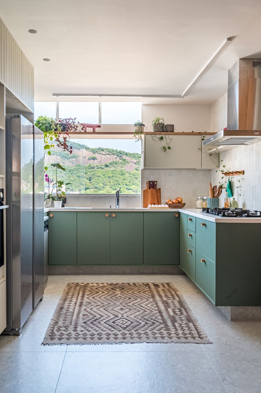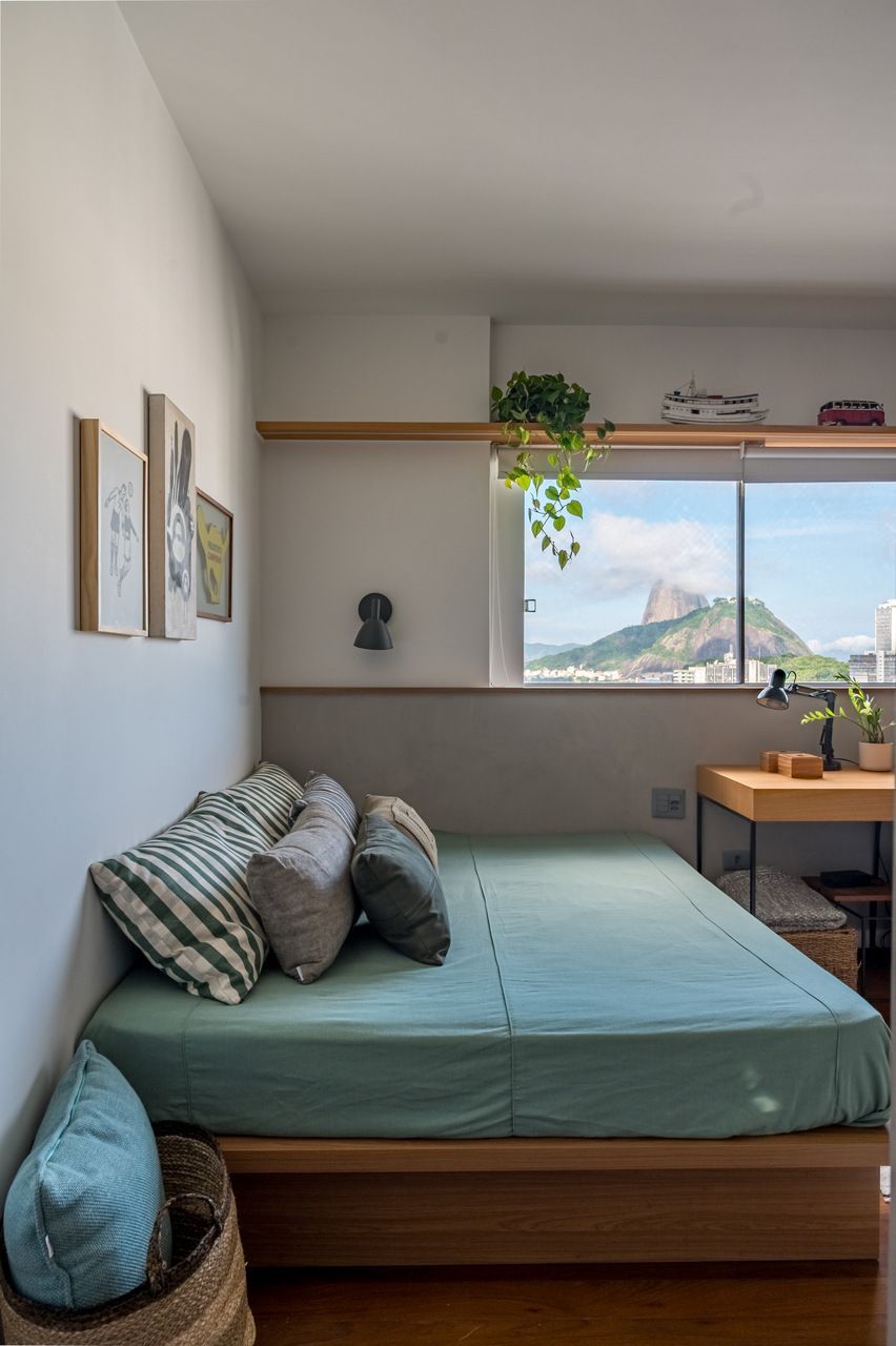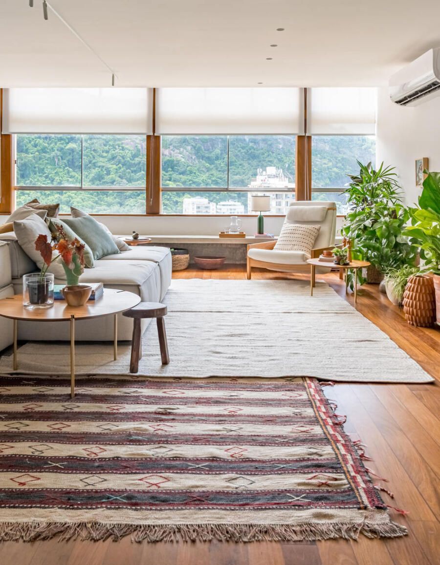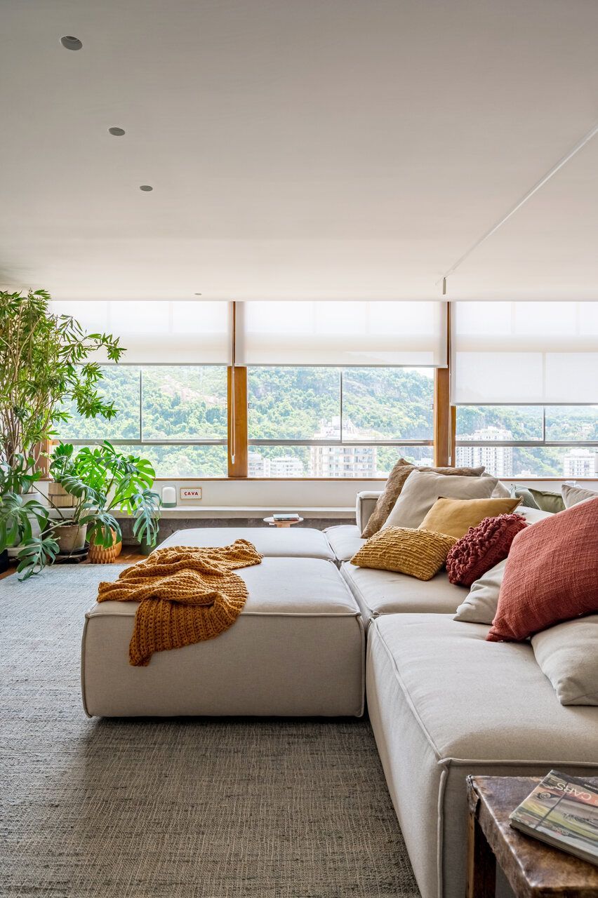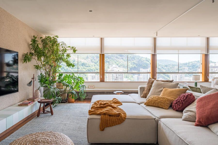 A amplitude dos ambientes e suas grandes janelas garantem iluminação natural abundante, enquadrando a vista privilegiada para a paisagem natural do Rio de Janeiro. A paleta de cores foi definida a partir de combinações que se complementam, com predominância de tons terrosos articulados ao verde das plantas, criando uma leitura equilibrada entre os elementos.