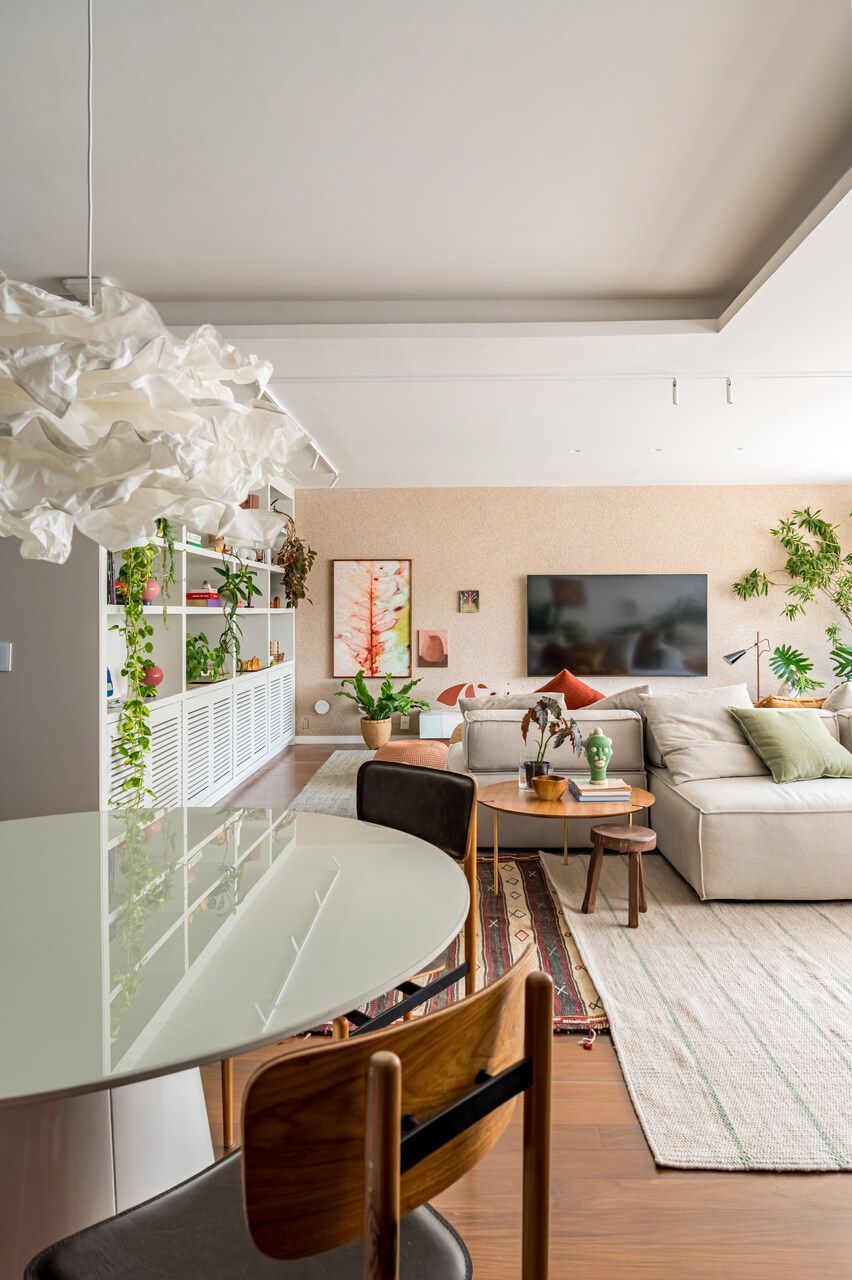 A demolição de paredes foi um recurso central para estabelecer continuidade entre os espaços. A área social ficou mais fluida, com limites mais sutis entre estar, jantar e apoio. O sofá modular assumiu papel estruturador, permitindo diferentes configurações conforme o uso, seja para momentos familiares ou para receber os amigos dos filhos.