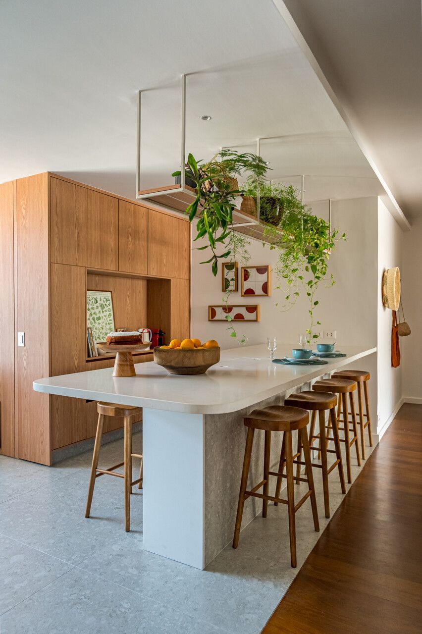 A produção visual, assinada por Simone Ratzik, e o paisagismo de PÁTIO e Anna Luiza Rothier complementam a proposta ao reforçar a integração entre interior e natureza. O resultado é um apartamento com atmosfera leve e planta muito bem resolvida, mantendo elementos essenciais da configuração original enquanto responde às demandas contemporâneas de uso e convivência da família.