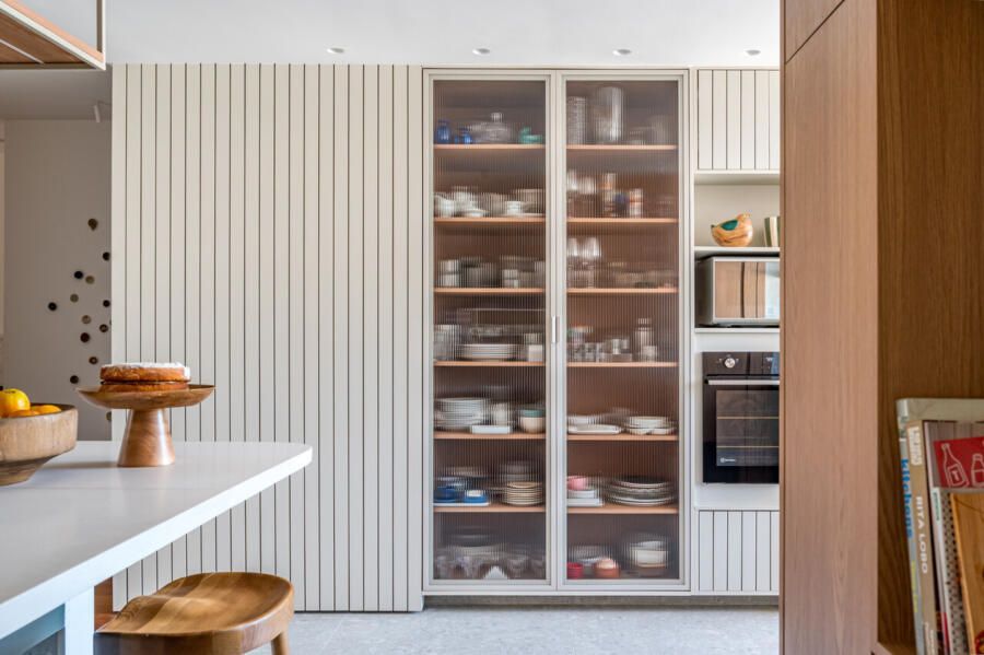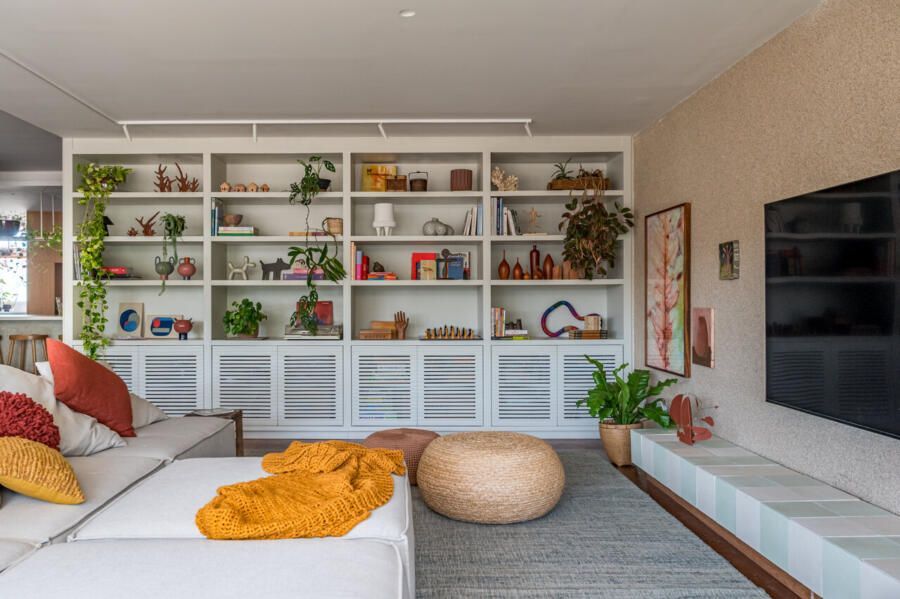 Parte do mobiliário também carrega um valor afetivo. A estante herdada da casa dos pais foi incorporada ao projeto e recebeu acabamento em laca off-white. Objetos e obras distribuídos pelos ambientes funcionam como registros da trajetória da arquiteta.