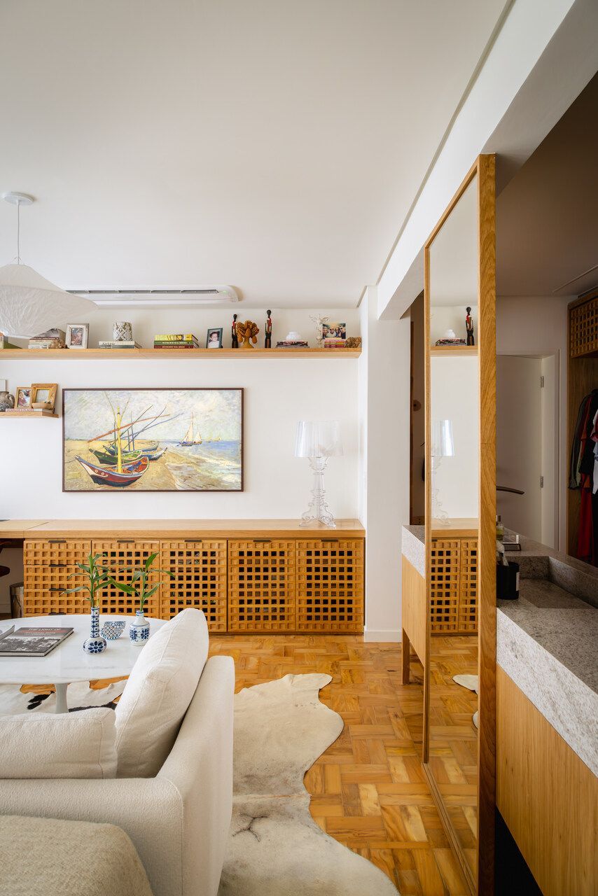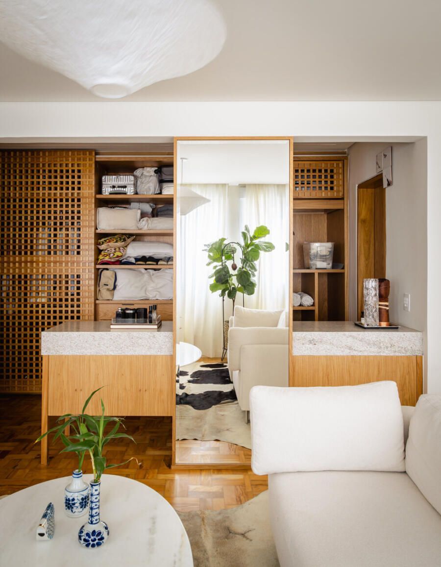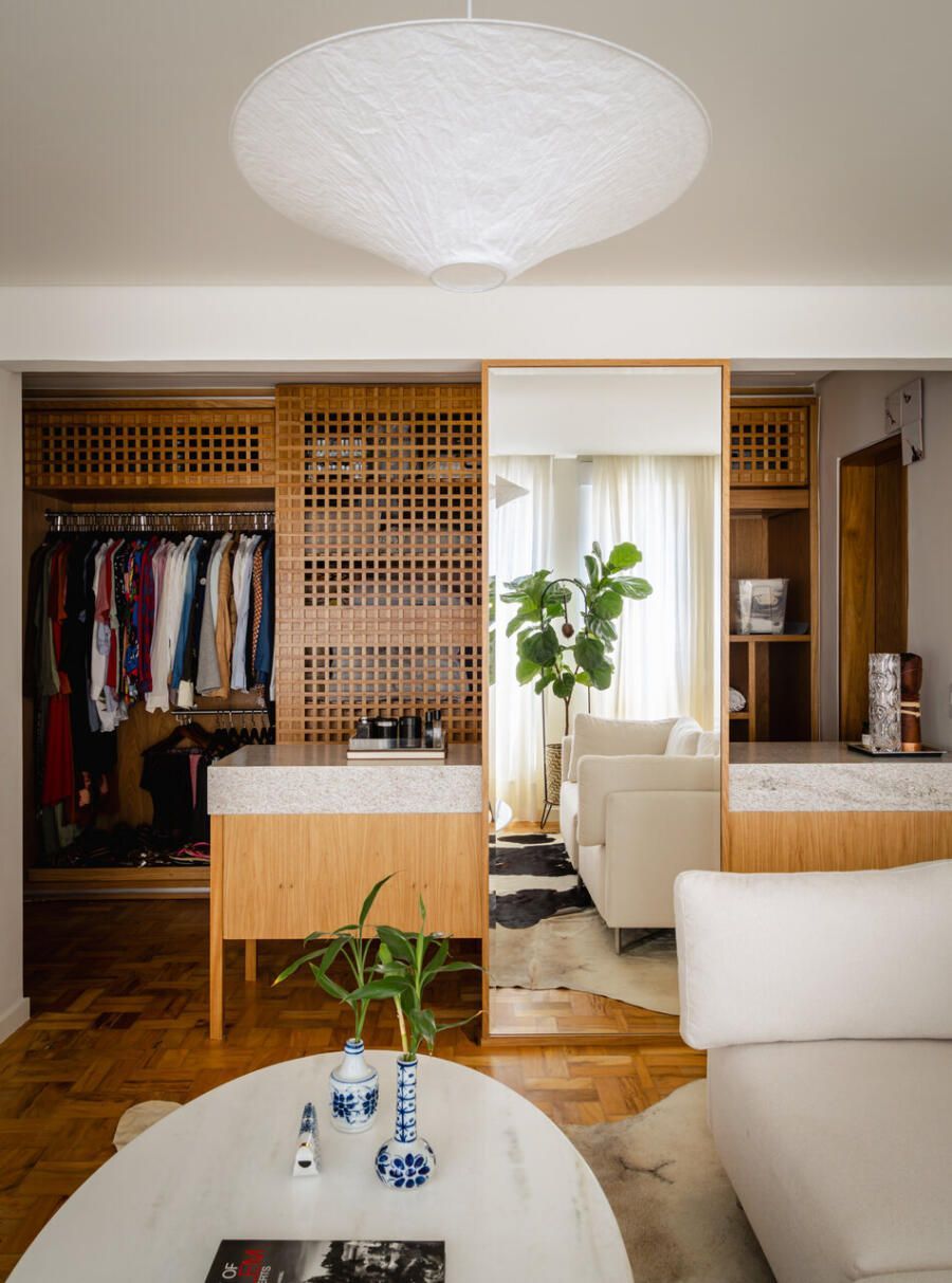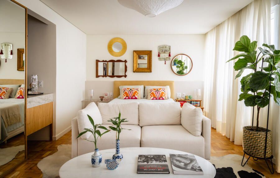Neste apartamento de 80 m² no bairro Consolação, em São Paulo, a proposta do Estúdio Gris Arquitetura foi criar ambientes integrados e bem distribuídos. O layout priorizou dois espaços principais: a sala unificada com a cozinha e uma suíte com múltiplas funções.