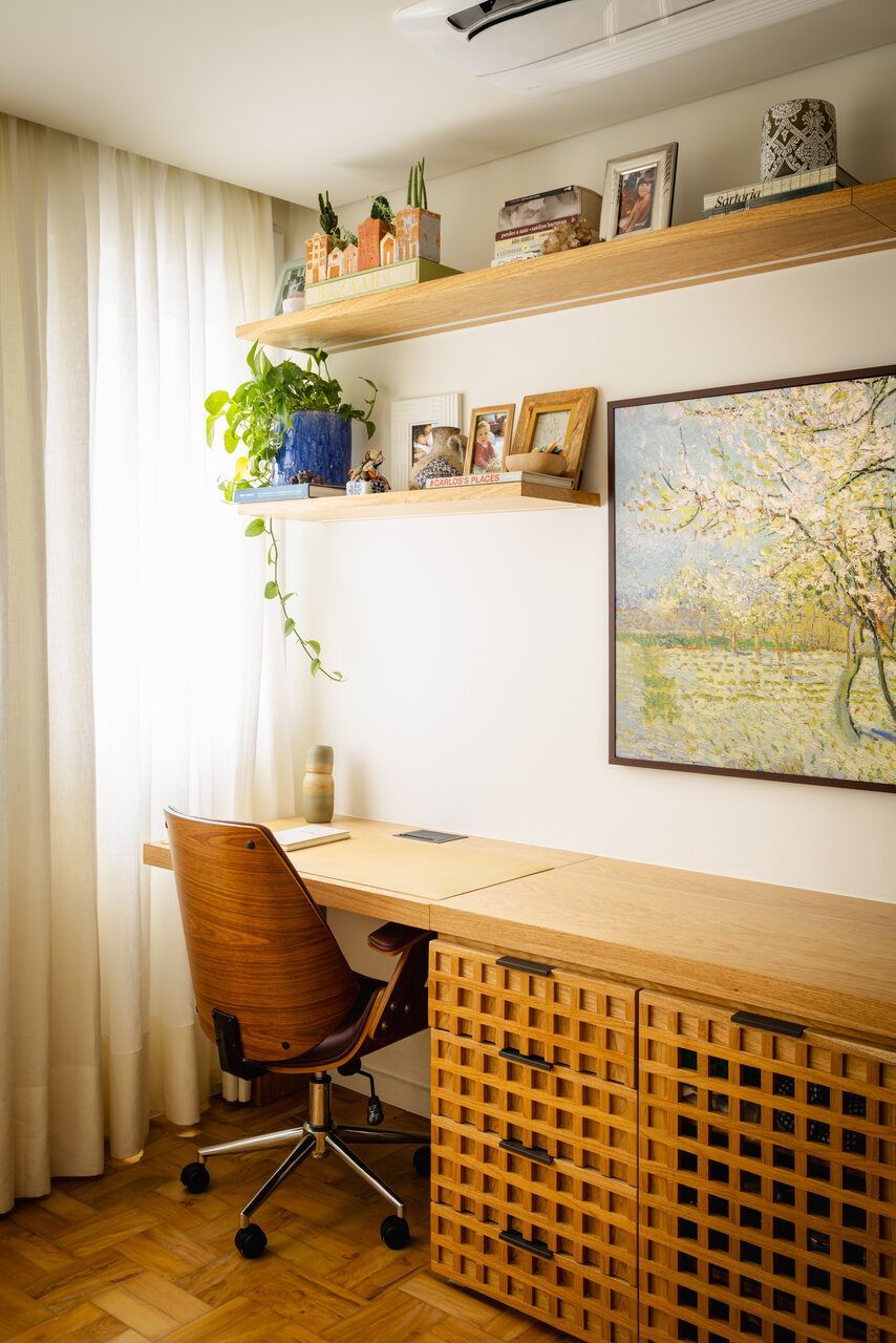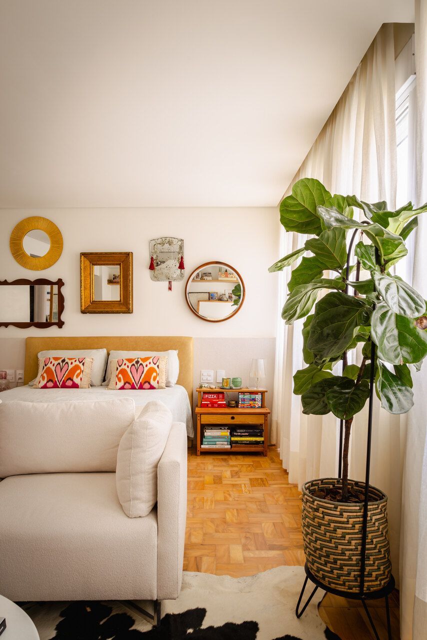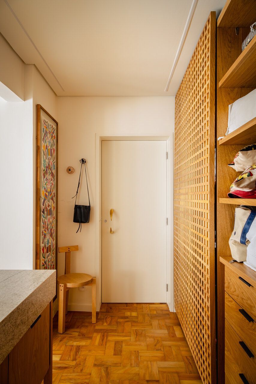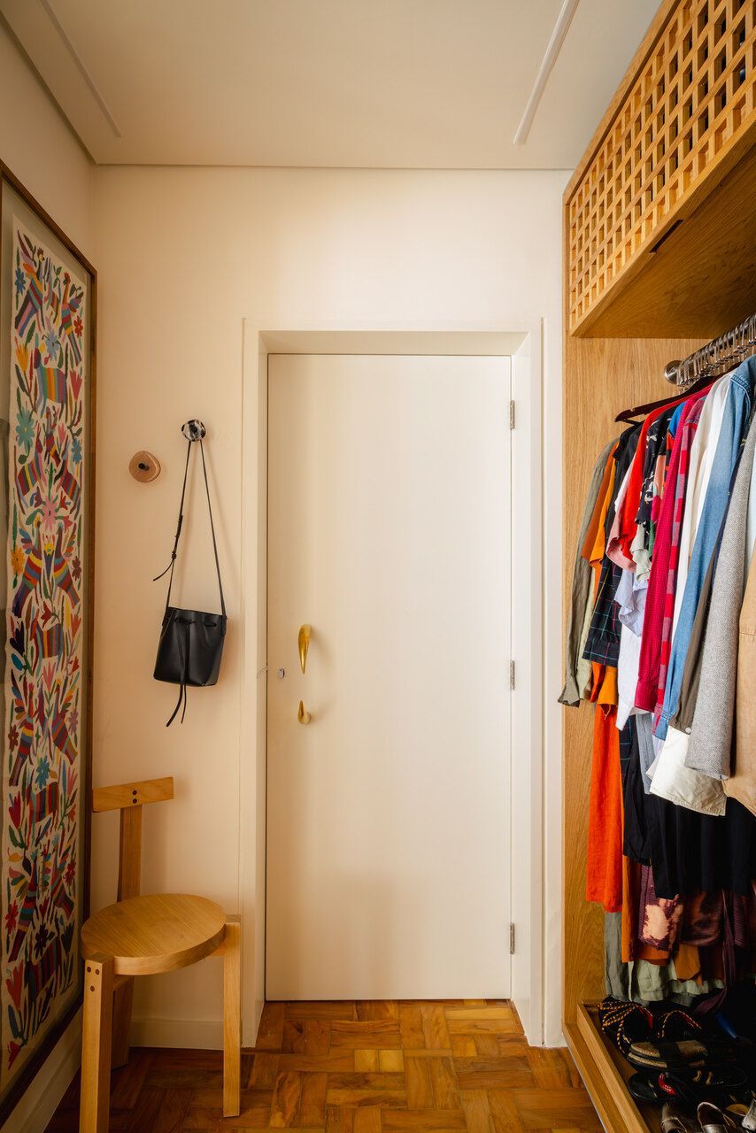 Neste apartamento de 80 m² no bairro Consolação, em São Paulo, a proposta do Estúdio Gris Arquitetura foi criar ambientes integrados e bem distribuídos. O layout priorizou dois espaços principais: a sala unificada com a cozinha e uma suíte com múltiplas funções.