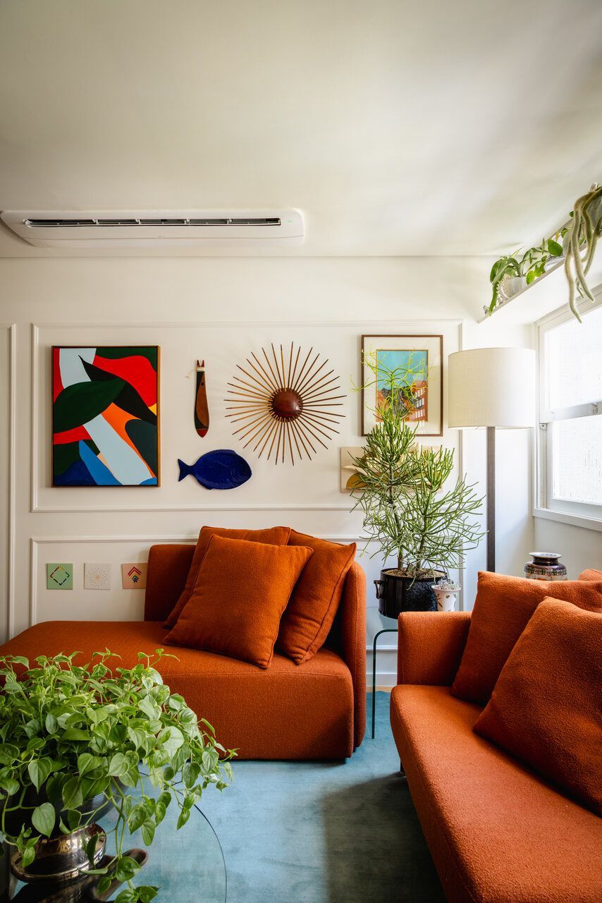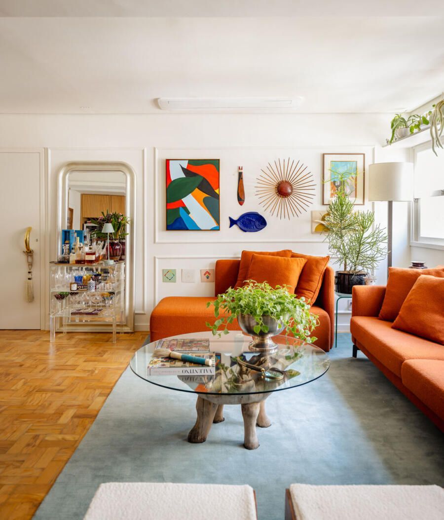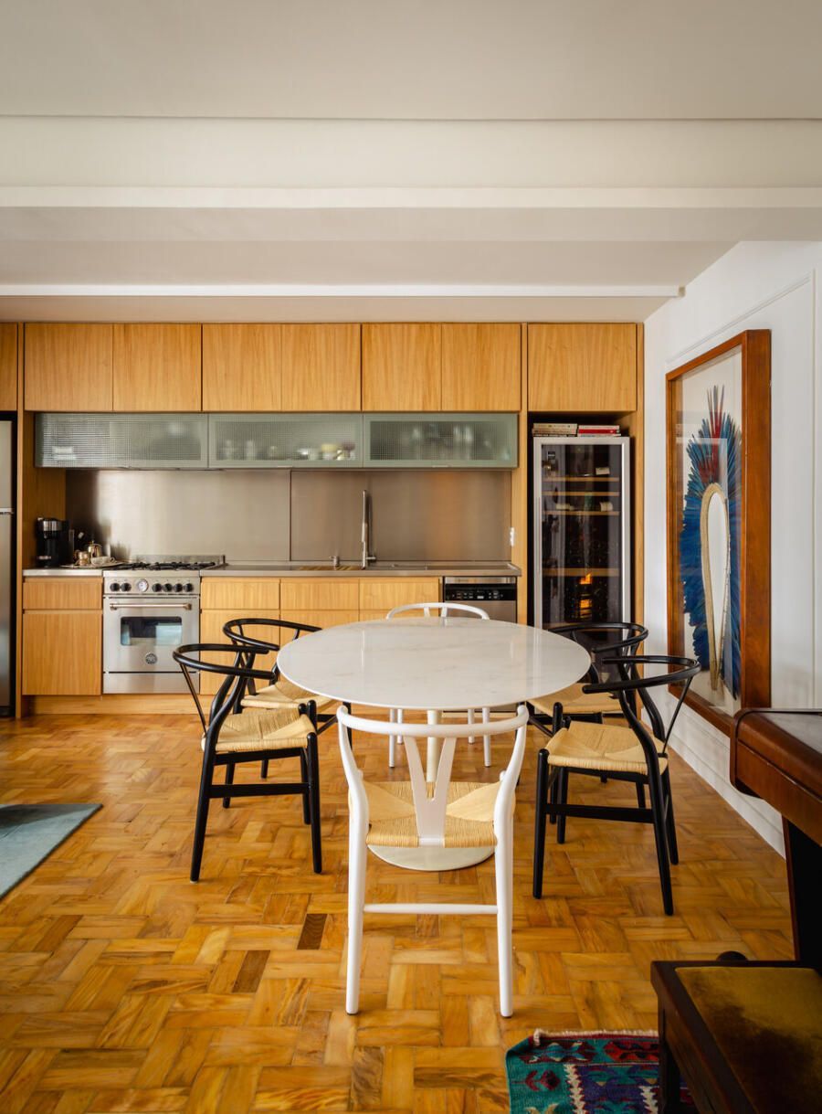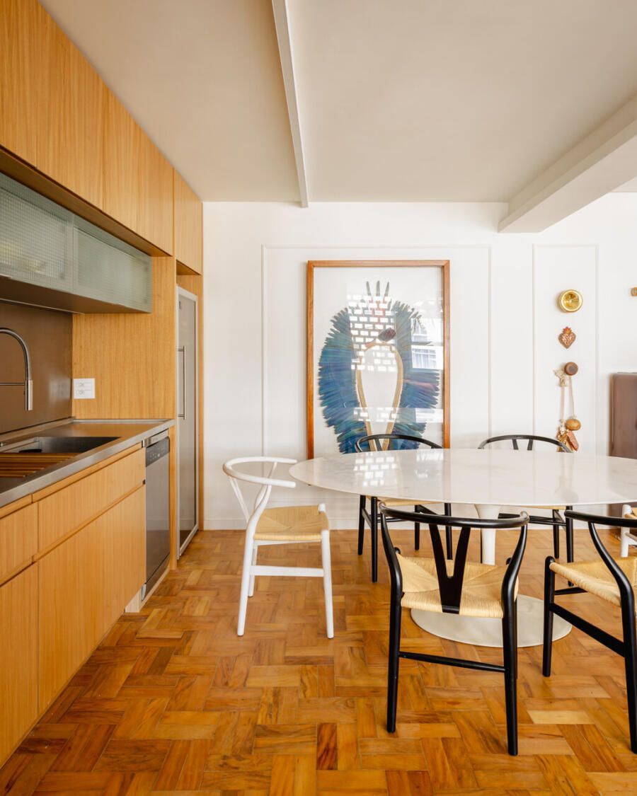 O projeto manteve o piso original em tacos de madeira, que contrasta com o inox da cozinha, trazendo um equilíbrio entre elementos antigos e atuais. No mobiliário, foram usados sofás e tapete com cores vivas, e as boiseries nas paredes servem como base neutra para as obras de arte do morador.