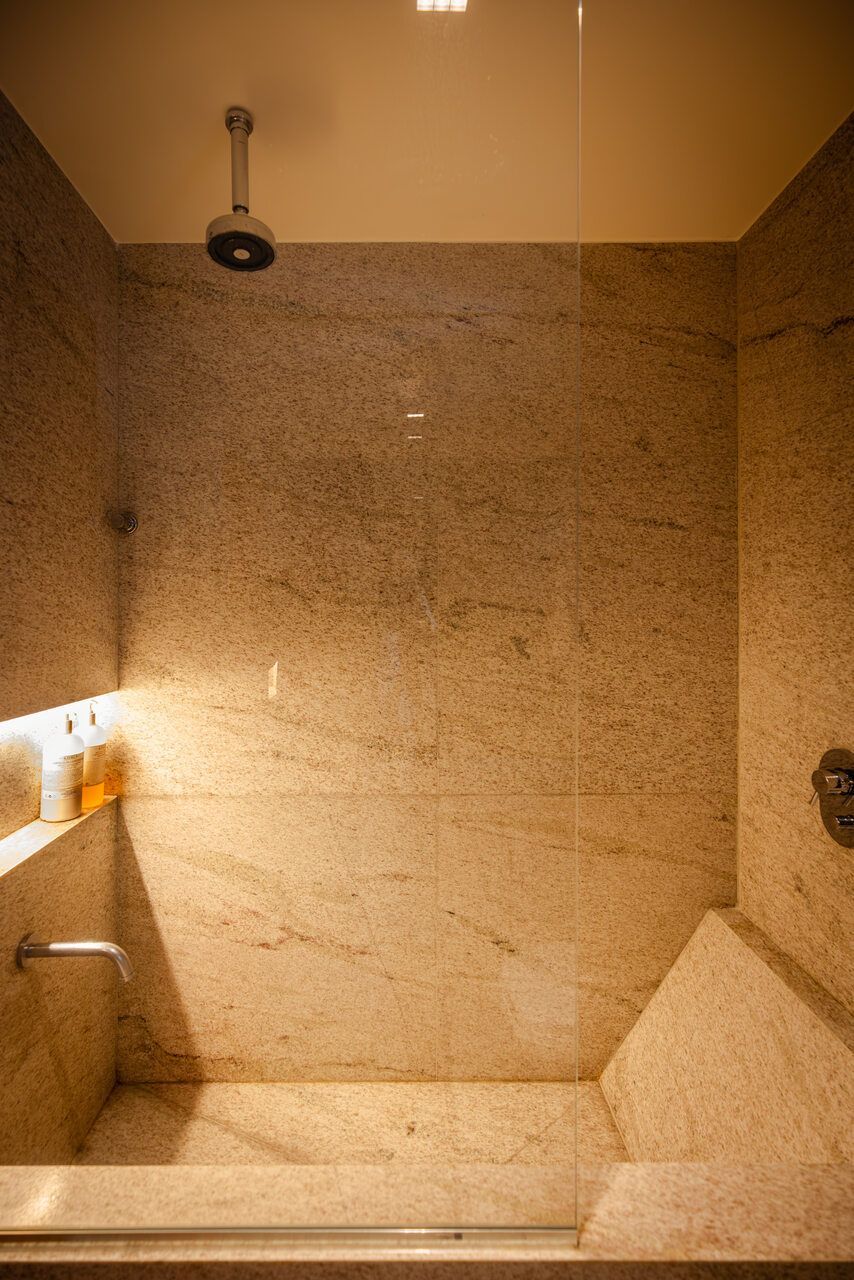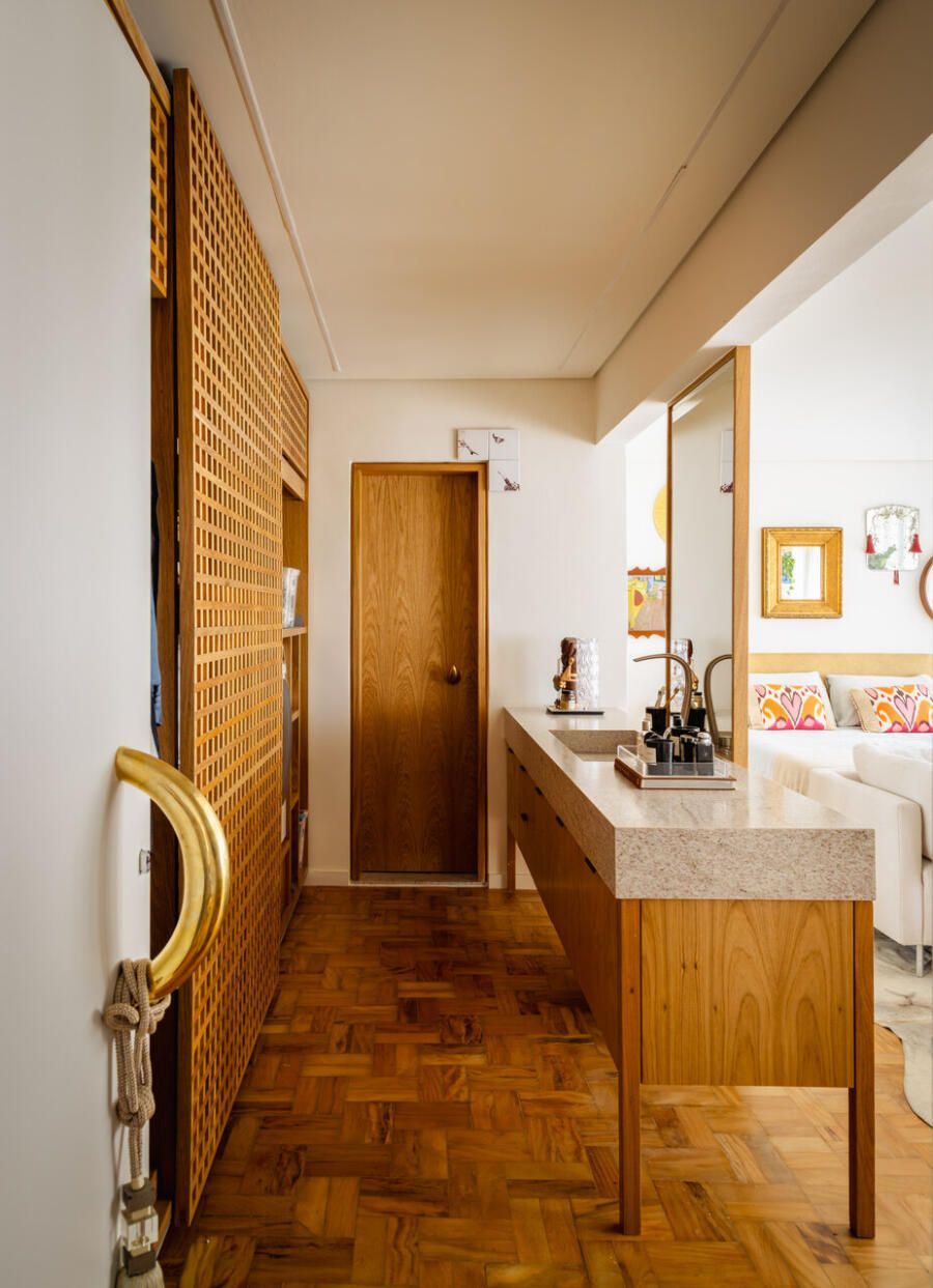 A área íntima foi pensada para atender diferentes usos. A suíte é ampla e inclui espaço para home office, TV e closet. O closet também abriga uma lavanderia compacta e uma bancada longa de banheiro. O box e o sanitário ficam em uma área reservada, que conta ainda com uma banheira feita em granito.