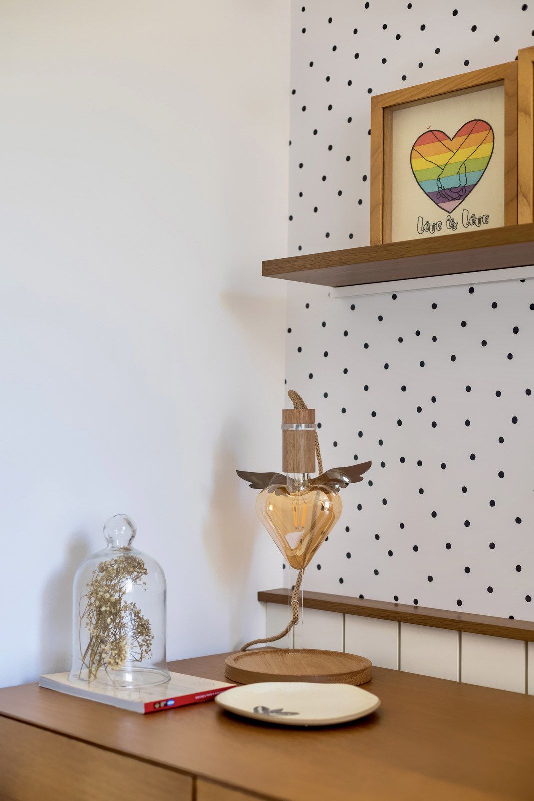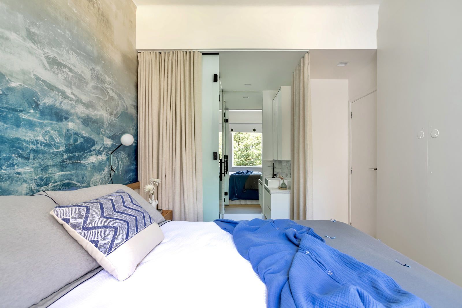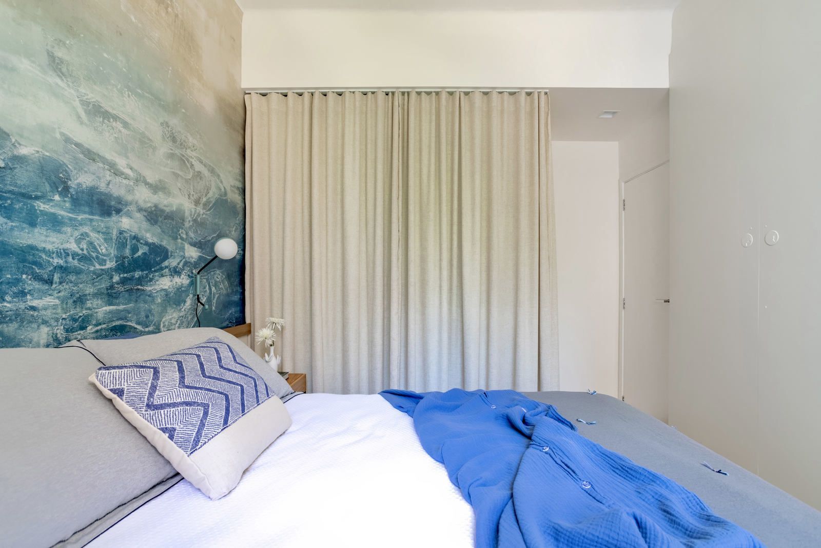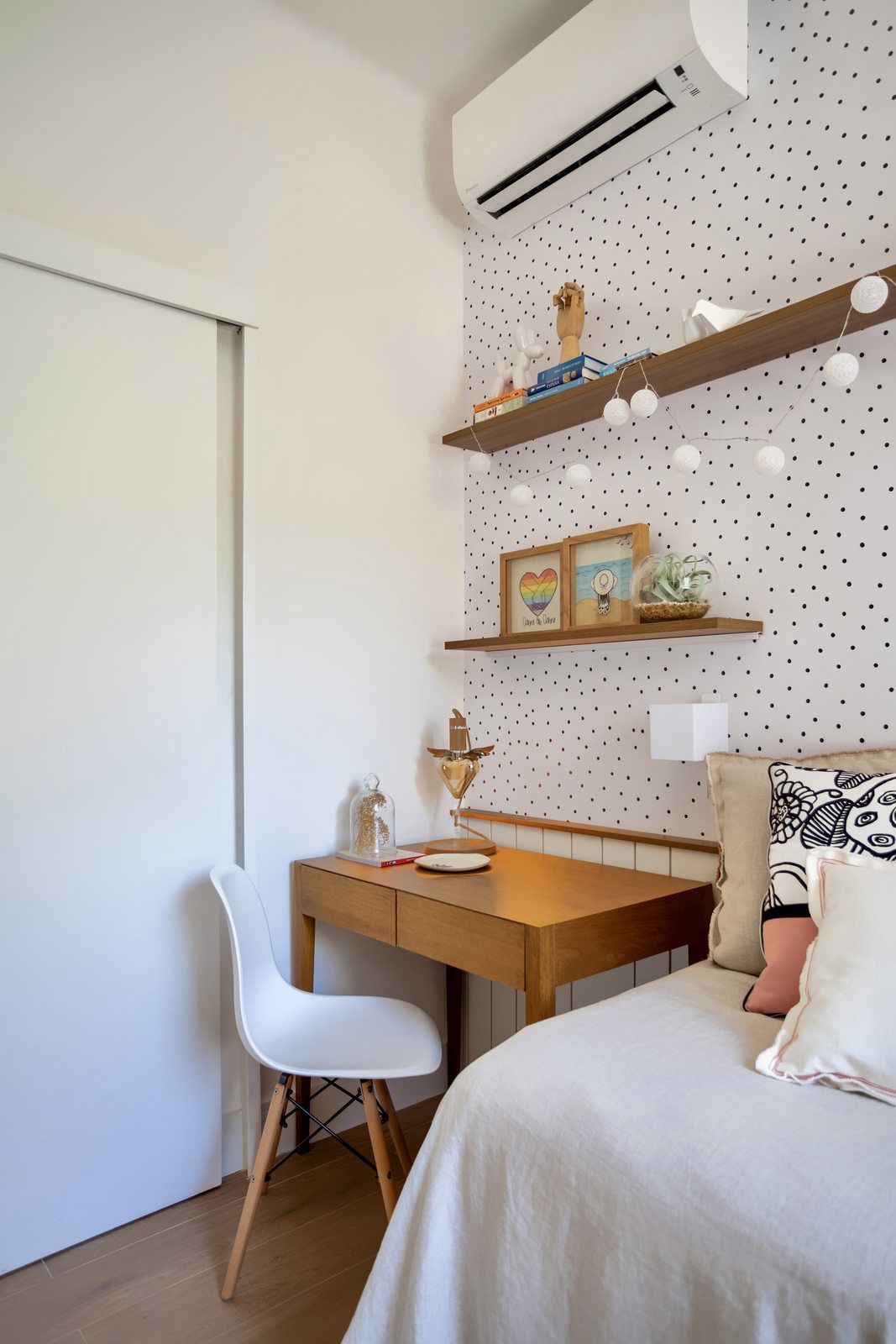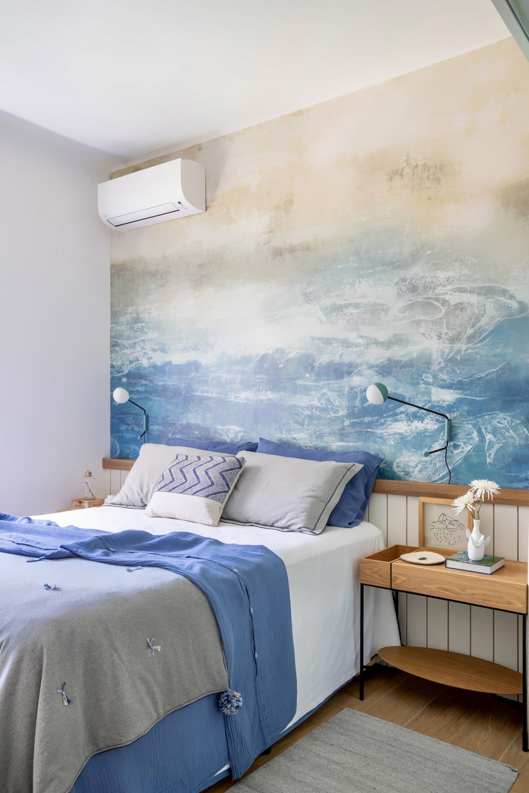 “A ideia era transformar o pequeno apartamento em uma casa de veraneio perto da praia usando materiais práticos, leves e cores claras que traduzissem o espírito carioca. O papel de parede do quarto do casal, em tons de azul, por exemplo, nos conecta imediatamente com a ideia de mar e tranquilidade.”