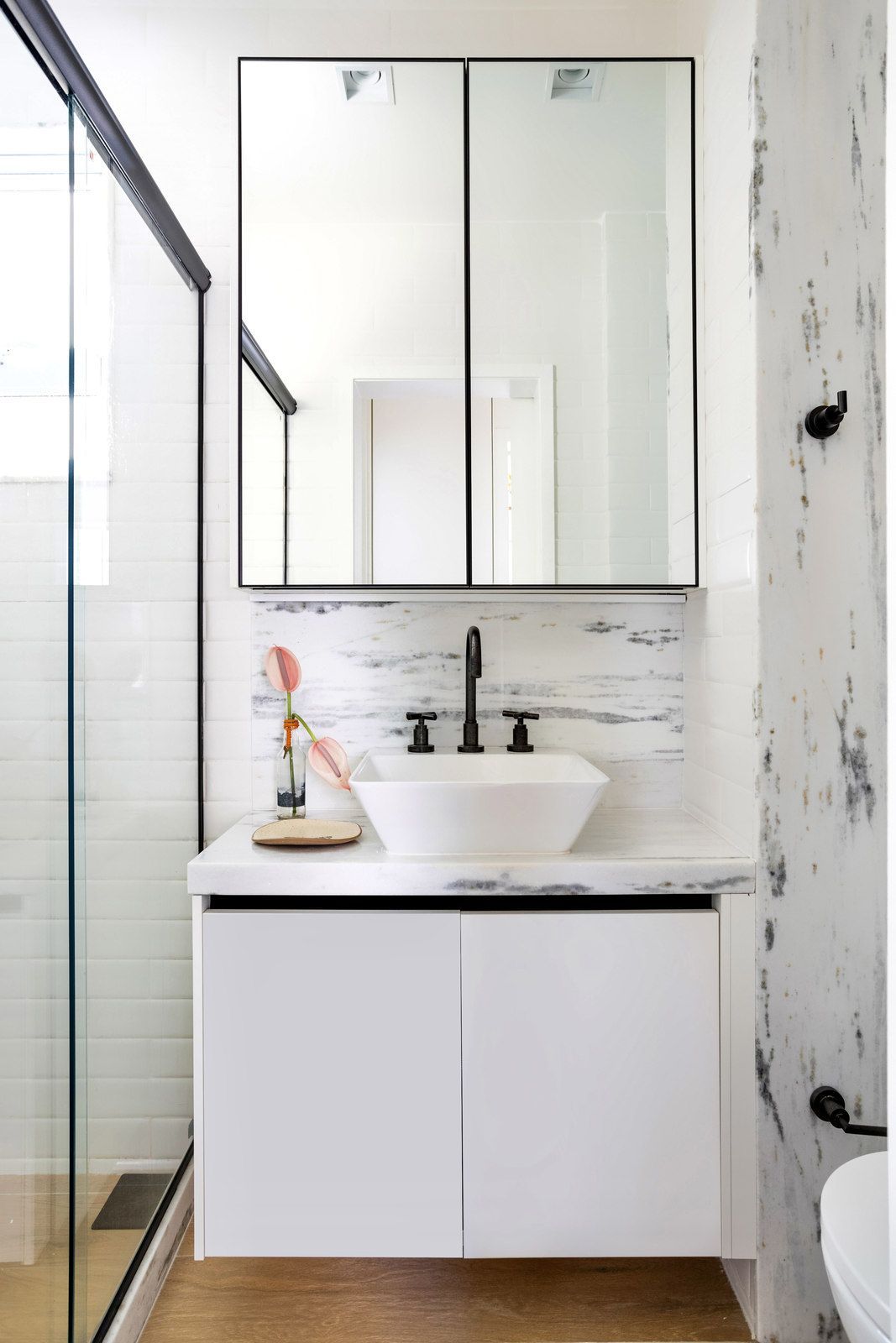 “Fechando a porta social com um painel de madeira onde a mesa de jantar está encostada, conseguimos transformar a antiga porta de serviço em social, e assim, ganhar mais espaço. Também integramos a suíte master com o banheiro, separando os ambientes apenas por uma cortina. A parede que dividia os quartos foi eliminada e substituída por armários para guardar roupas.”