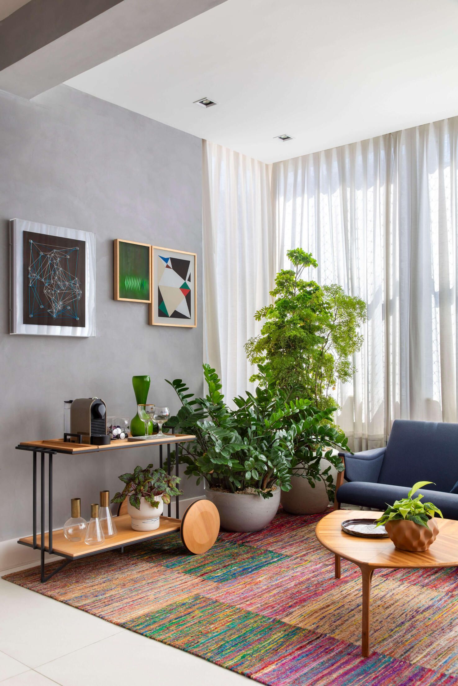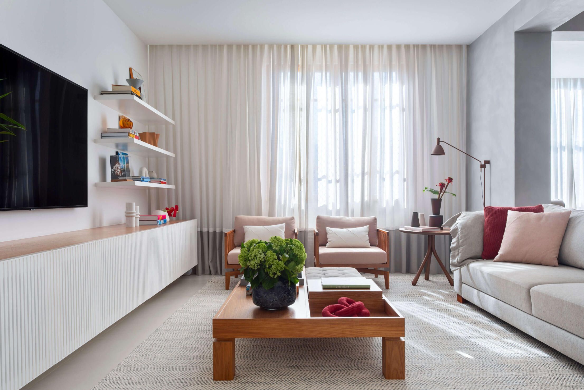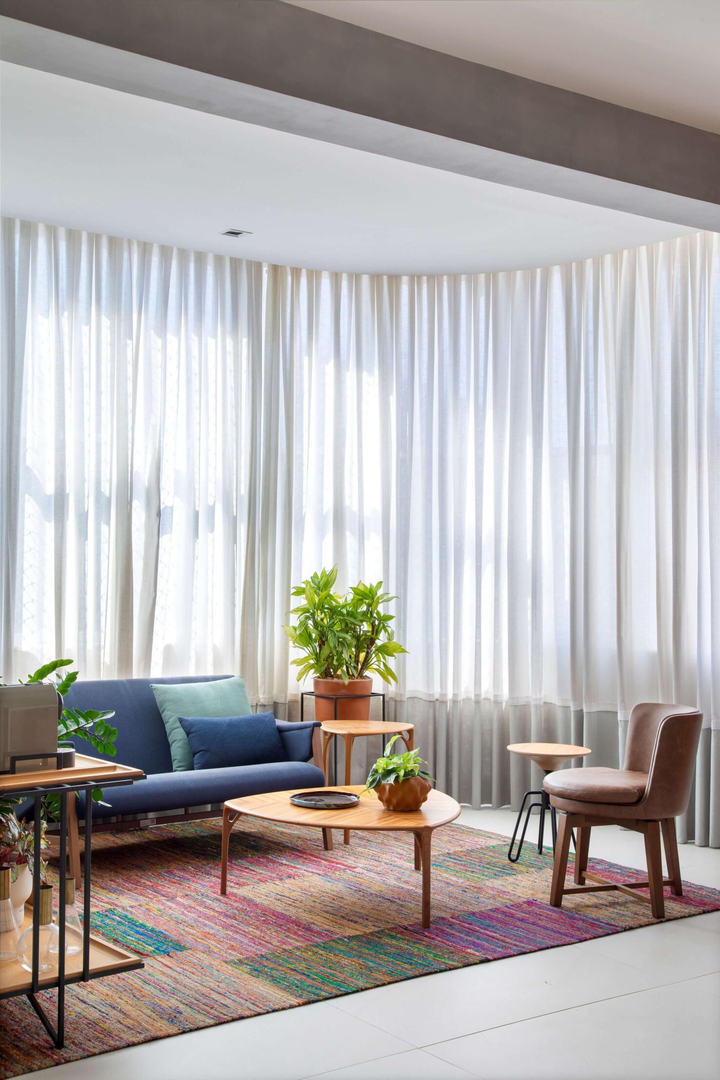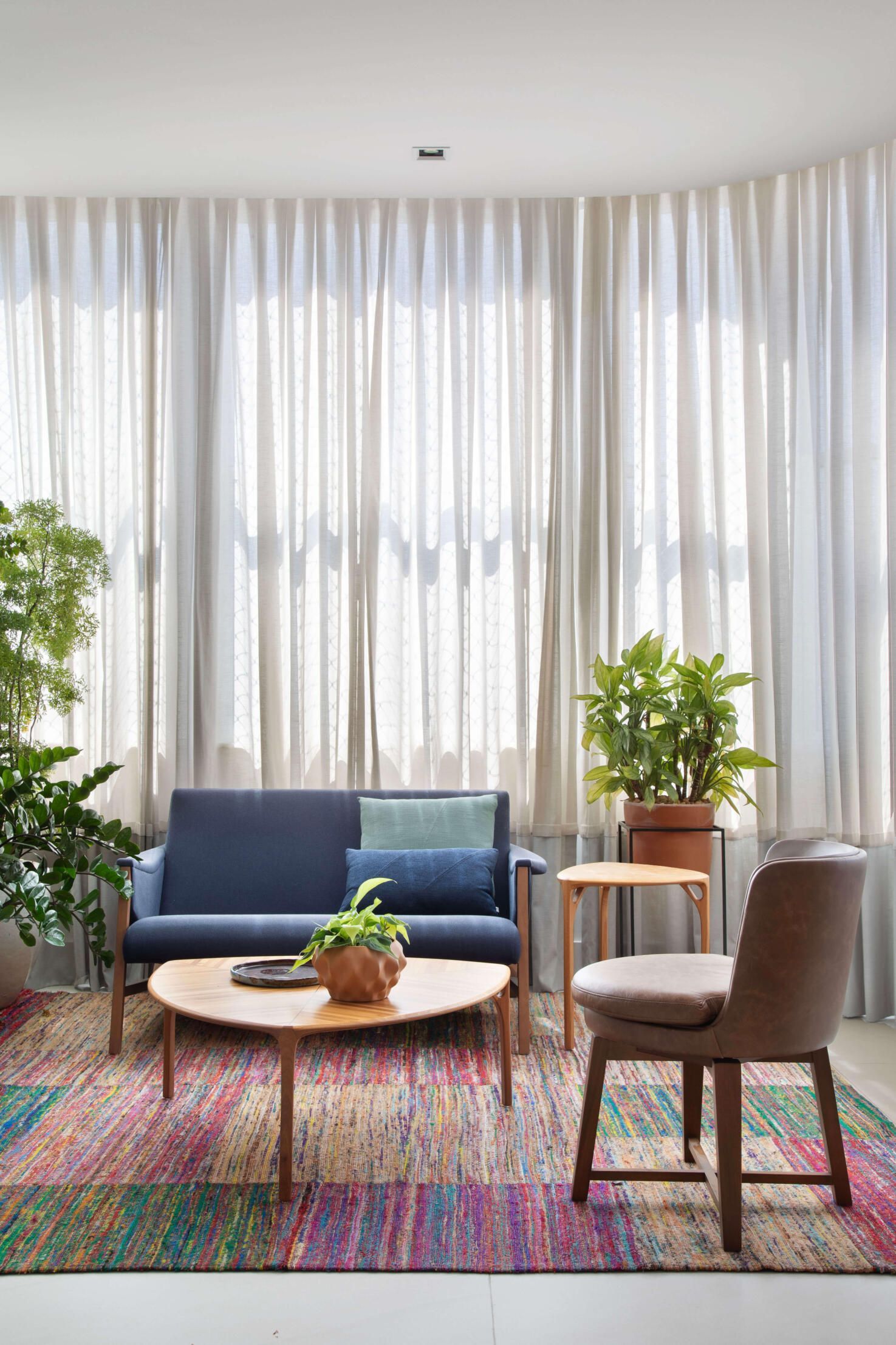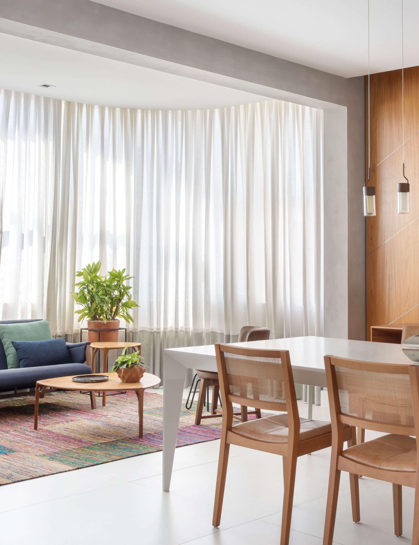 No quesito paleta de cores e materiais, na área social, a arquiteta adotou uma base neutra, em tons de cinza, para destacar algumas peças de mobiliário, como as poltronas em linho rosa antigo, a namoradeira em tecido azul marinho e o tapete multicolorido do lounge, feito com resíduos de seda da Casa Julio.
